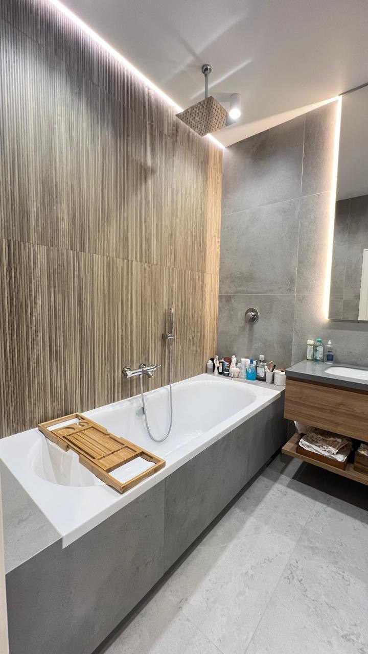 Санузел с ванной и большим зеркалом — всё продумано для комфортного проживания!