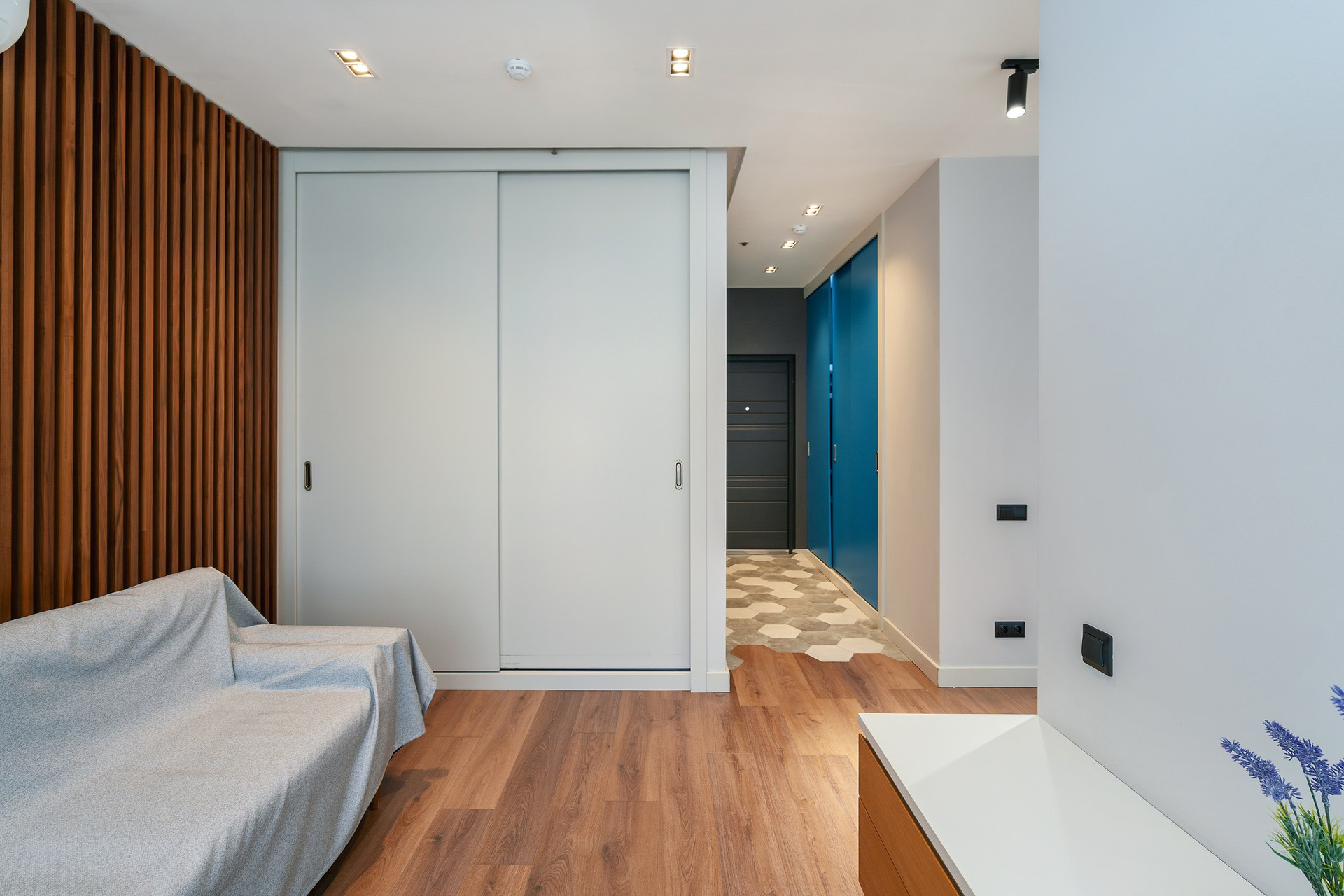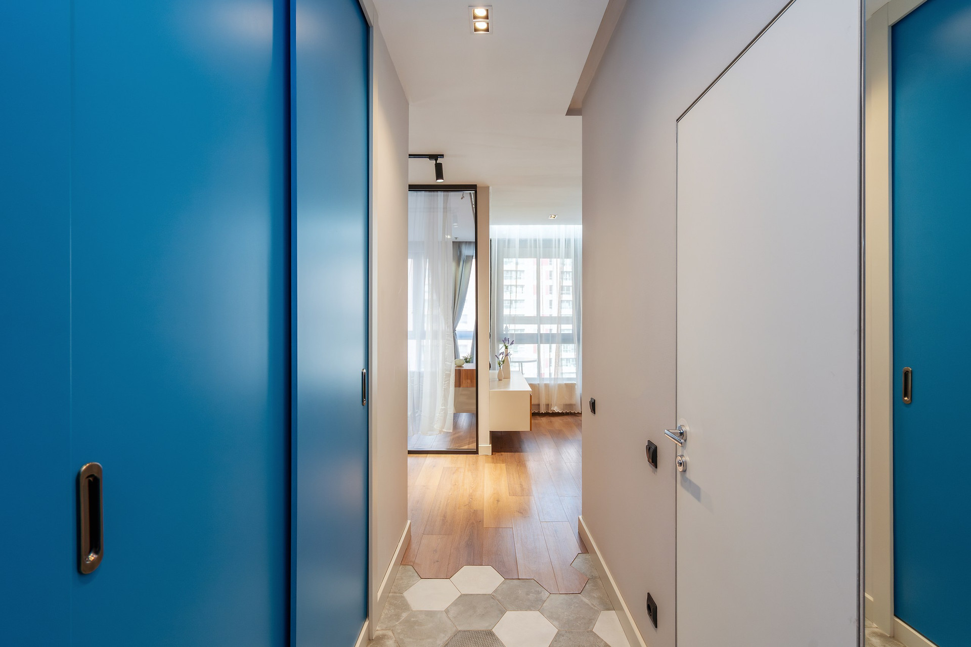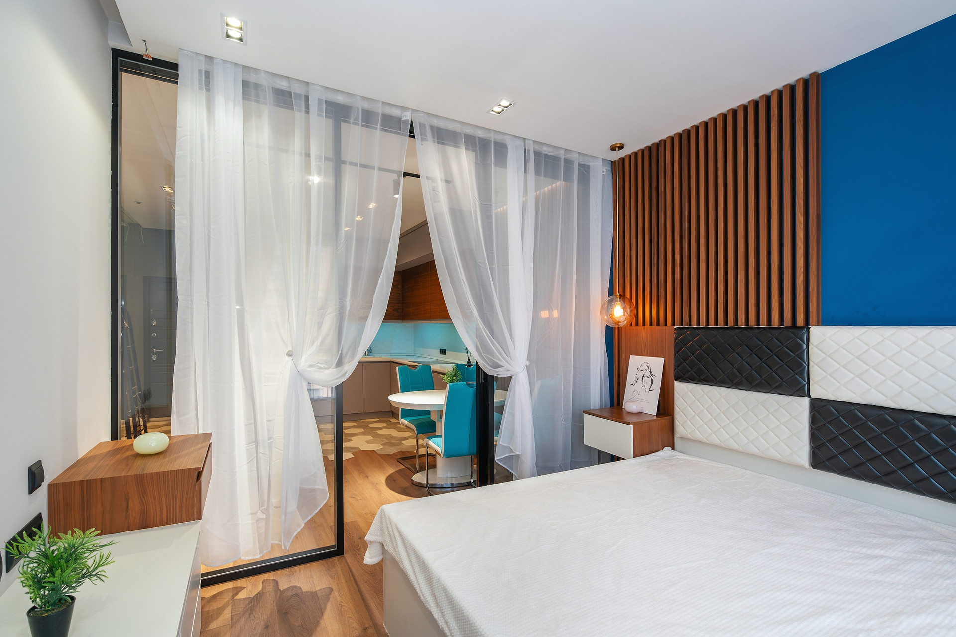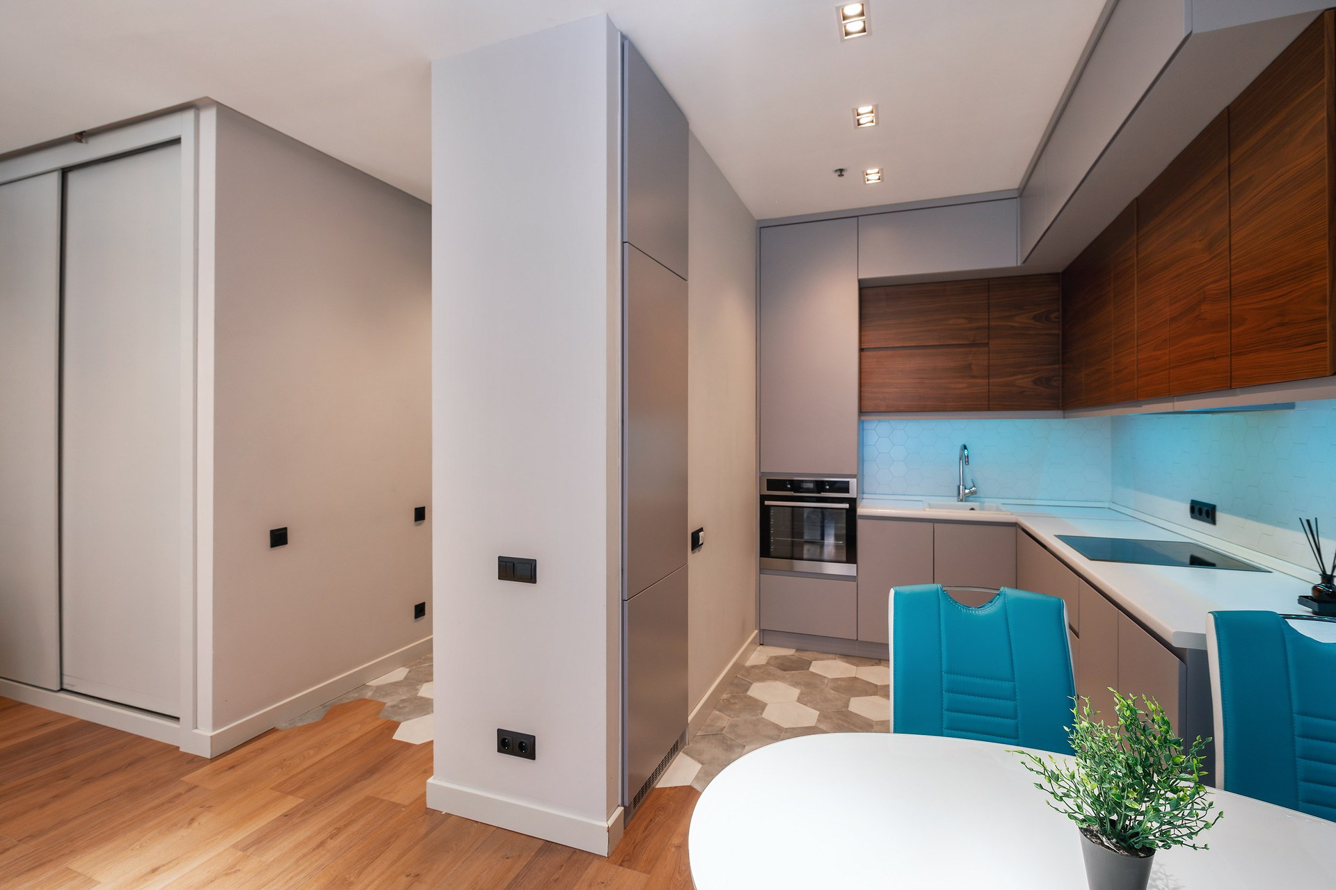 Апартаменты расположены на 6 этаже 15-этажного монолитного дома, построенного в 2017 году. Общая площадь составляет 46,8 кв.м. В апартаментах выполнен дизайнерский ремонт с использованием высококачественных материалов. Пространство апартаментов грамотно зонировано на кухонную, гостиную и спальную зоны.