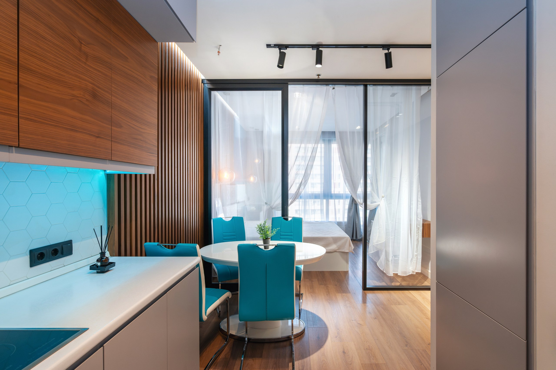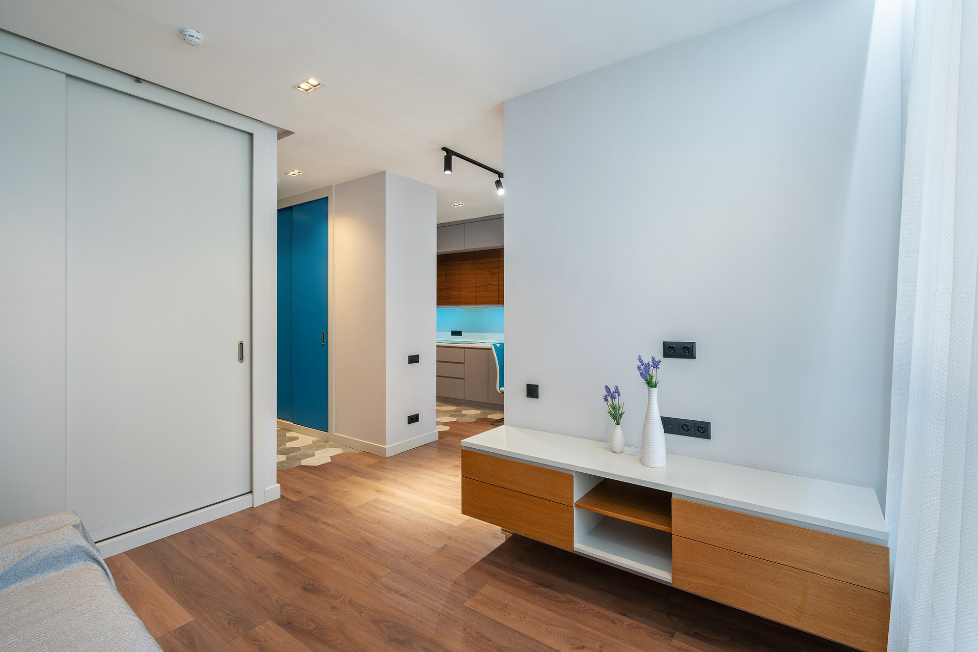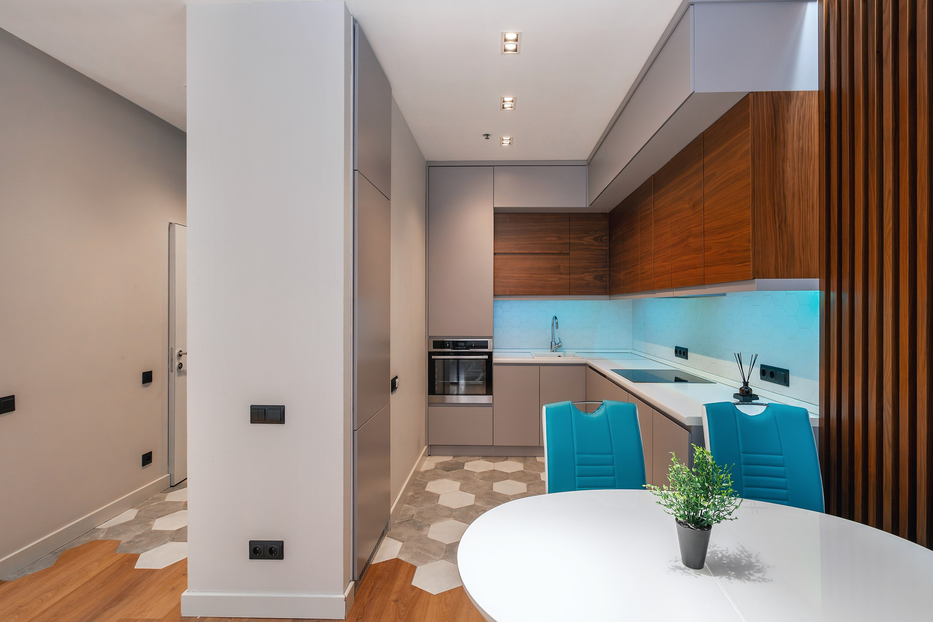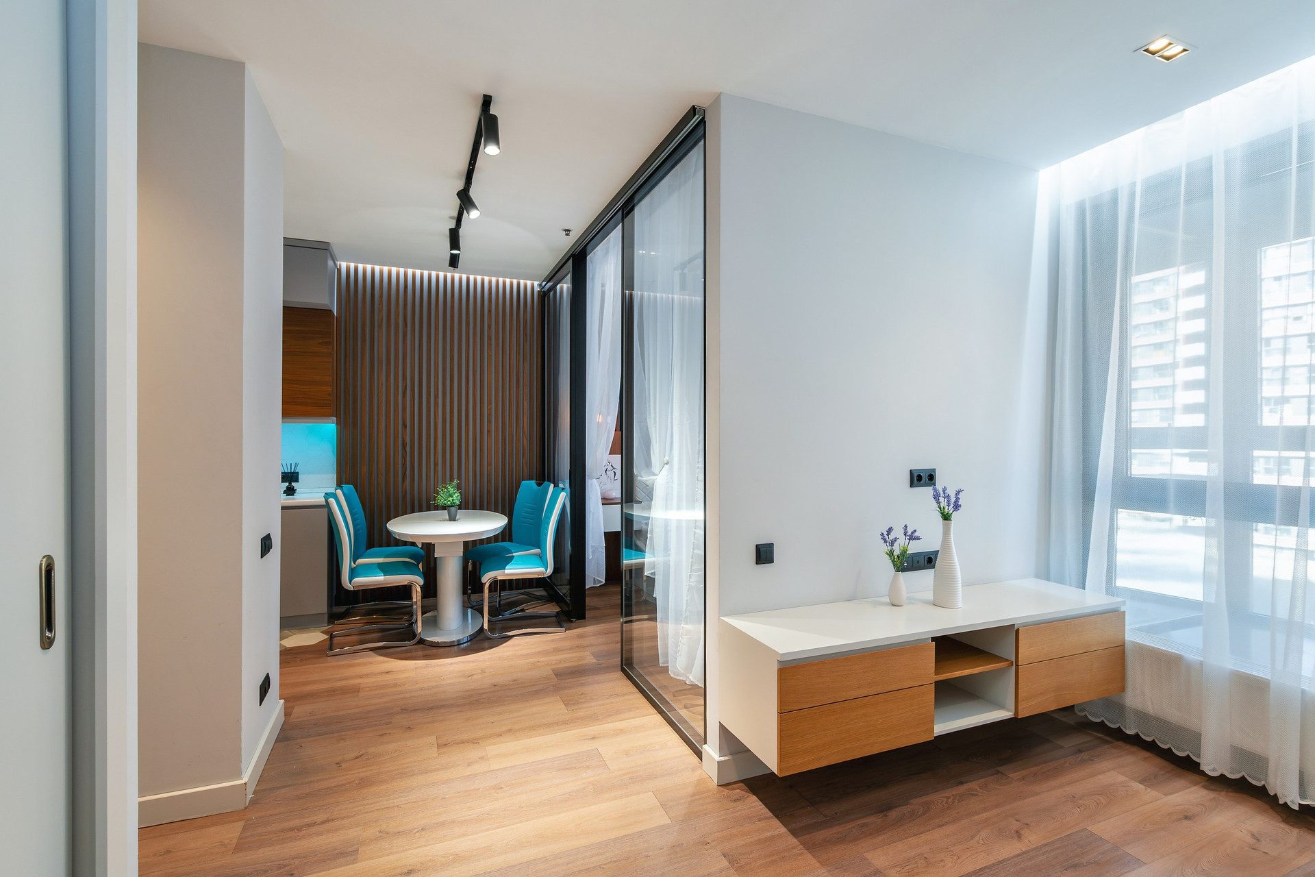 Апартаменты расположены на 6 этаже 15-этажного монолитного дома, построенного в 2017 году. Общая площадь составляет 46,8 кв.м. В апартаментах выполнен дизайнерский ремонт с использованием высококачественных материалов. Пространство апартаментов грамотно зонировано на кухонную, гостиную и спальную зоны.