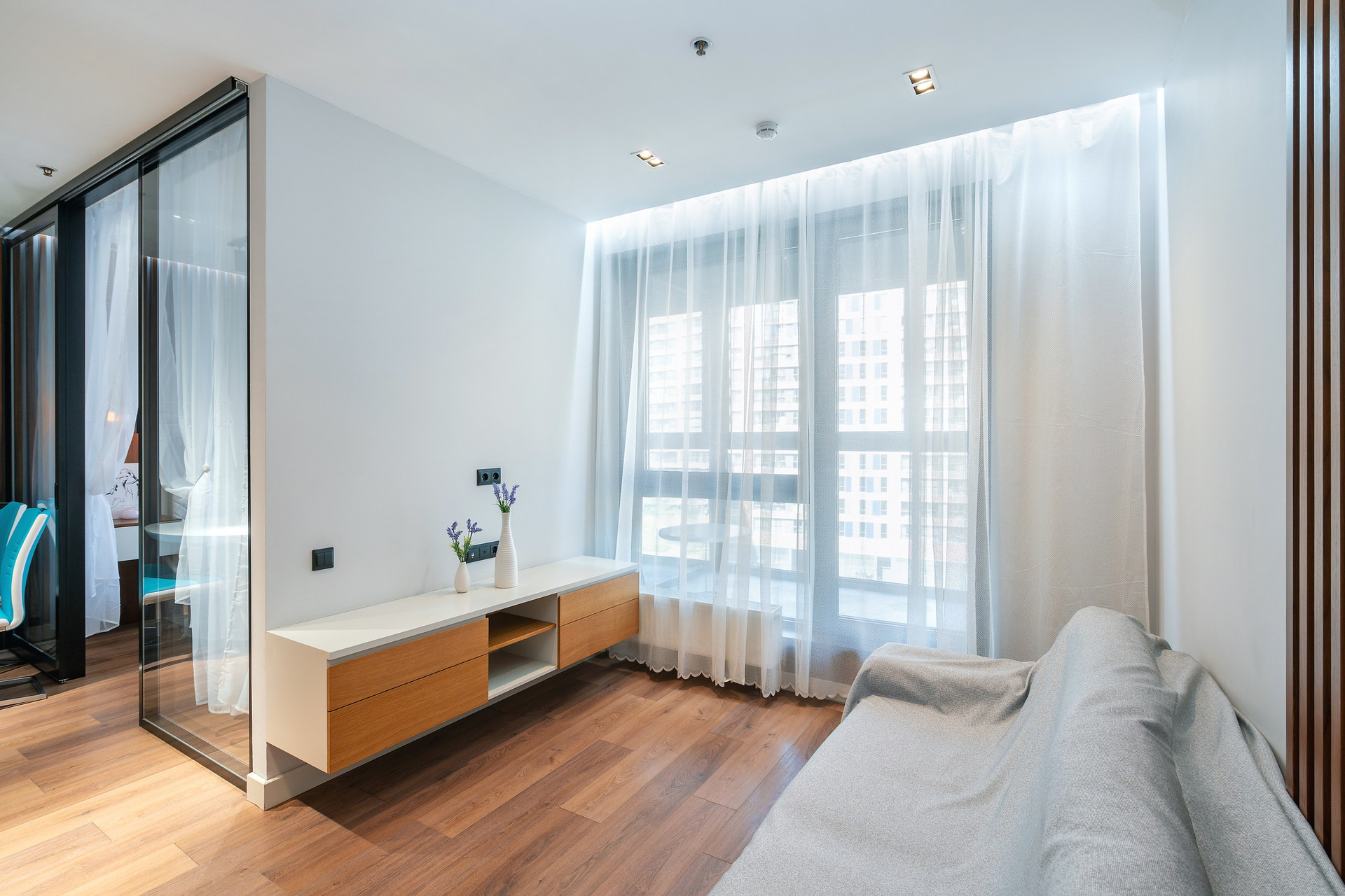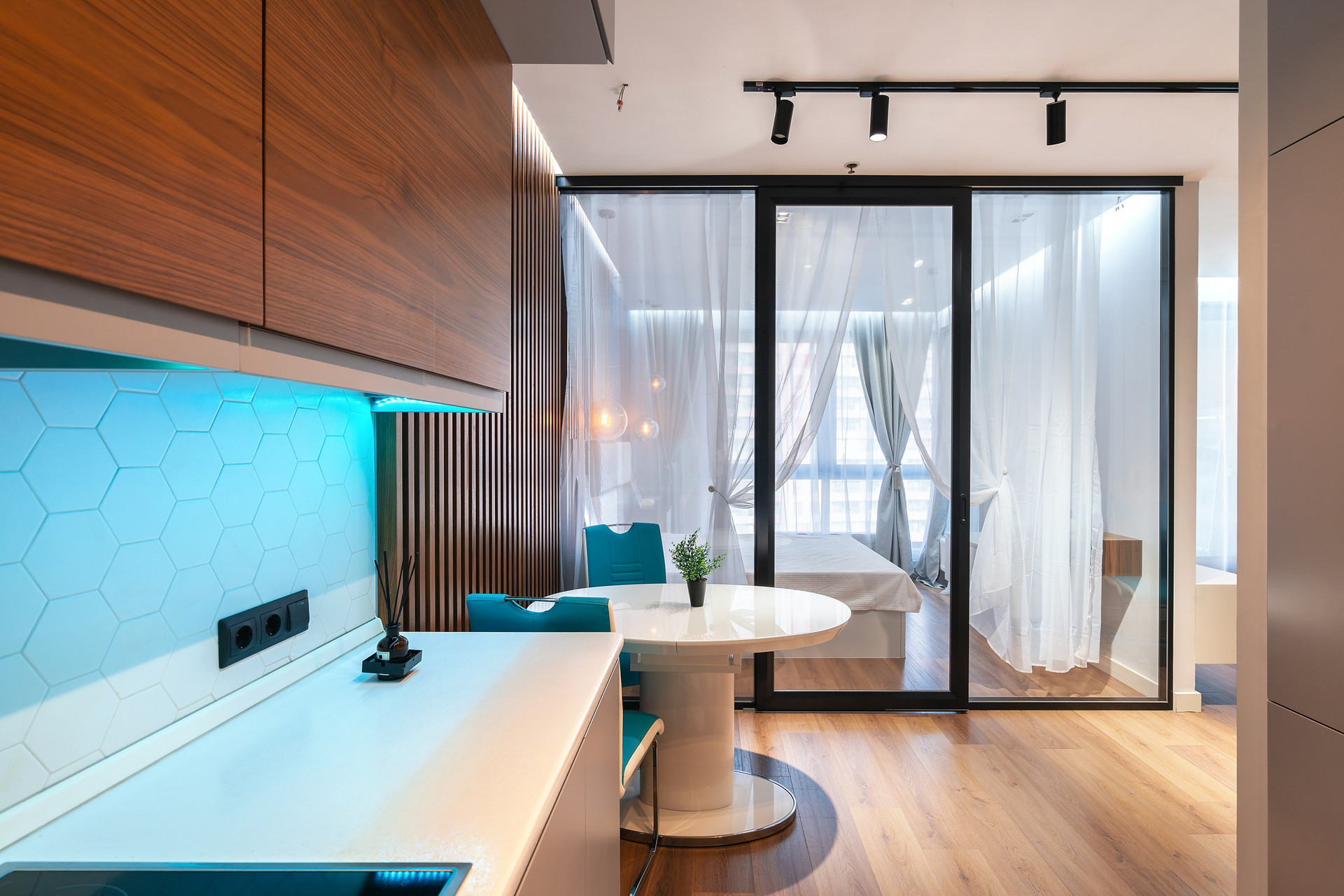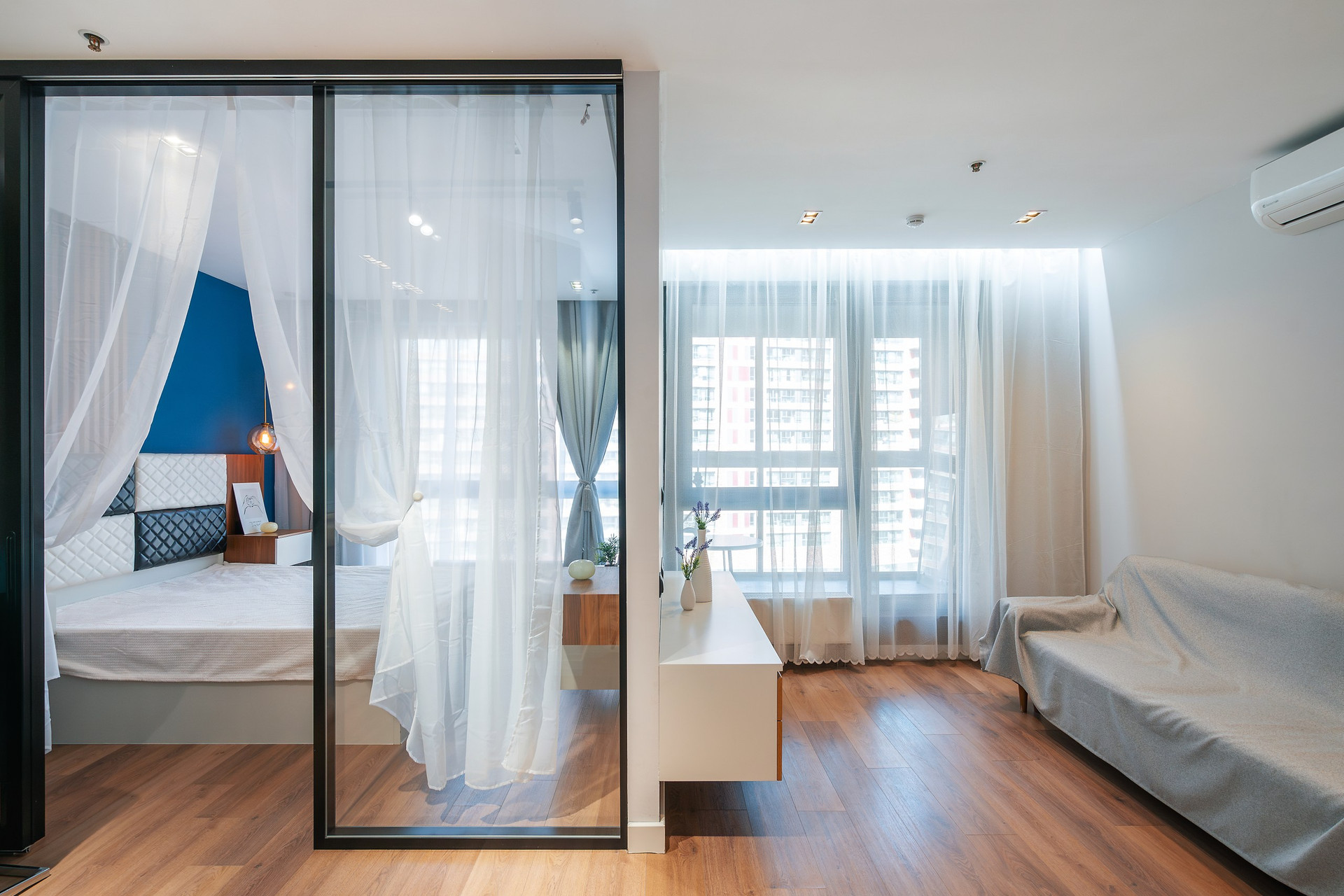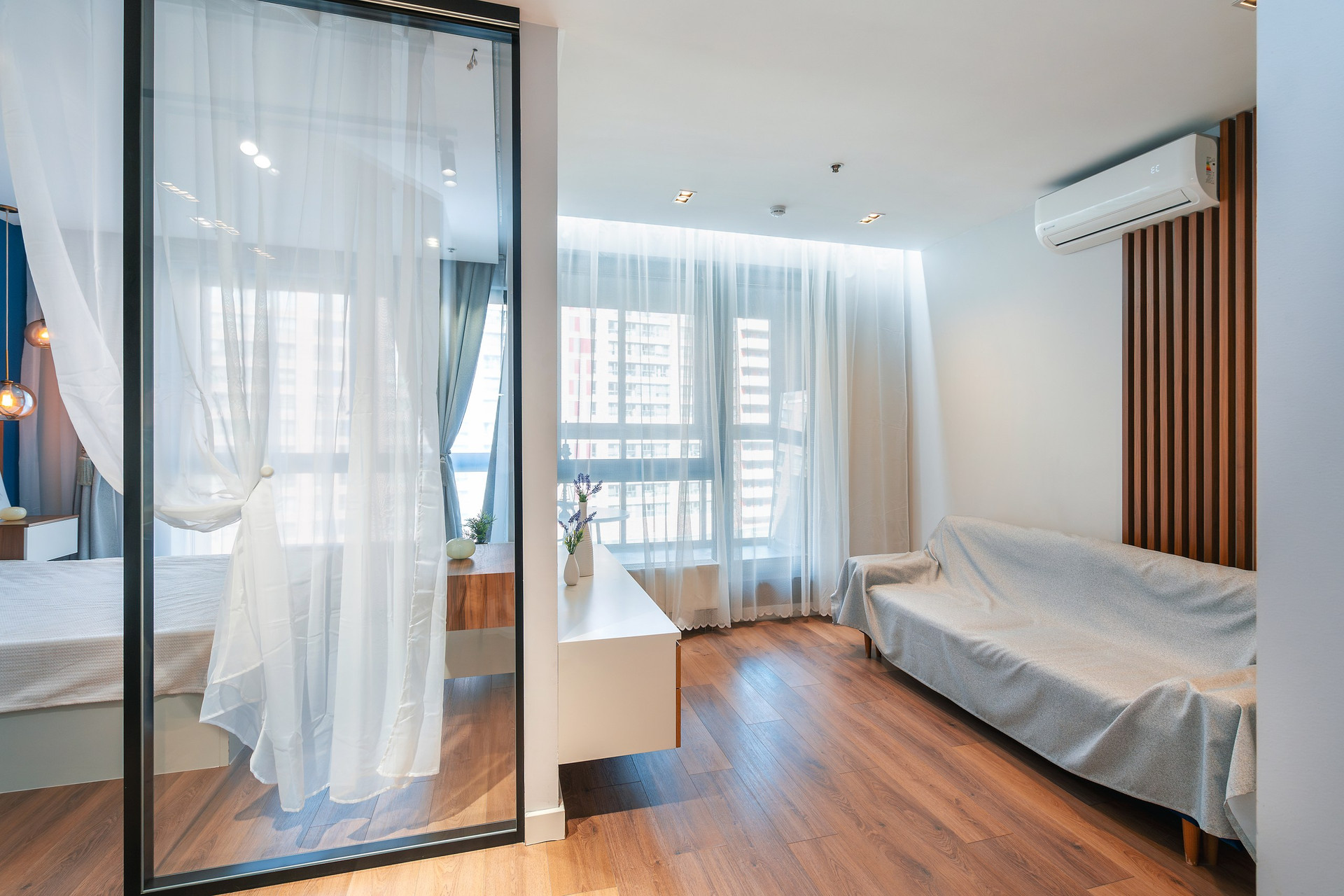 Апартаменты расположены на 6 этаже 15-этажного монолитного дома, построенного в 2017 году. Общая площадь составляет 46,8 кв.м. В апартаментах выполнен дизайнерский ремонт с использованием высококачественных материалов. Пространство апартаментов грамотно зонировано на кухонную, гостиную и спальную зоны.