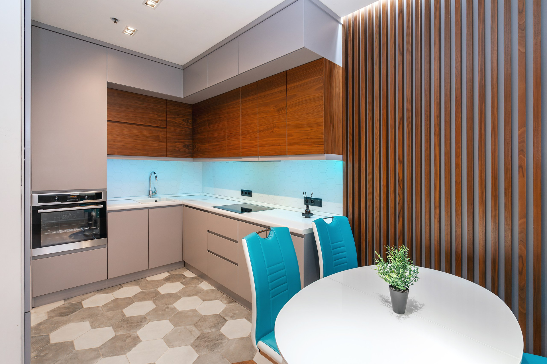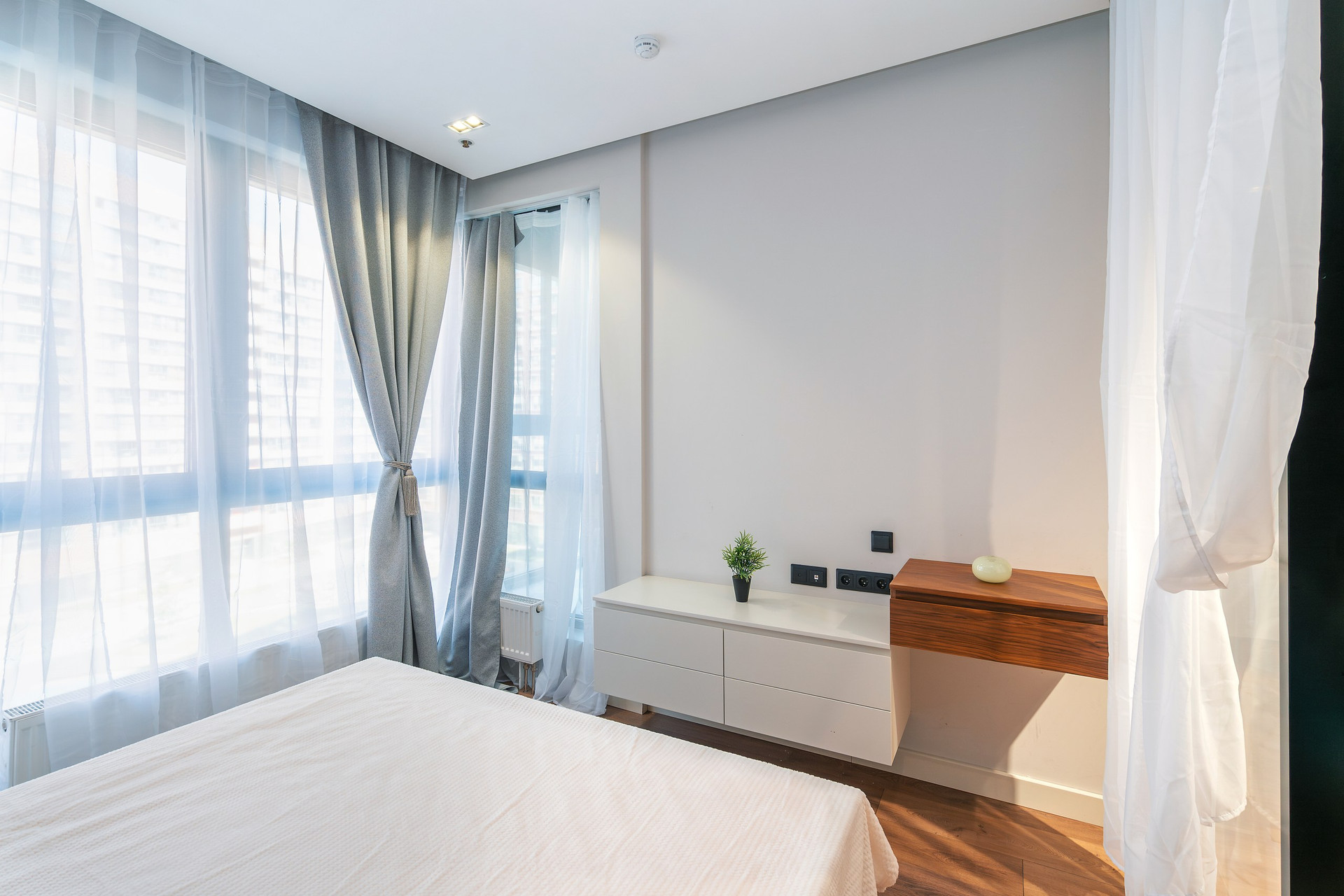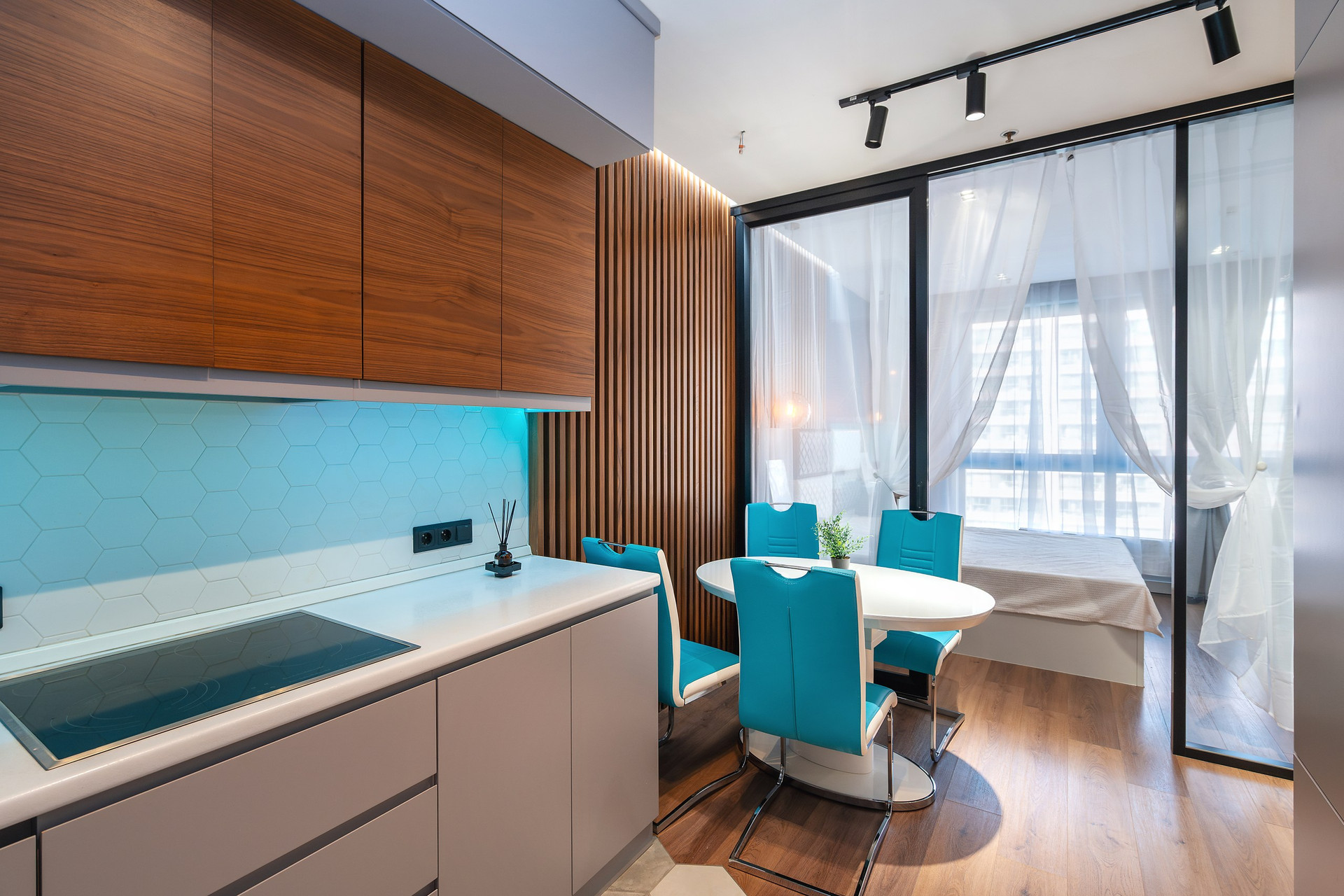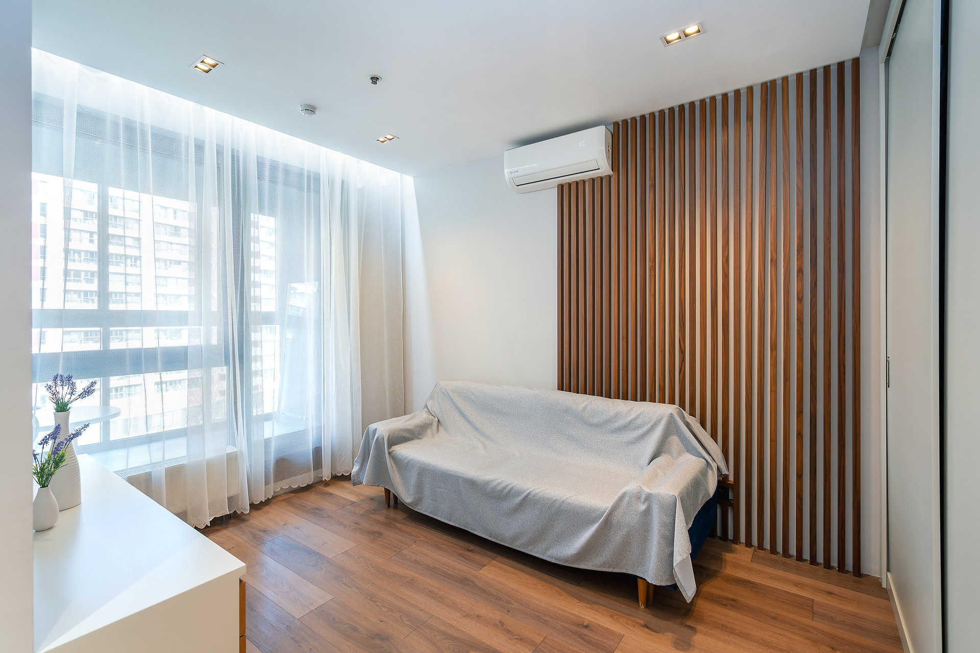 Апартаменты расположены на 6 этаже 15-этажного монолитного дома, построенного в 2017 году. Общая площадь составляет 46,8 кв.м. В апартаментах выполнен дизайнерский ремонт с использованием высококачественных материалов. Пространство апартаментов грамотно зонировано на кухонную, гостиную и спальную зоны.