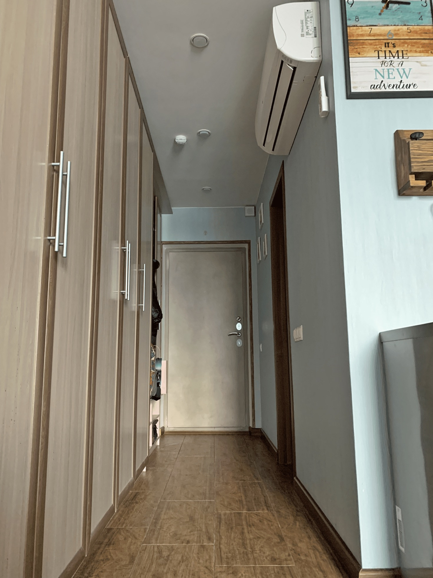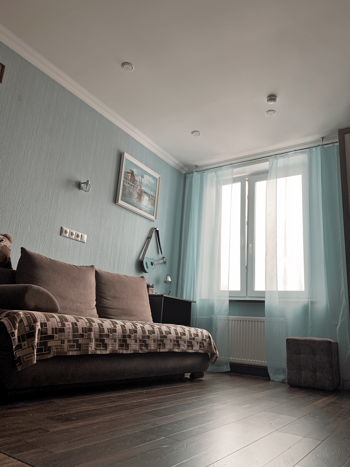 Неоткрывающееся окно застройщика заменено на двустворчатое окно REHAU в цвет фасада дома, выходит на восточную сторону (летом не жарко). Съемная москитная сетка с внутренней установкой на летний период. Регулируемые батареи (зимой тепло).