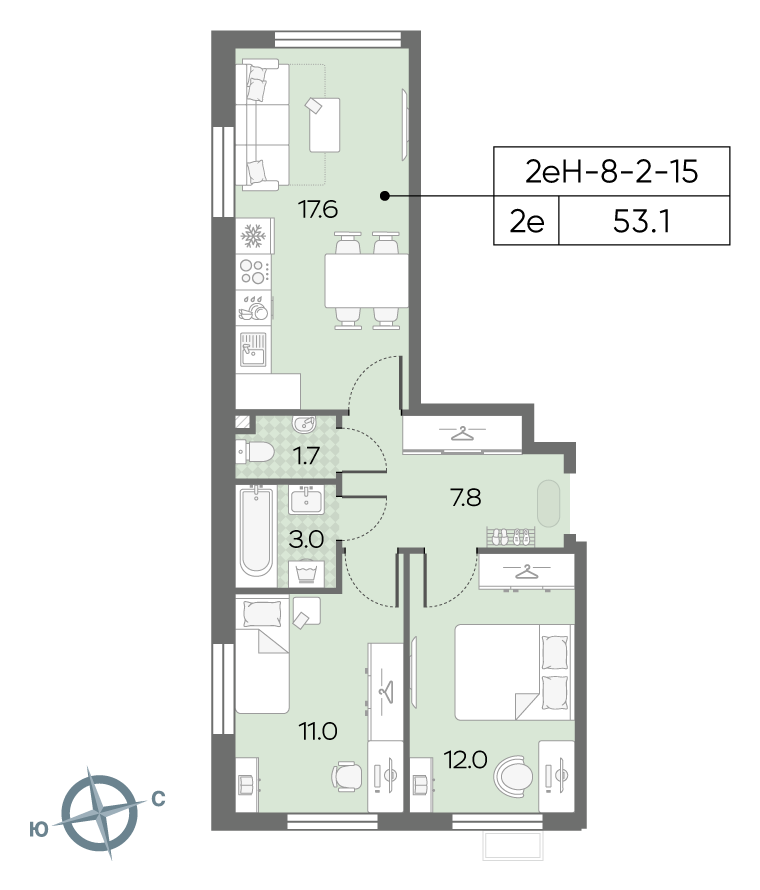 Общая площадь 52.4 м2