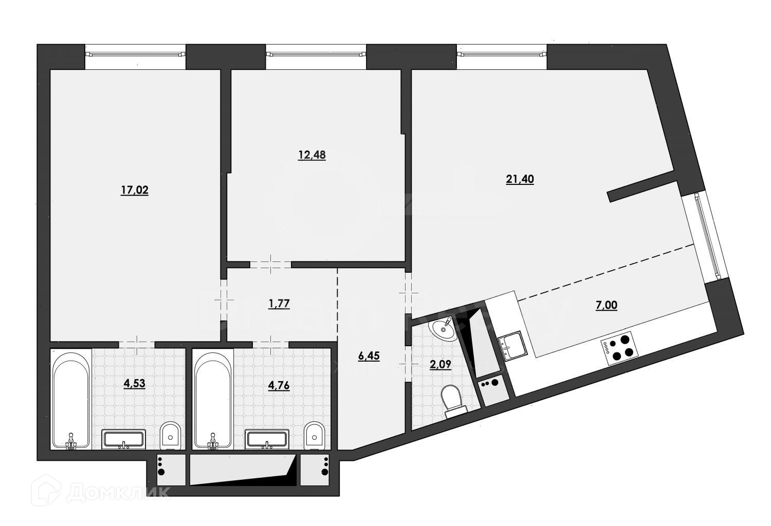 Общая площадь 77.8 кв.м. большая кухня-гостиная с двумя окнами и зонированной кухней, две изолированные спальни (можно сделать три спальни), три санузла.
