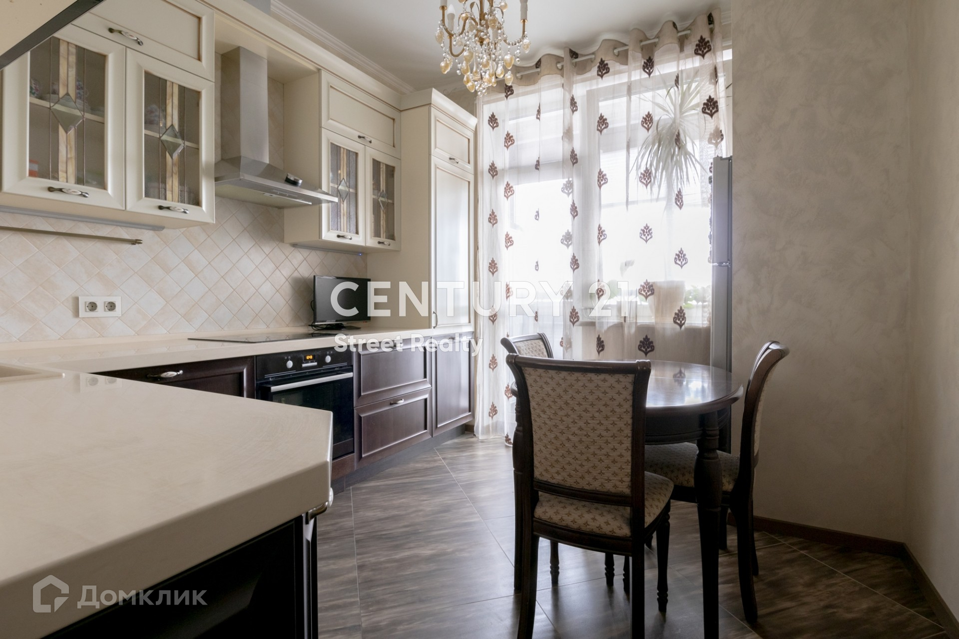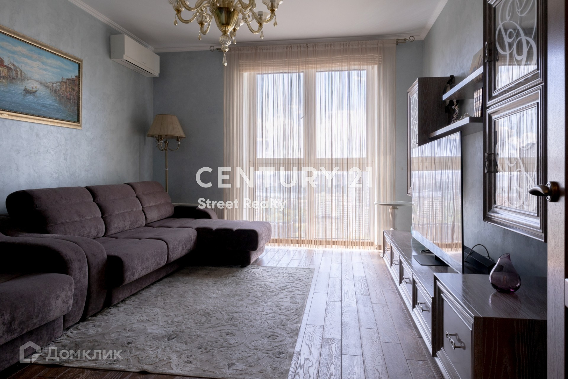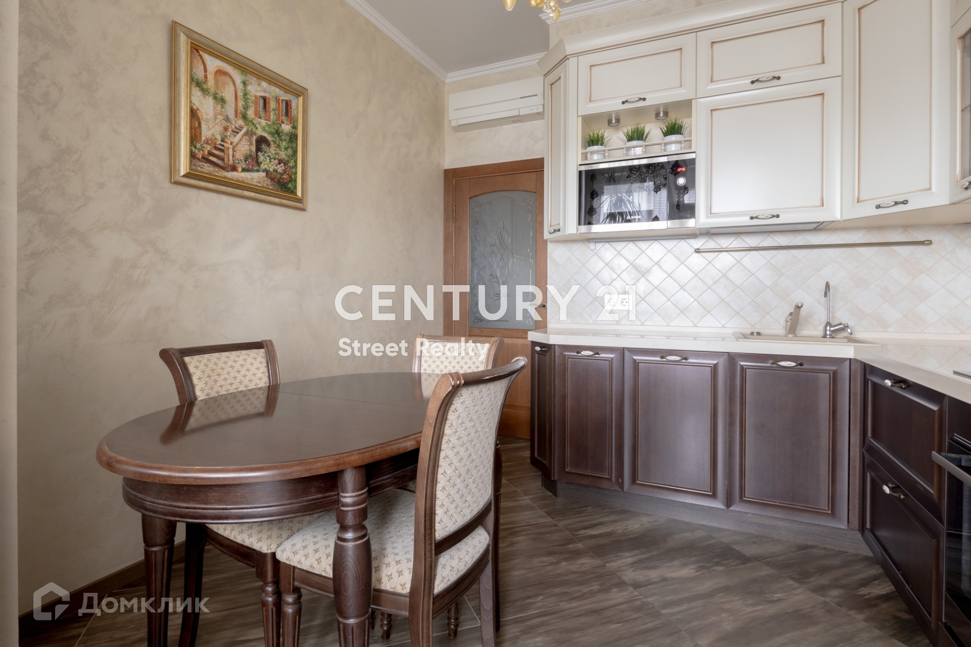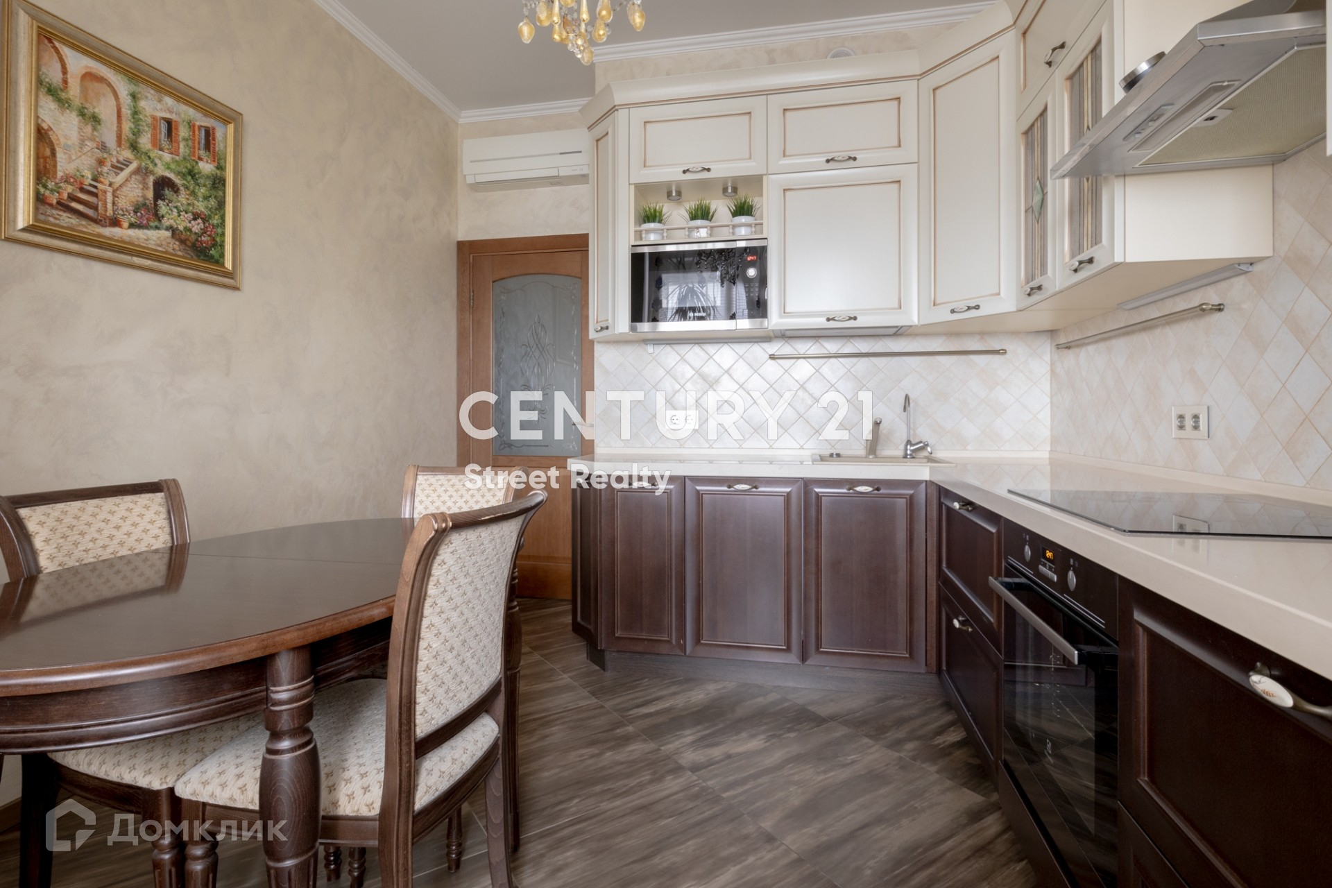 На полу паркет, изготовленный по индивидуальному заказу. В квартире установлены кондиционеры Mitsubishi. Кухня полностью оборудована встроенной бытовой техникой европейских производителей.