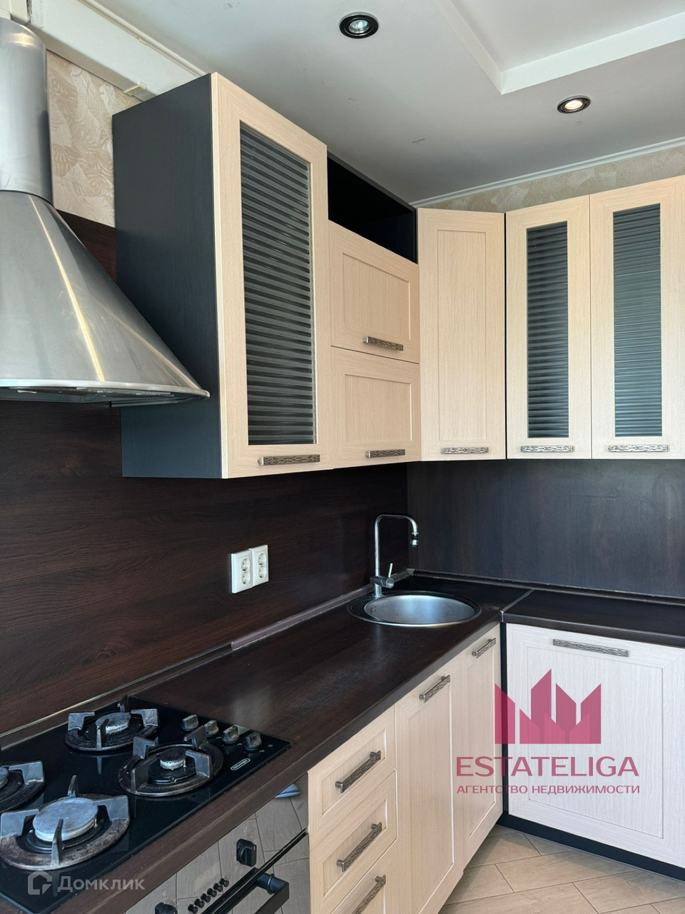 Встроенная кухня с духовым шкафом, плитой и посудомойкой.