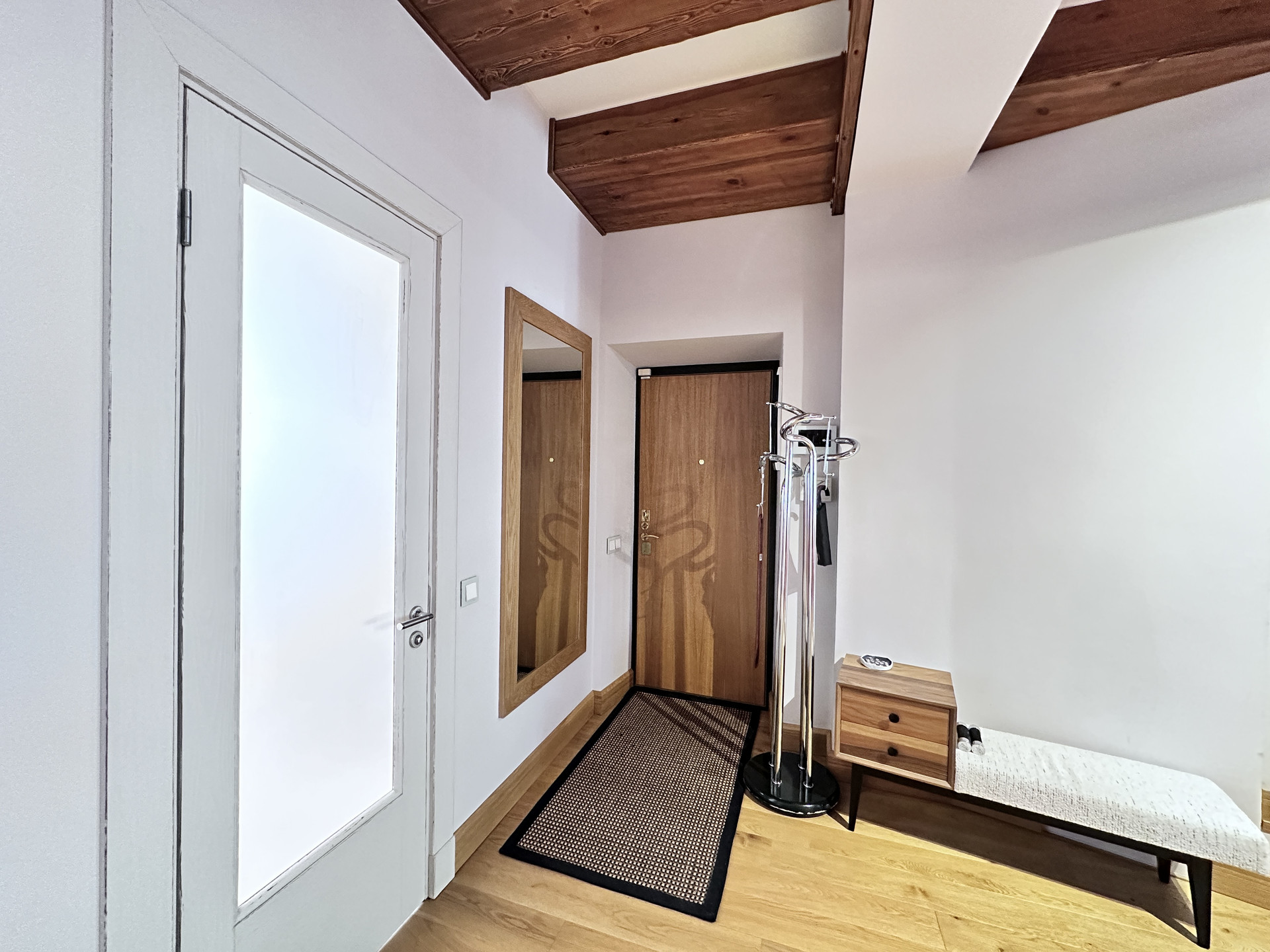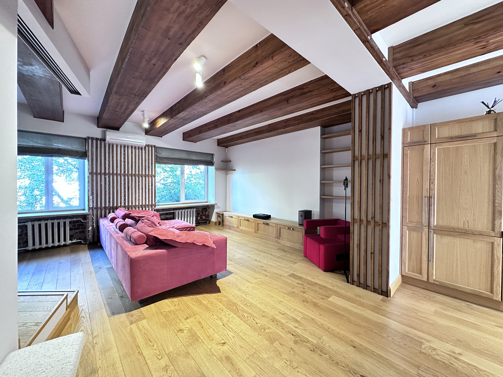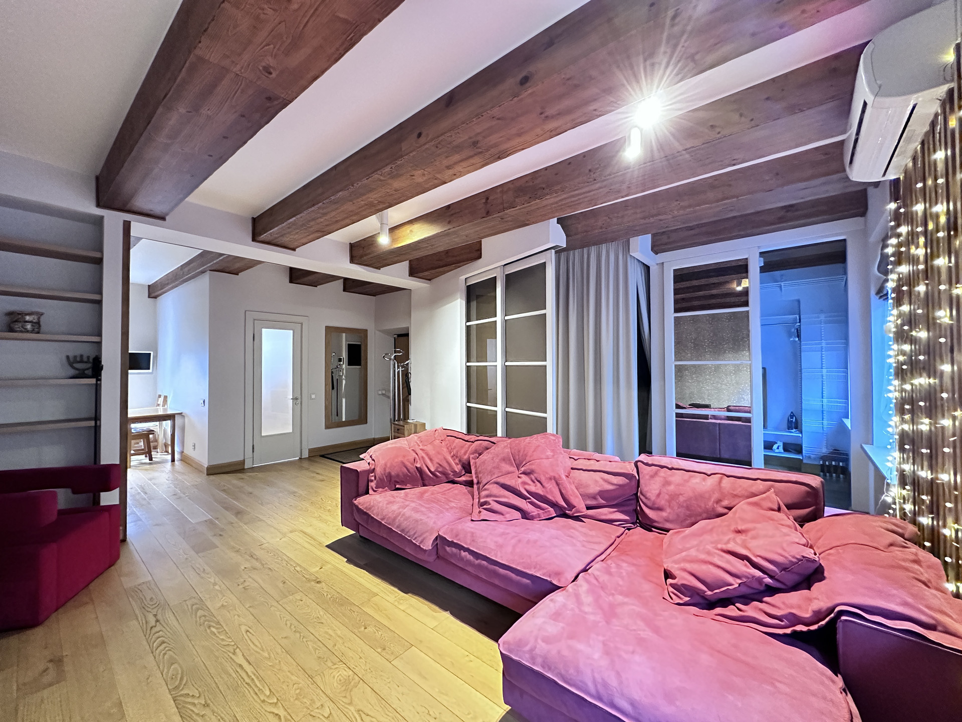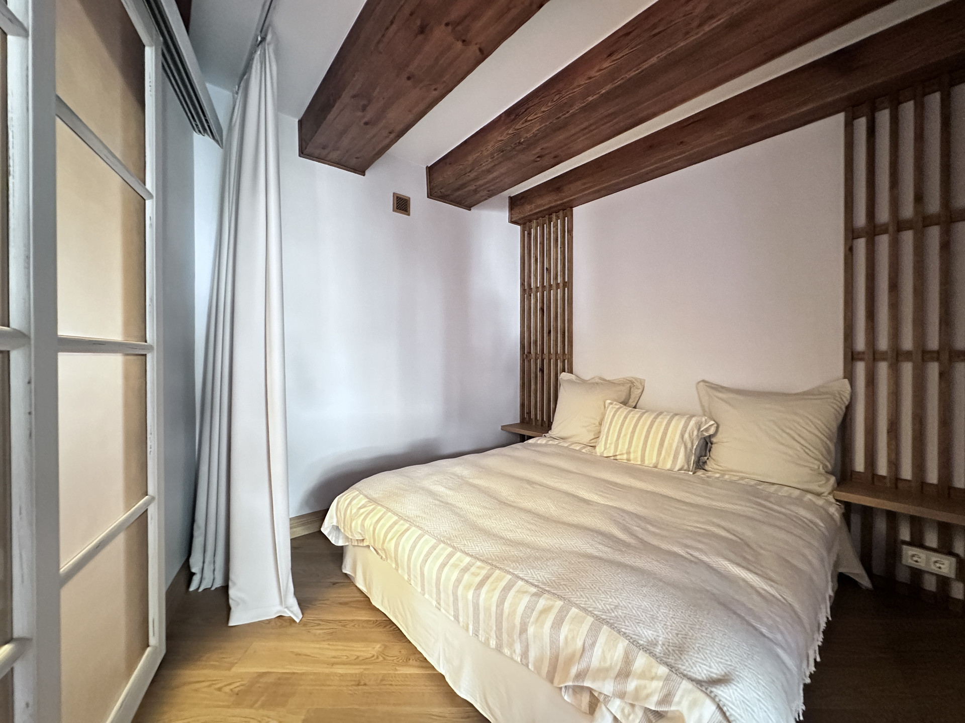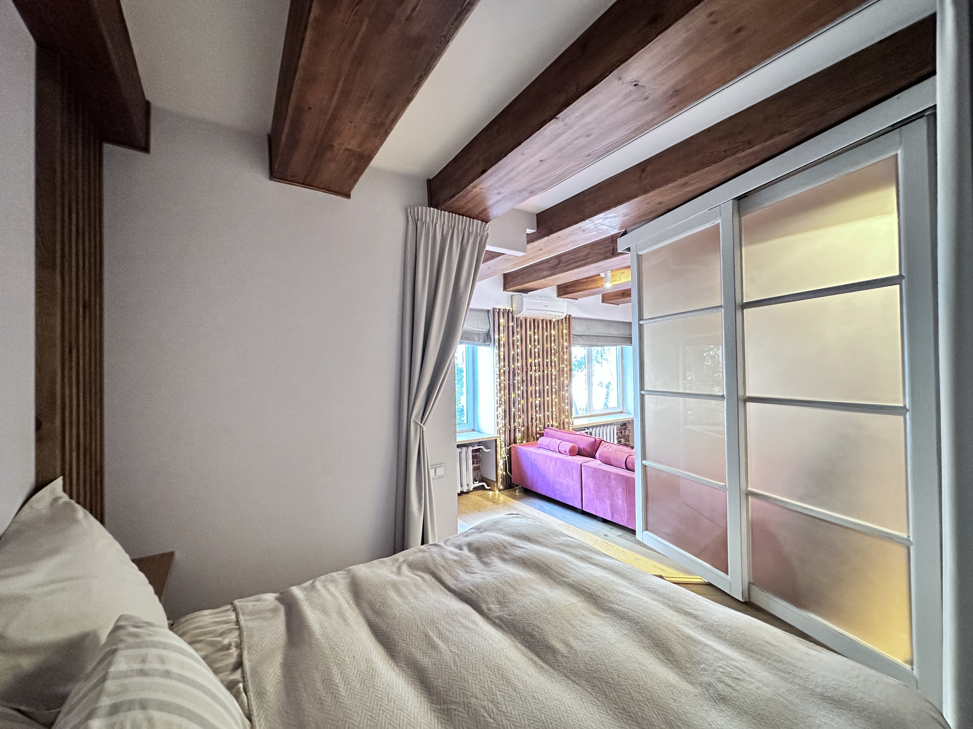 - обособленную спальную зону на подиуме,  которая частично изолируется декоративными задвижными дверьми и плотной партьерной шторой;