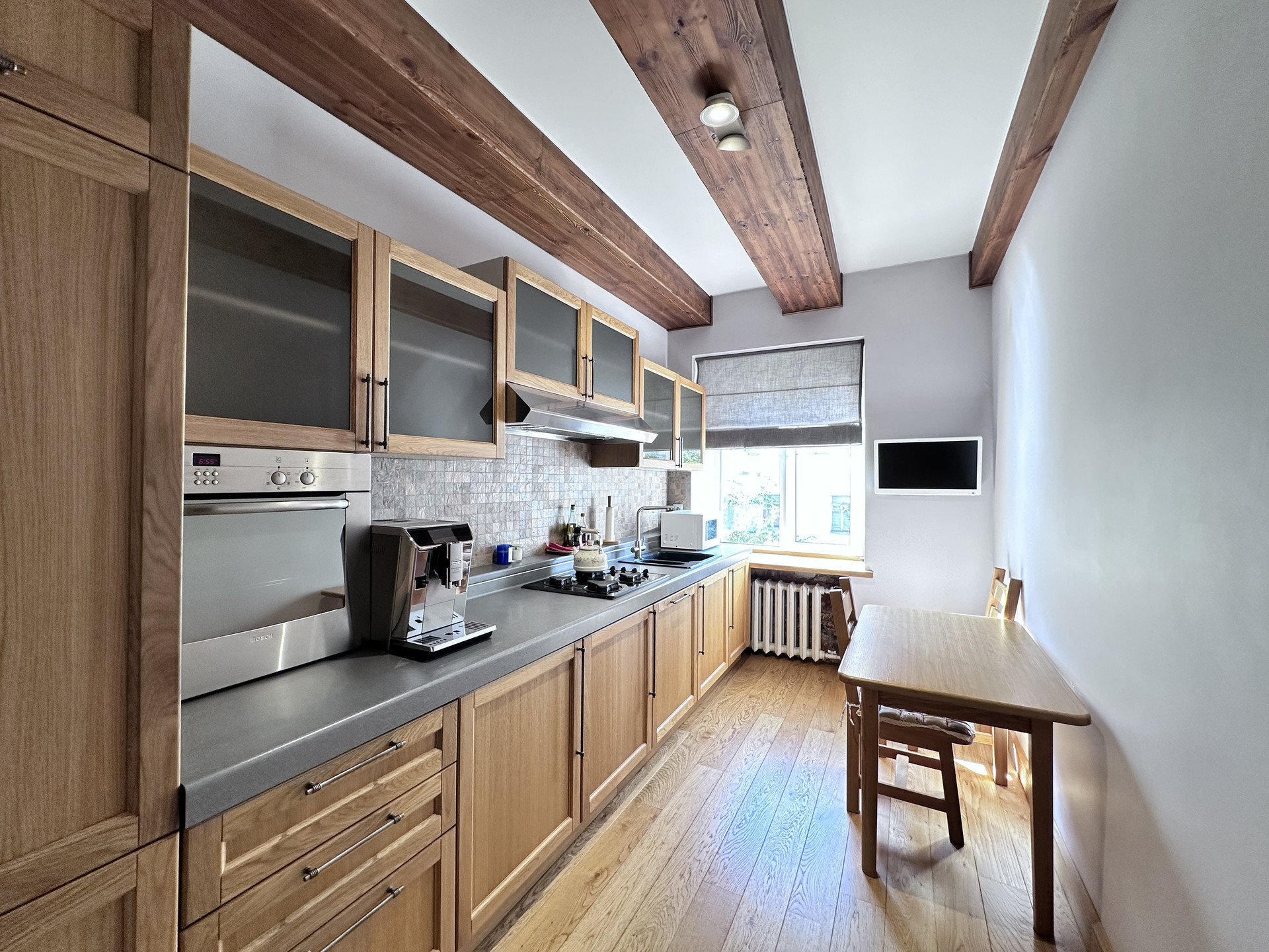 Кухня укомплектована встроенным кухонным гарнитуром с бытовой техникой. Имеется посудомоечная машина, СВЧ, встроенный холодильник.