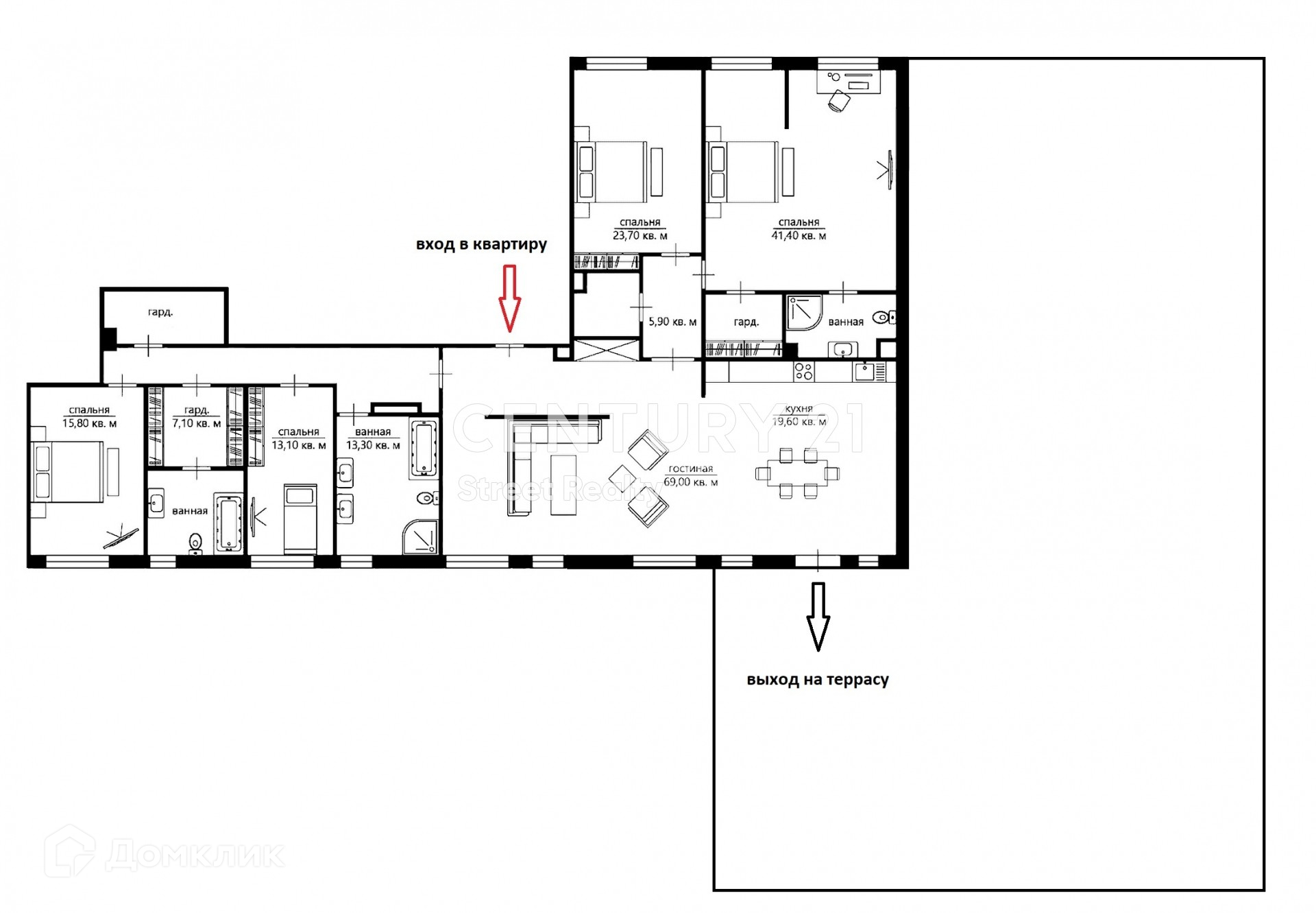Общая площадь квартиры составляет 250,5м2, планировкой предусмотрено: пять спален (одна из них мастер-спальня со своей гардеробной и санузлом), кухонная зона с просторной гостиной, три санузла. Собственный выход на террасу 200м2.