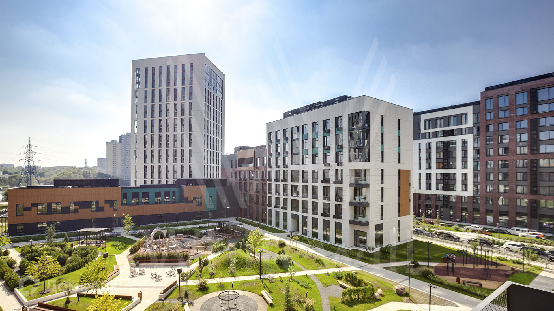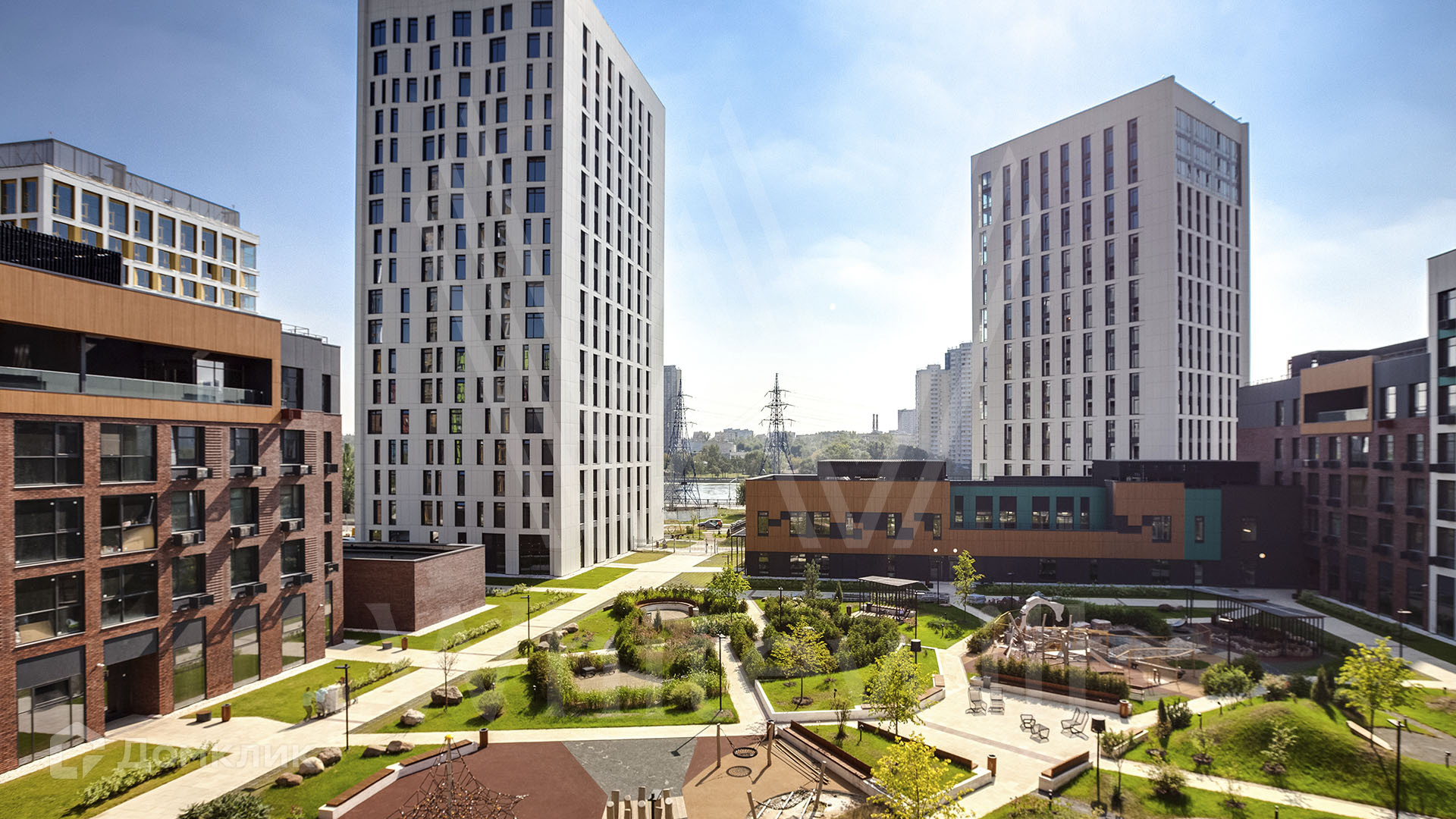 Квартиры без отделки. Планировочные решения разнообразны — от небольших односпальных квартир на 43 м² до просторных квартир на 118 м² с кухней-гостиной и тремя спальнями. В основном пуле квартир высота потолков 3,1 метра, у квартир на последних этажах —  3,4 метра. Из окон открываются виды на тихую гладь воды Москвы-реки, внутренний двор или зеленую парковую зону. Комплекс окружили ландшафтным парком площадью 2,5 гектара и обустроили его пешеходными дорожками, детскими и спортивными площадками.