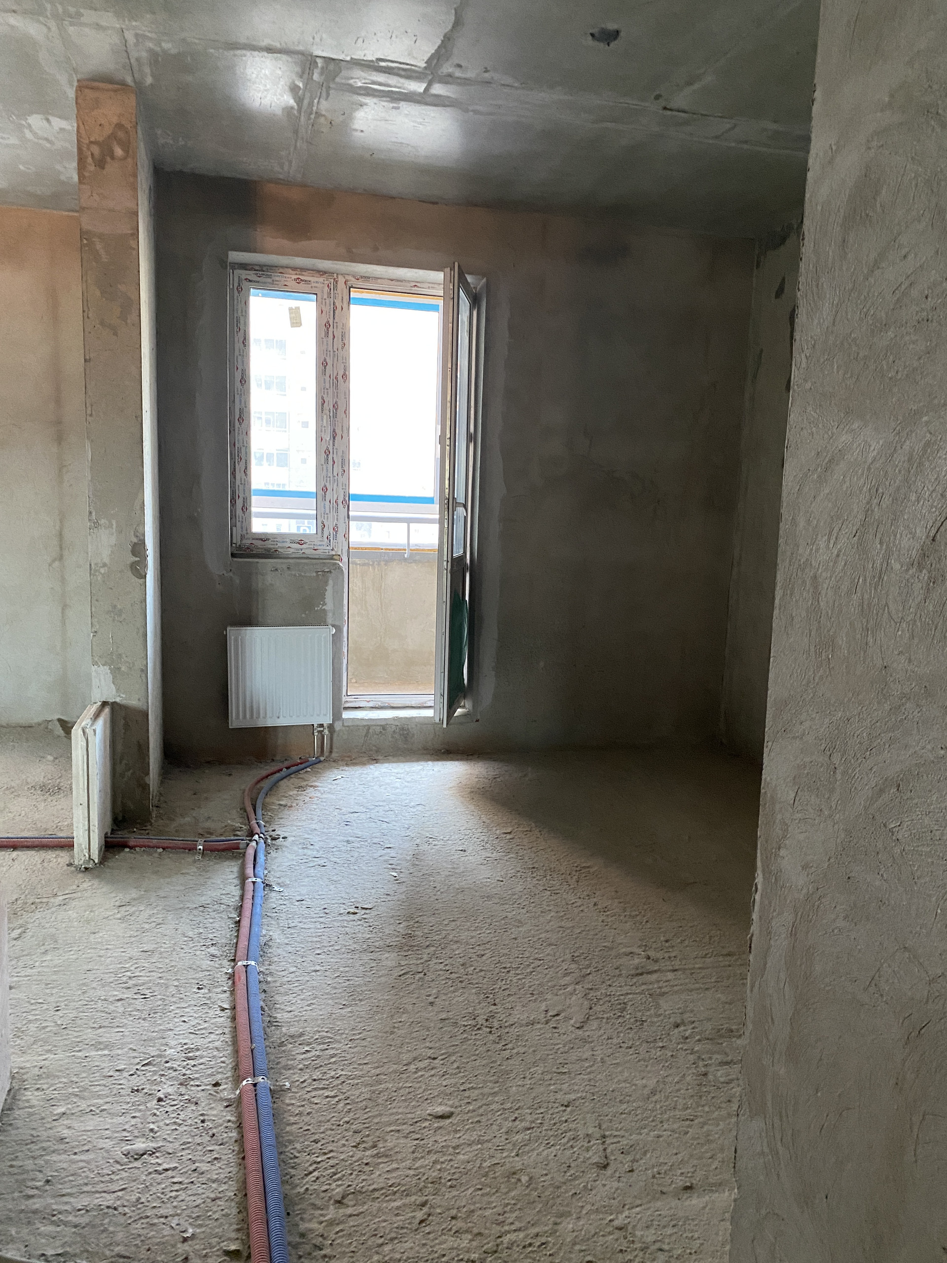 Студия сдается с черновым ремонтом, стены — бетон. Высокий второй этаж, потолки 2,8 м.