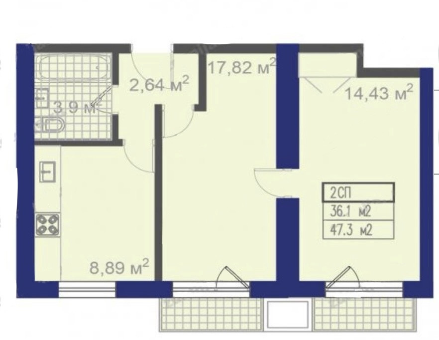 Общая площадь 45.7 м2