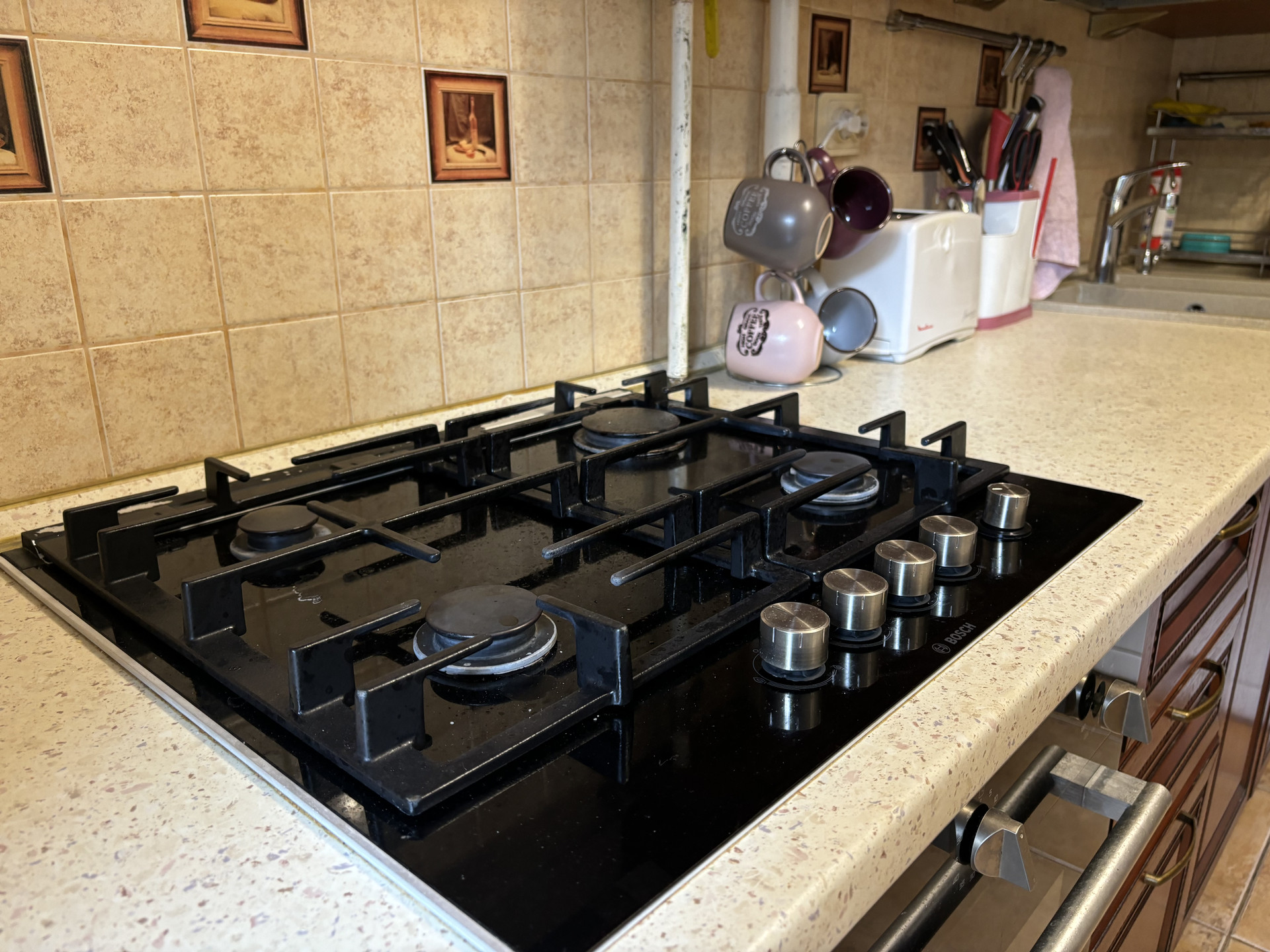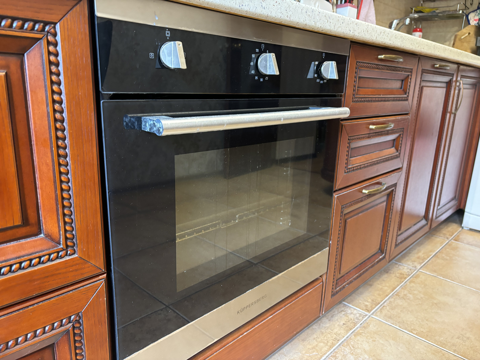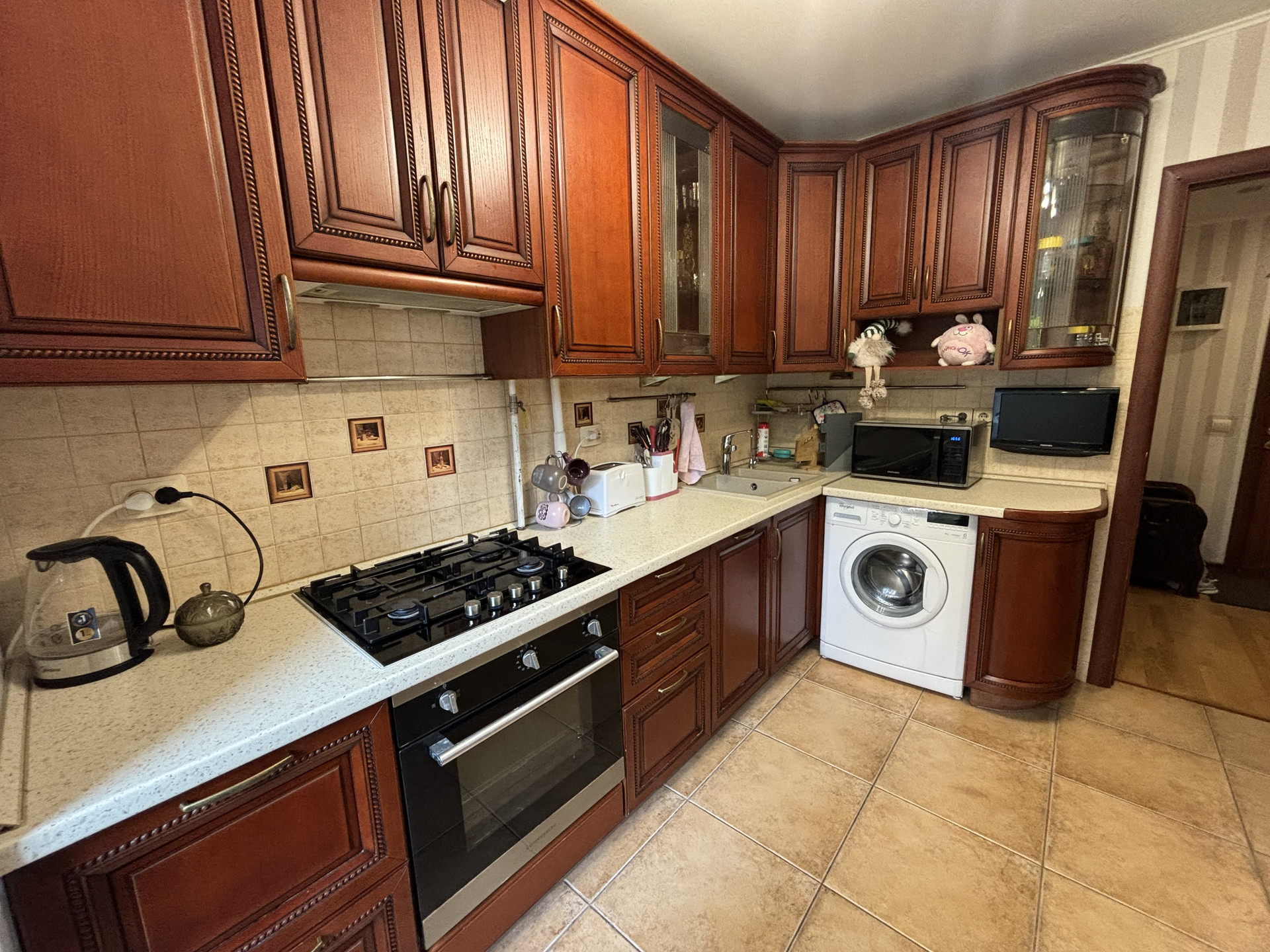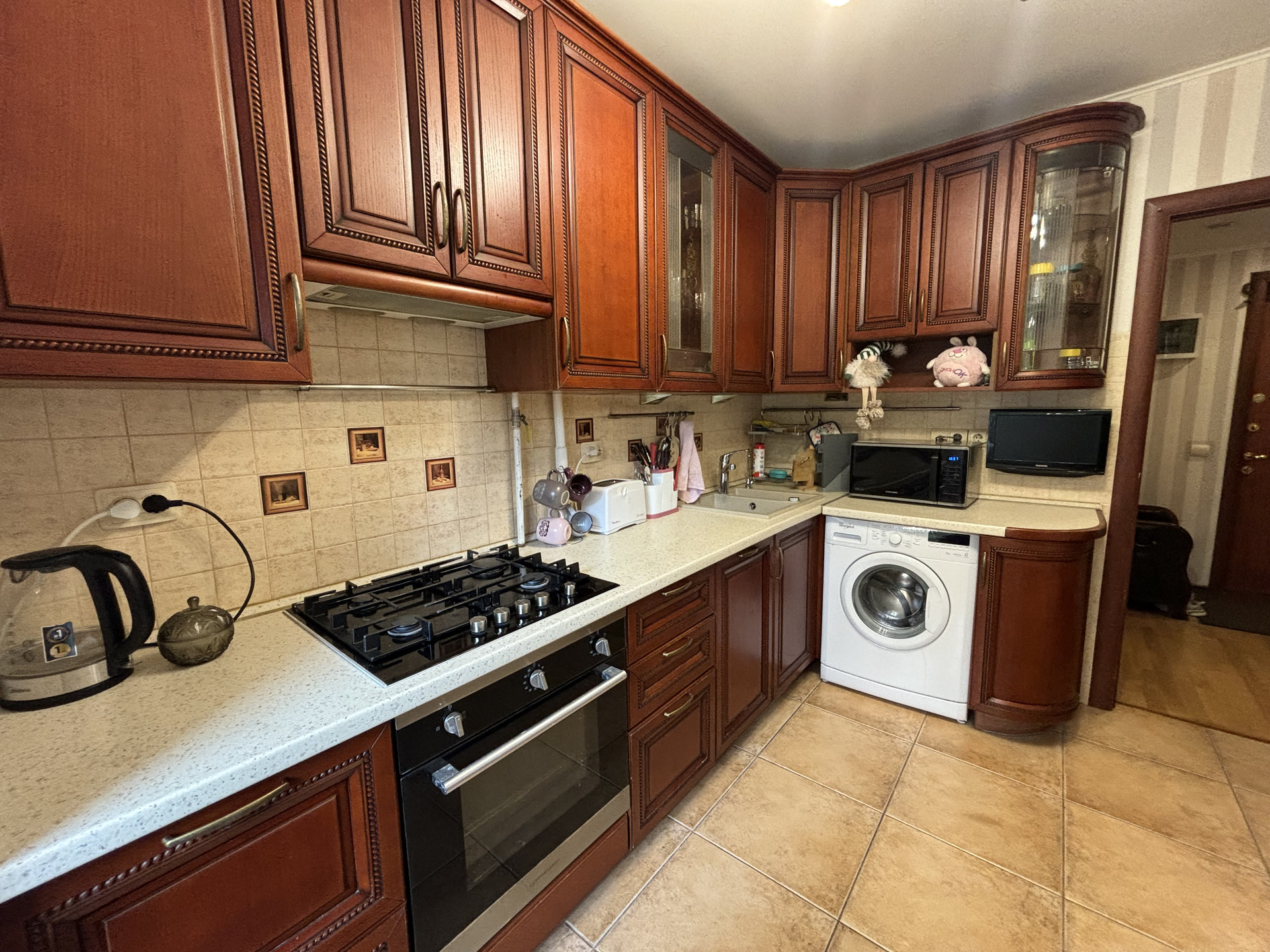 - Деревянный кухонный гарнитур с варочной панелью, вытяжкой и духовым шкафом