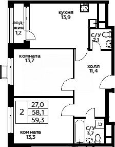 Общая площадь 61 м2