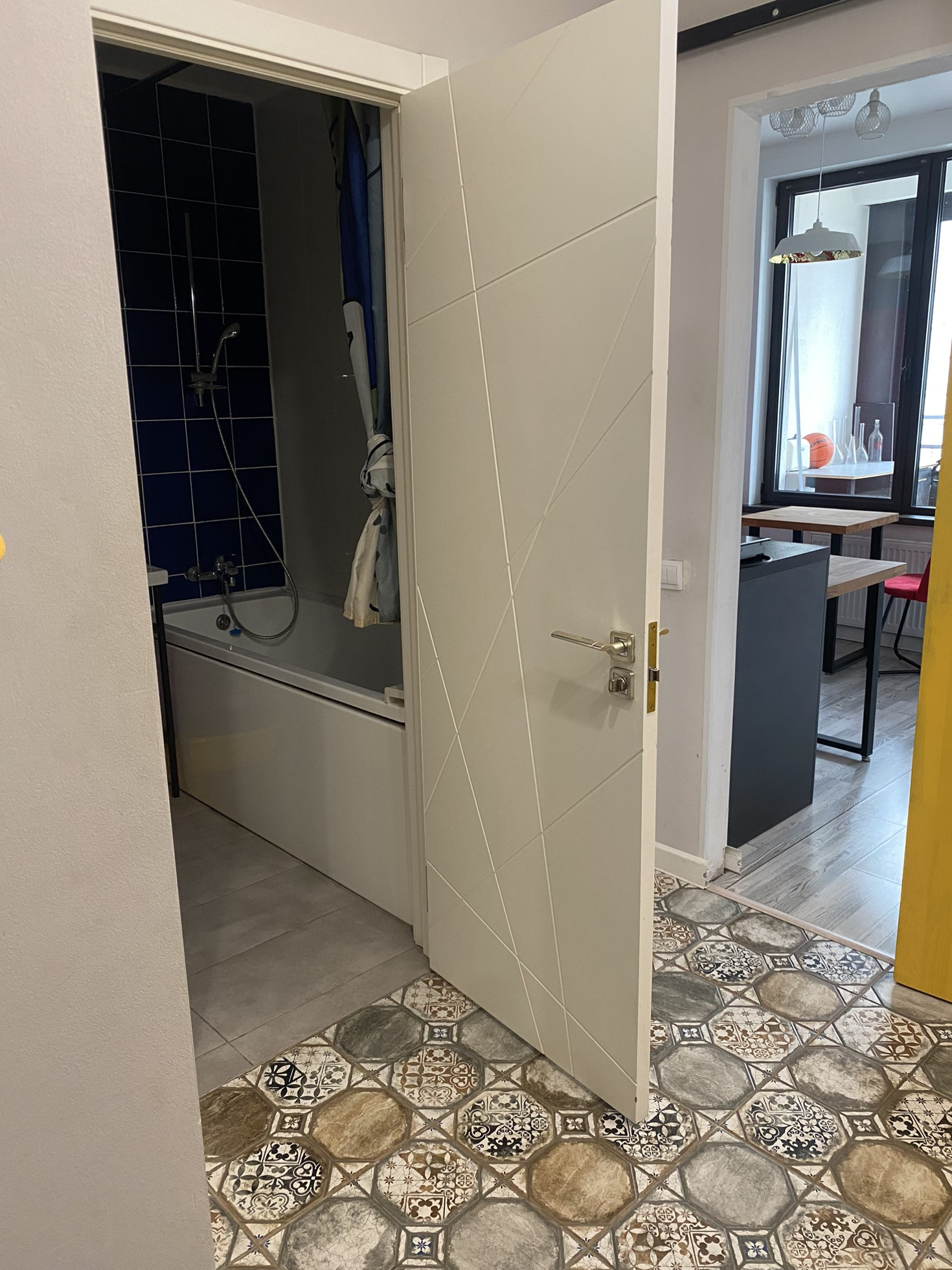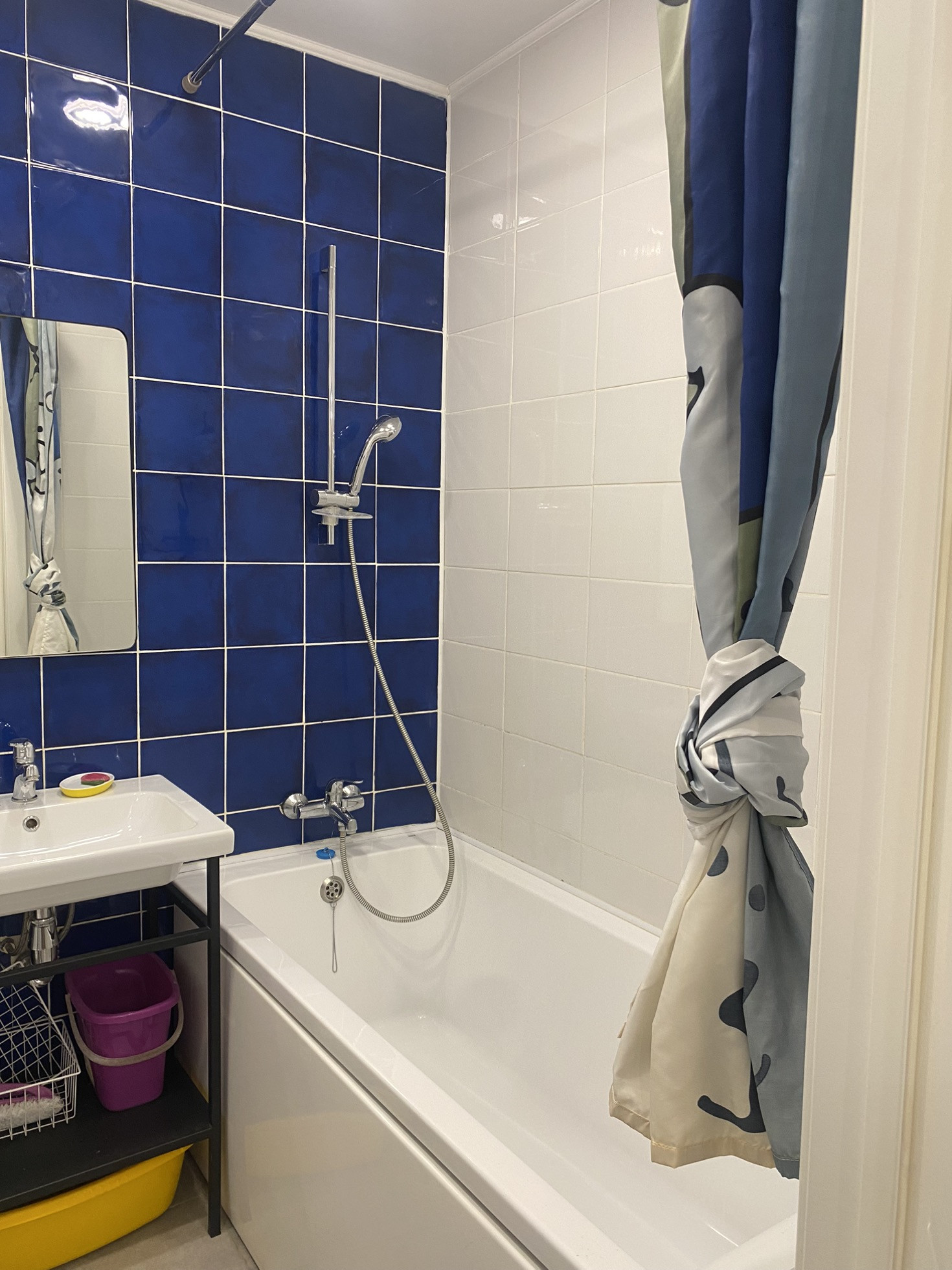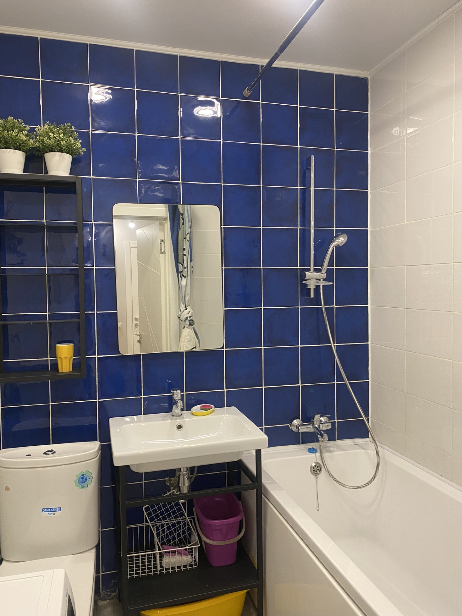 Совмещённый санузел с полноразмерной ванной и качественной немецкой и испанской сантехникой.