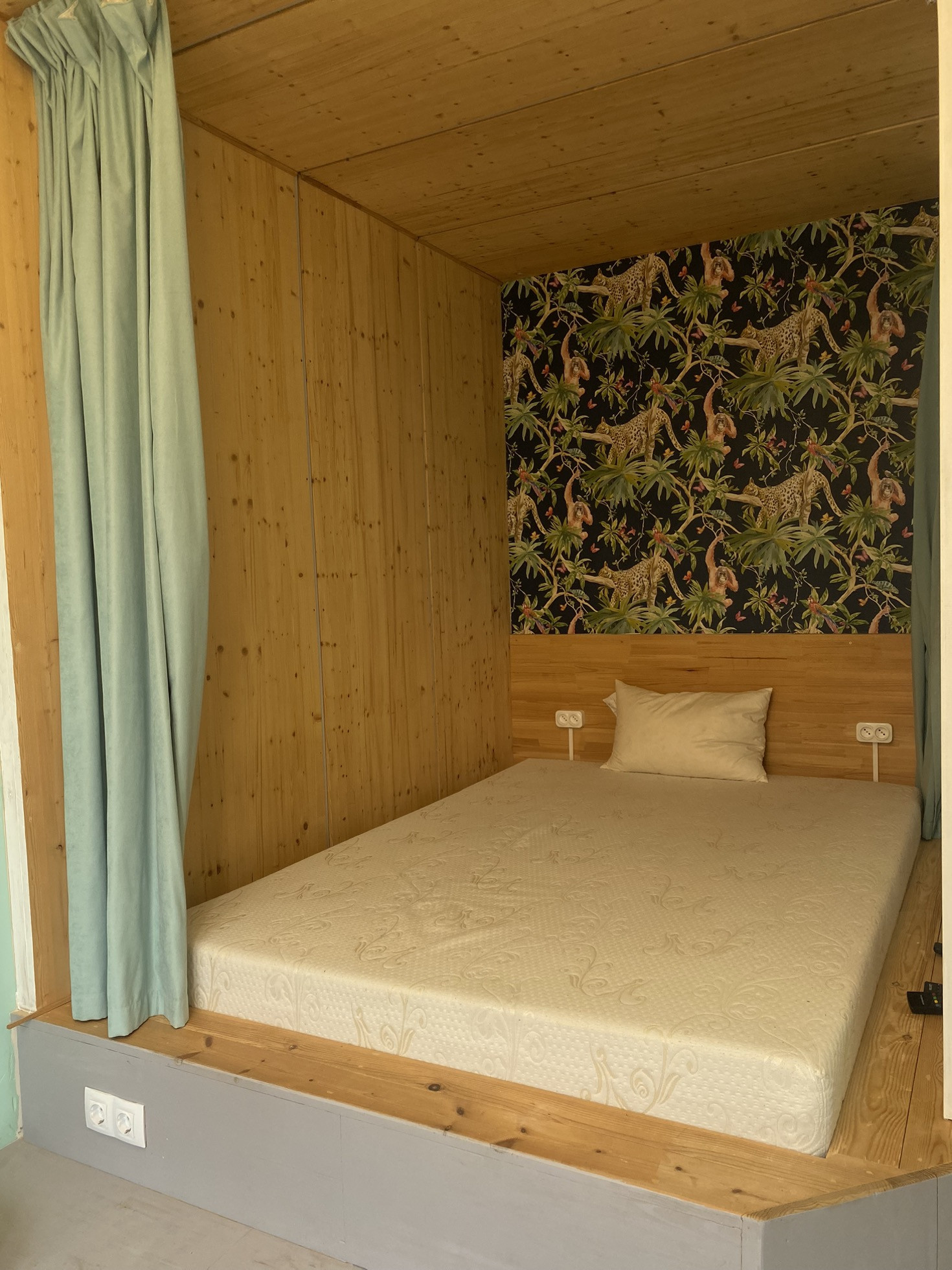 Изолированная уютная спальня укомплектована комфортной двуспальной кроватью, сделанной на заказ, с пространством под ней для хранения. Также в спальне имеется небольшая гостиная зона с настенным ТВ.