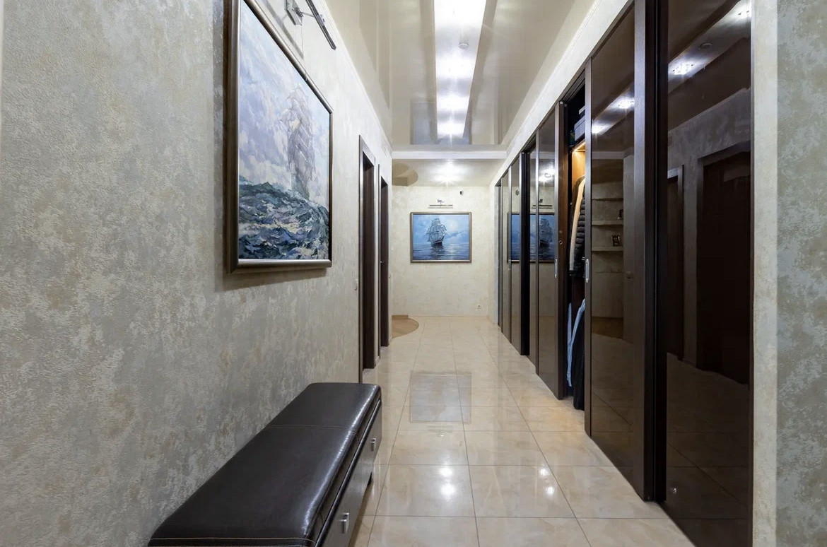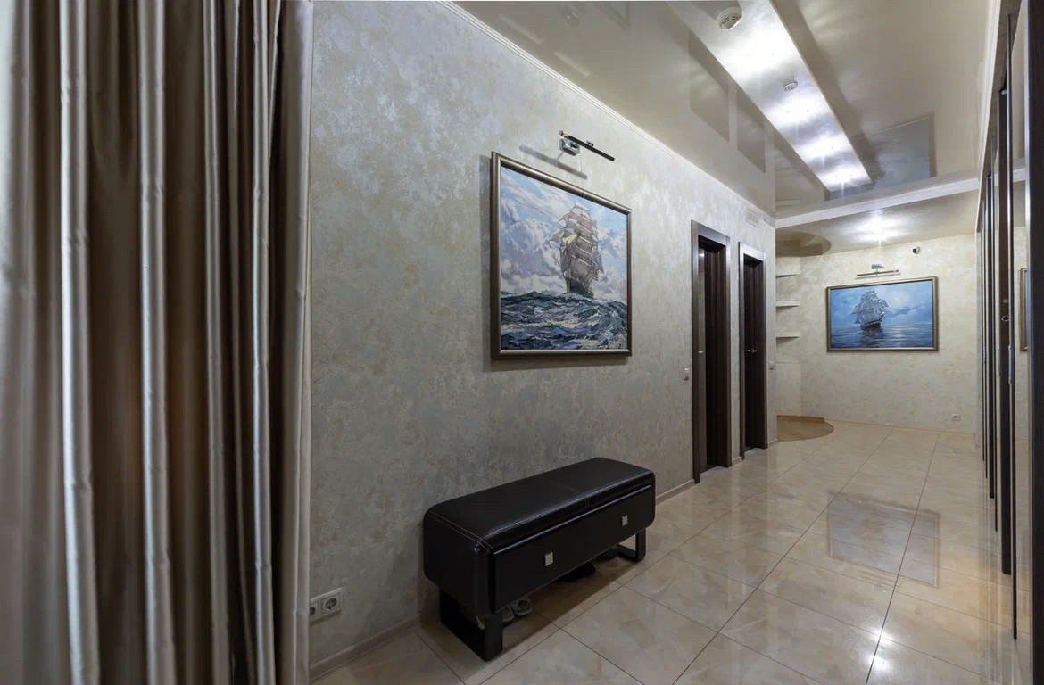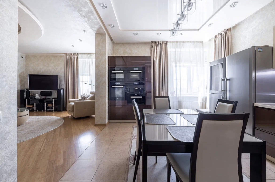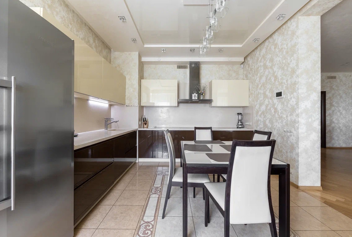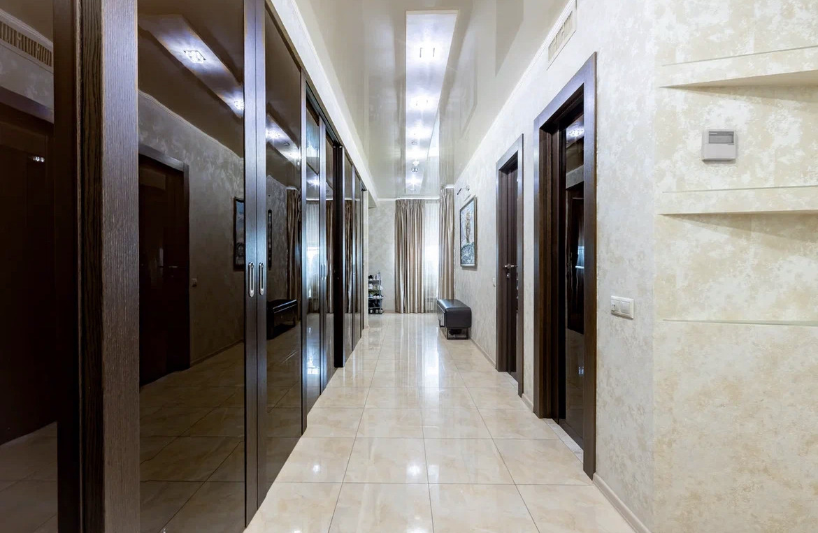 Квартира с дизайнерским ремонтом по индивидуальному проекту с использованием дорогостоящих натуральных материалов, в отделке использовались: натуральный мрамор, травертин, напольное покрытие - массив дерева. Обои Roberto Cavalli. Межкомнатные двери и шкафы Barausse SPA (Италия). Встроенная бытовая техника на кухне MIELE, Liebher, техника для стирки - Meile. В квартире установлена профессиональная музыка Denon, Fiber. Вся сантехника - Villeroy&Bosch. Мебель выполнена на заказ брендами Abici и Interlubke.