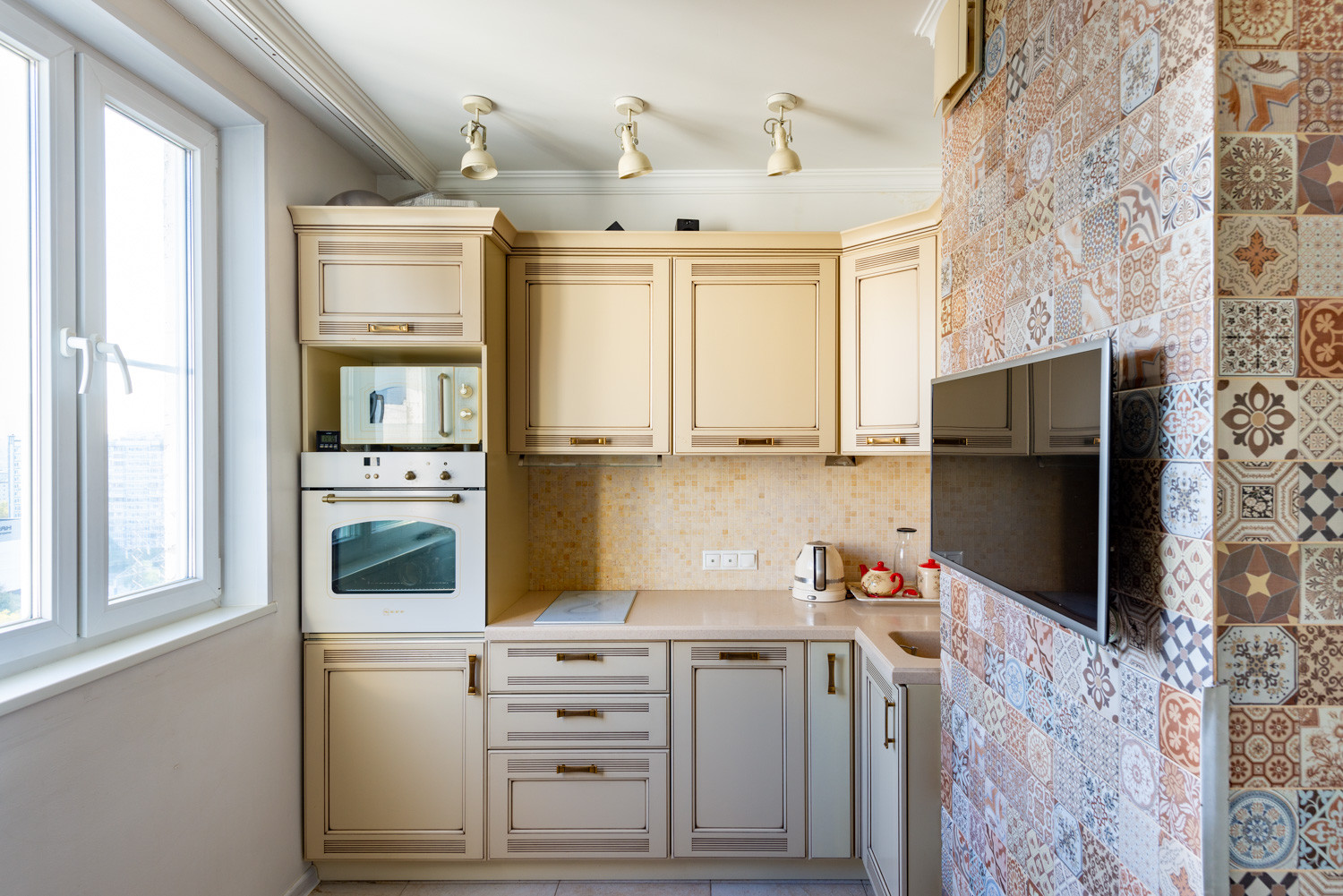 Кухонная техника: духовой шкаф Neff, посудомоечная машина Bosch, стиральная машина с сушкой Neff, индукционная варочная панель Gorenie, кухонная вытяжка, микроволновая печь Bosch, интегрированный фильтр для воды, большой холодильник Samsung
