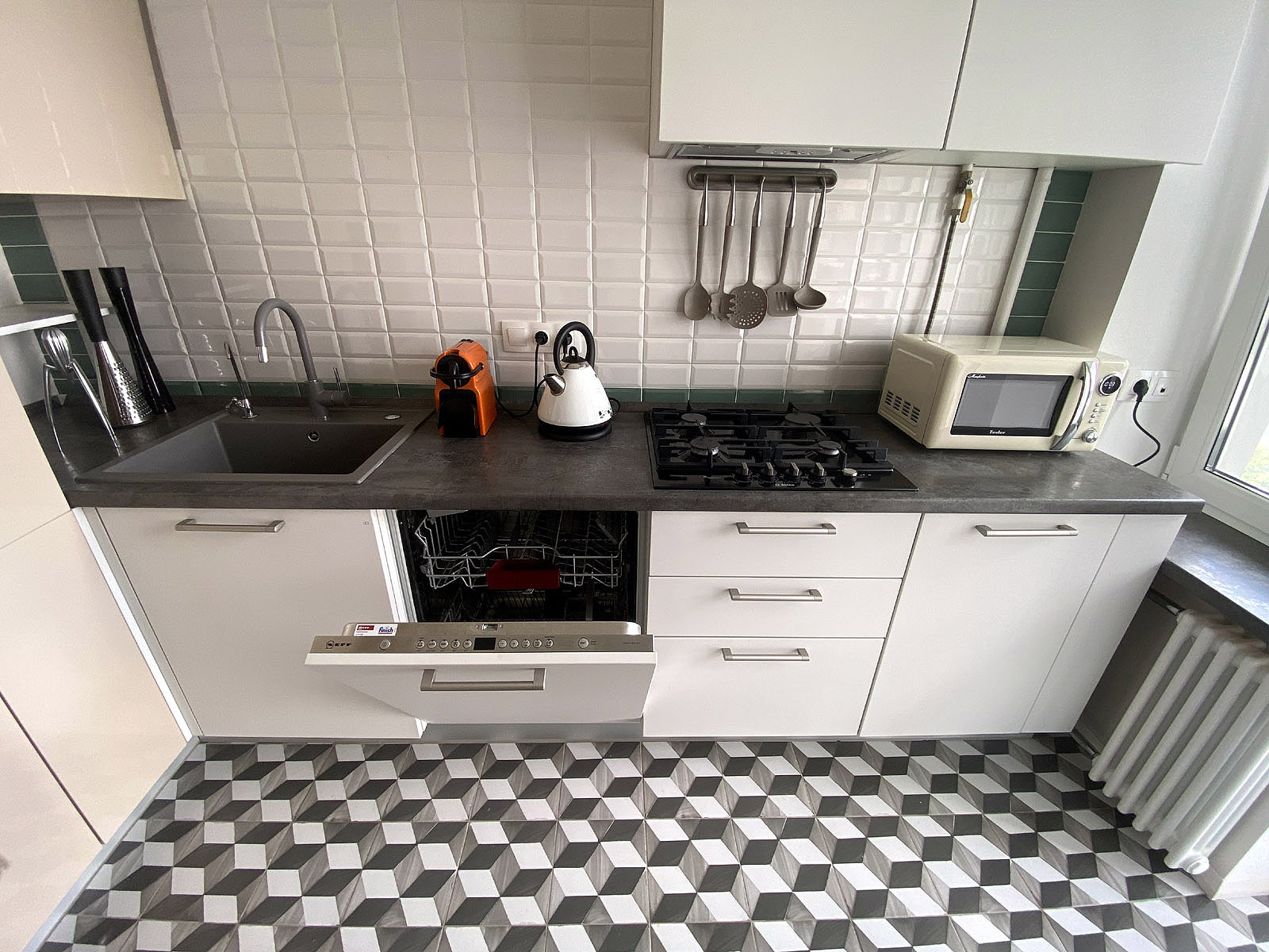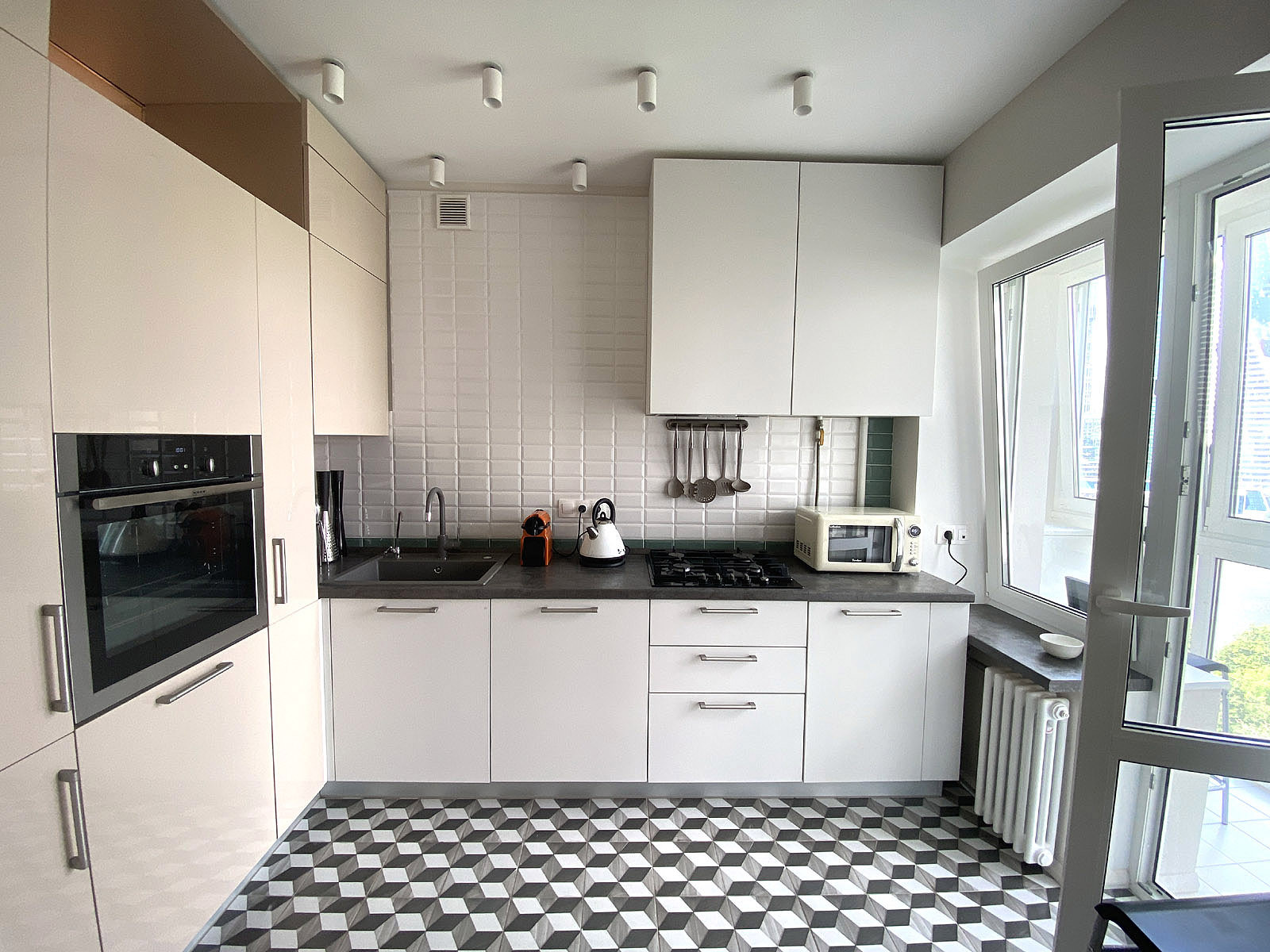 Встроенная кухня со всей необходимой бытовой техникой, включая посудомоечную машину, стационарный фильтр питьевой воды аквафор и встроенный измельчитель пищевых отходов.