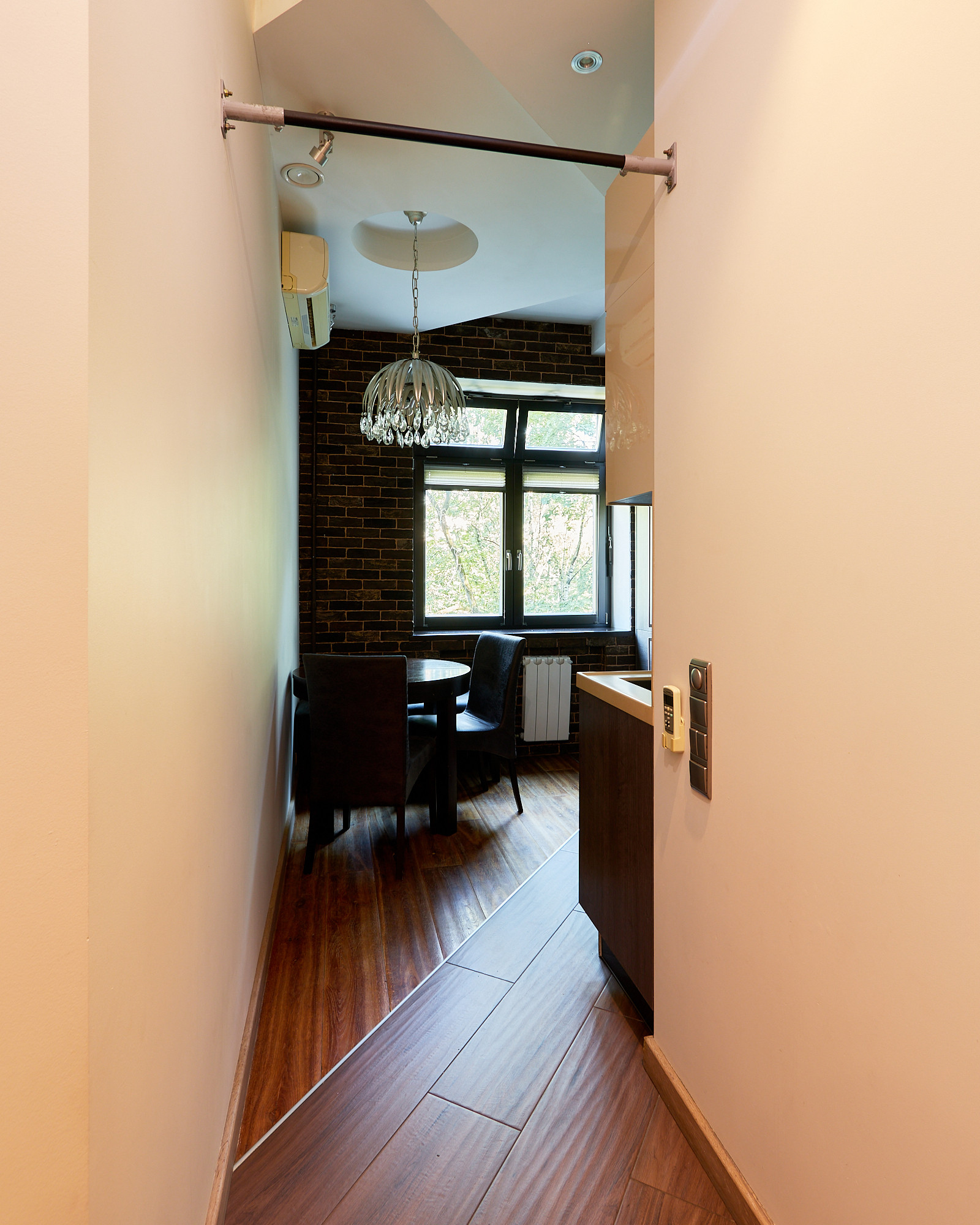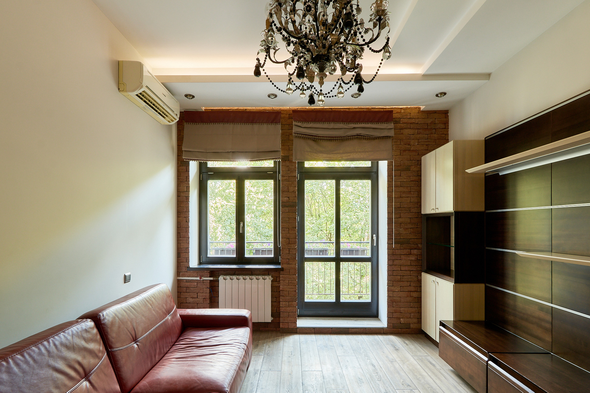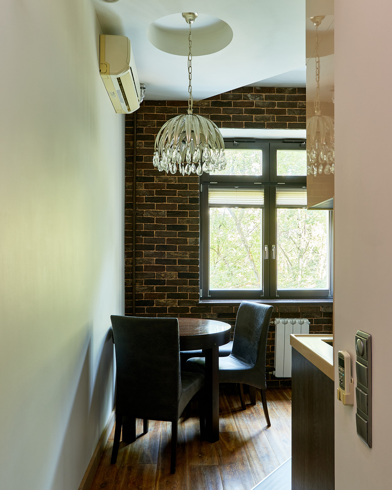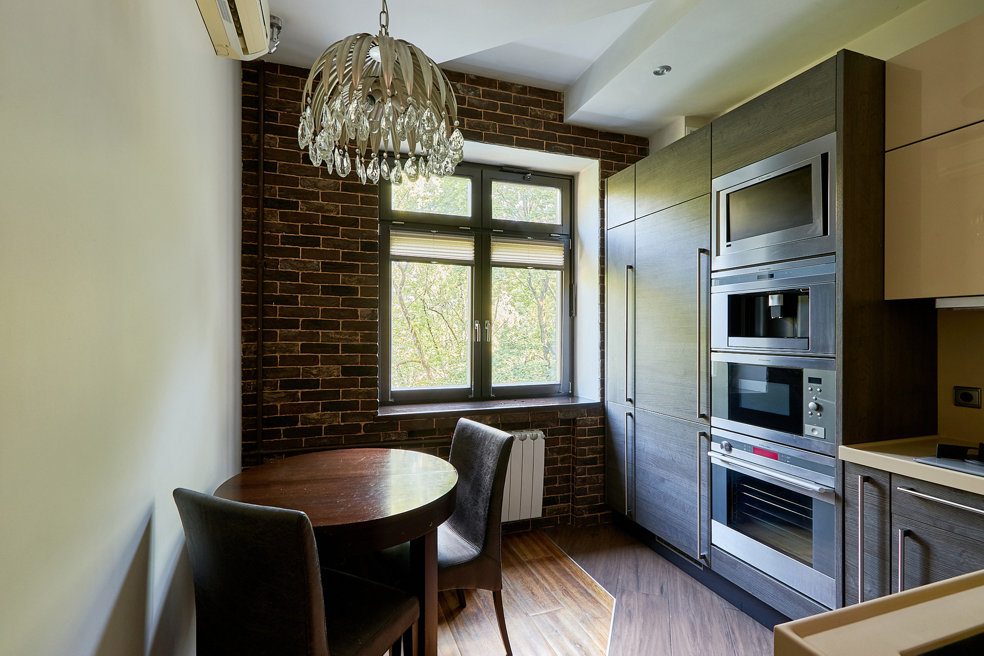 В качестве отделочных материалов использовались только дорогие качественные материалы. Стены покрашены с отделкой натуральным кирпичом ручной формовки Nelissen (Бельгия), натуральная массивная доска из дуба, деревянные стеклопакеты с фрамугами, деревянные межкомнатные двери, электрика АВВ, гардеробная шведской системы Elfa, розетки и выключатели Berker. В санузле итальянский керамогранит и плитка, душевая кабина Huppe (Германия) с каменным поддоном, смесители Grohe, чаша Villeroy & Boch, стиральная машина с сушкой Electrolux, столешница из искусственного камня Corian, вся разводка Rehau. Теплые полы в санузле и в зоне коридора. В квартире разведена приточная вентиляция, а также имеются кондиционеры Mitsubishi. В одной из комнат, на потолке уникальное дизайнерское решение по освещению в виде планет солнечной системы с авторской росписью (в реальности красивее, чем на фото). Балкон с кованными перилами по индивидуальному проекту и дополнительными элементами для освещения.