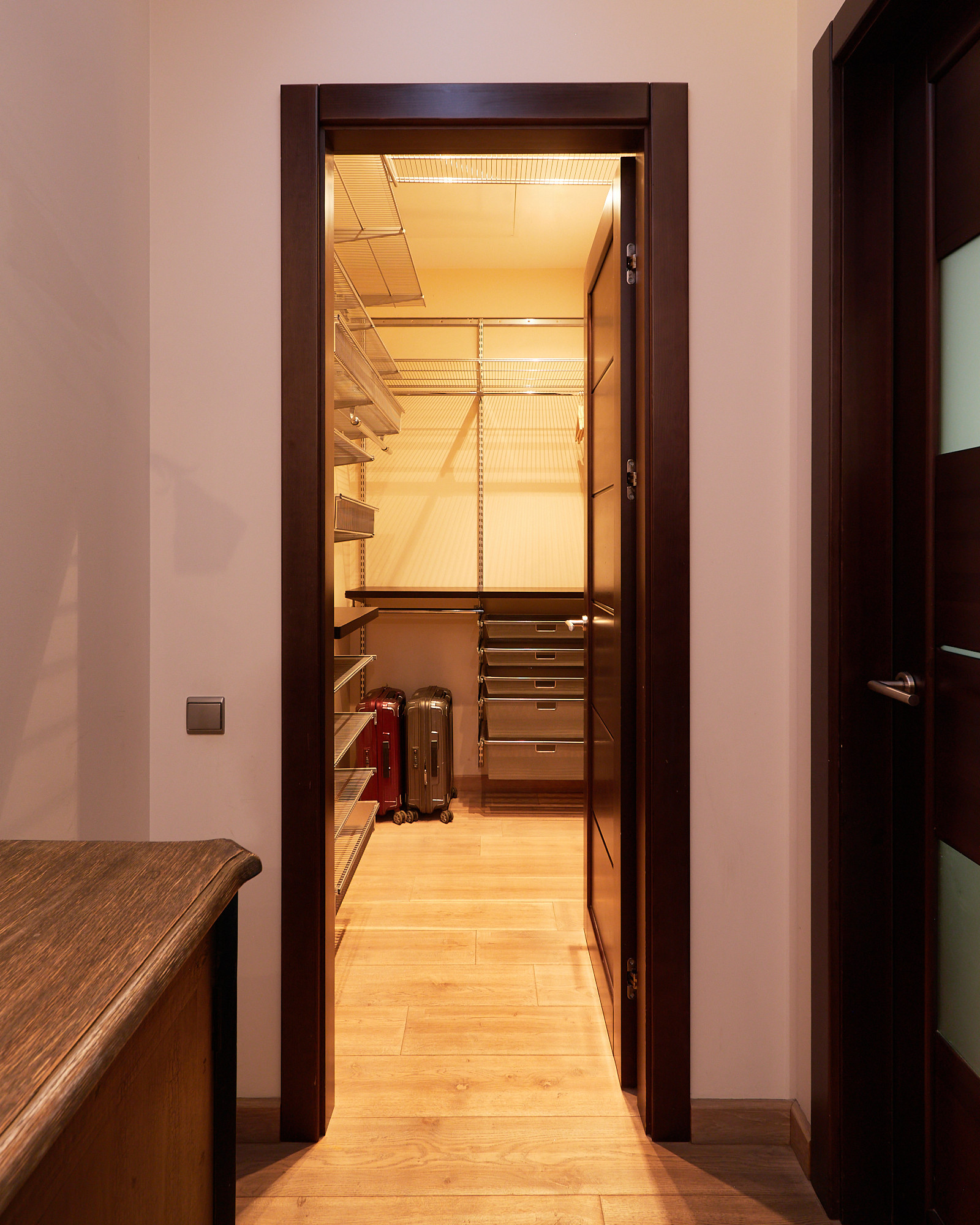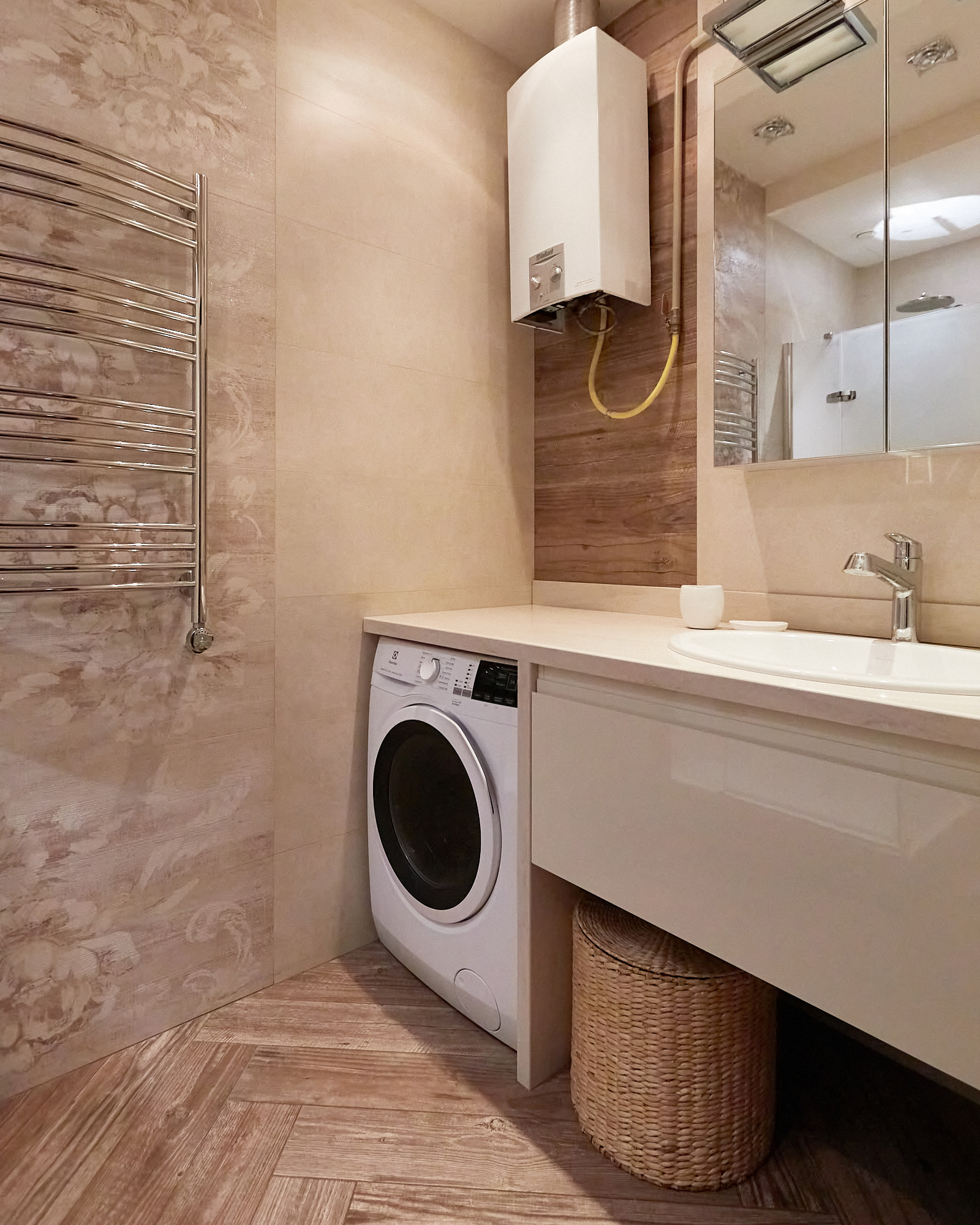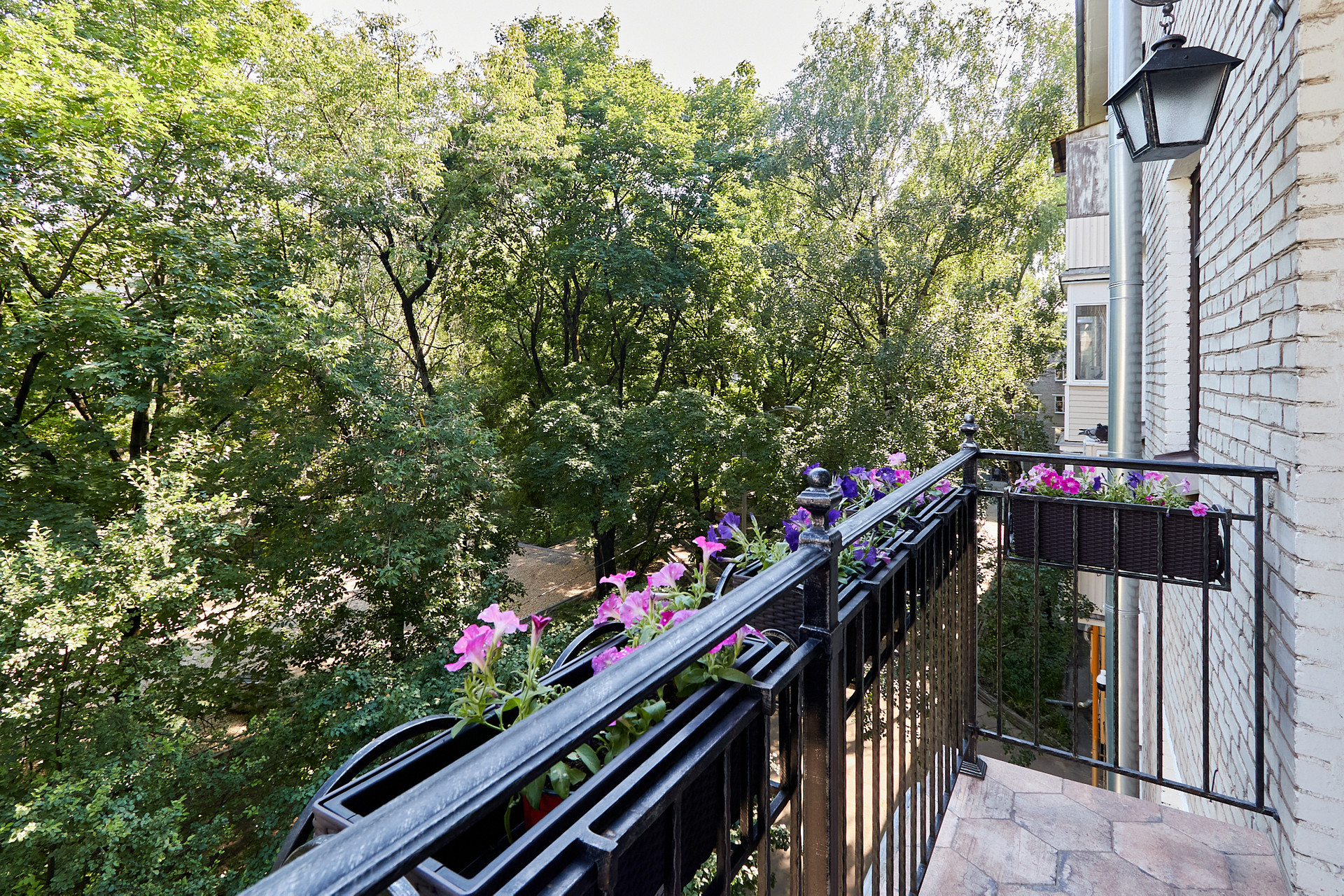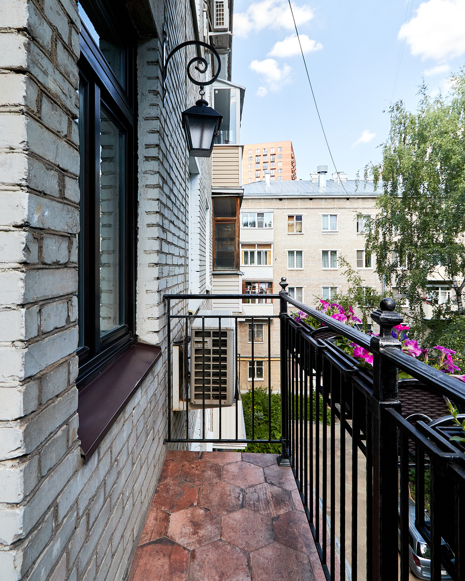 В качестве отделочных материалов использовались только дорогие качественные материалы. Стены покрашены с отделкой натуральным кирпичом ручной формовки Nelissen (Бельгия), натуральная массивная доска из дуба, деревянные стеклопакеты с фрамугами, деревянные межкомнатные двери, электрика АВВ, гардеробная шведской системы Elfa, розетки и выключатели Berker. В санузле итальянский керамогранит и плитка, душевая кабина Huppe (Германия) с каменным поддоном, смесители Grohe, чаша Villeroy & Boch, стиральная машина с сушкой Electrolux, столешница из искусственного камня Corian, вся разводка Rehau. Теплые полы в санузле и в зоне коридора. В квартире разведена приточная вентиляция, а также имеются кондиционеры Mitsubishi. В одной из комнат, на потолке уникальное дизайнерское решение по освещению в виде планет солнечной системы с авторской росписью (в реальности красивее, чем на фото). Балкон с кованными перилами по индивидуальному проекту и дополнительными элементами для освещения.