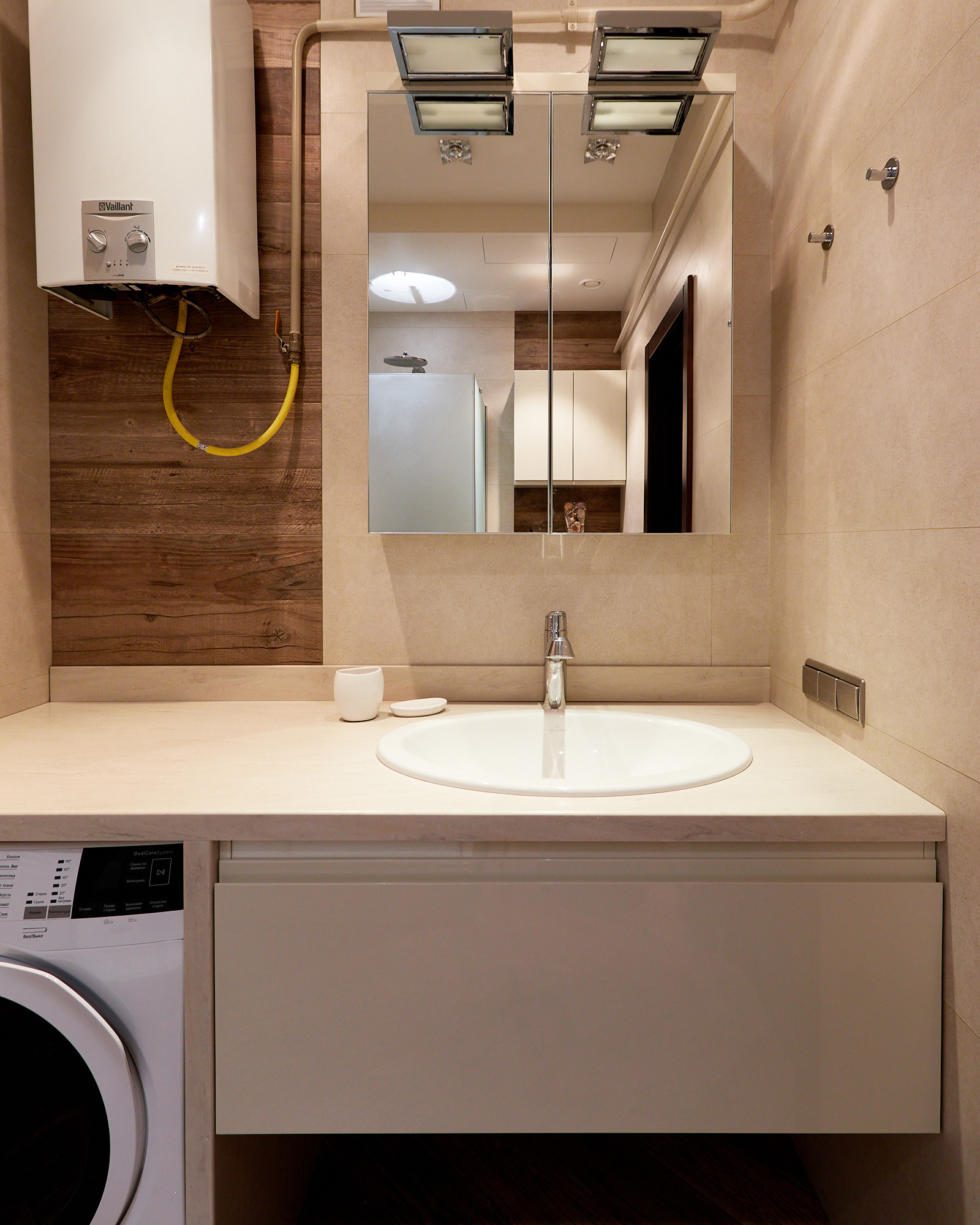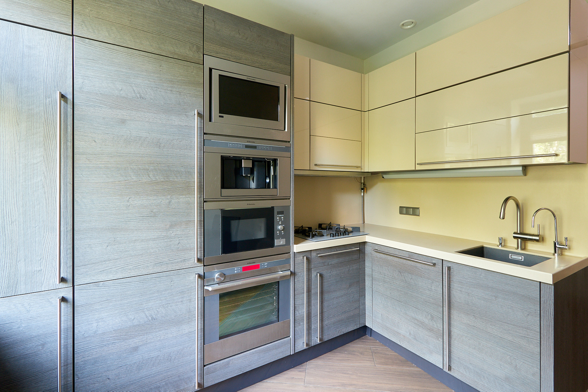Кухня BAUFORMAT премиум-класса (Германия). Встроенная техника Electrolux: духовой шкаф, CBЧ, кофемашина, телевизор, стеклянная варочная панель на 4 предмета (газ), посудомоечная машина на 60 см., вытяжка. Встроенный холодильник Liebherr. Исключительно удобное и красивое решение цельная столешница и фартук из искусственного камня Corian во всему периметру со встроенной мойкой Blanco из камня Silgranit.