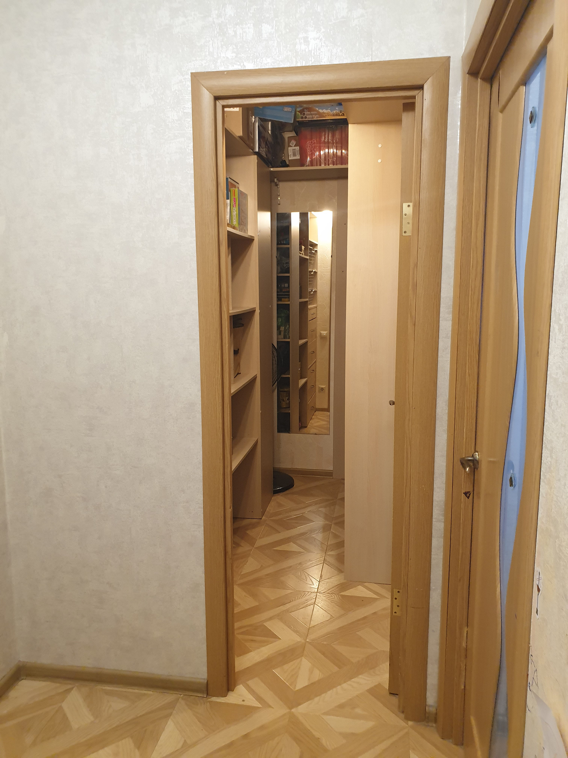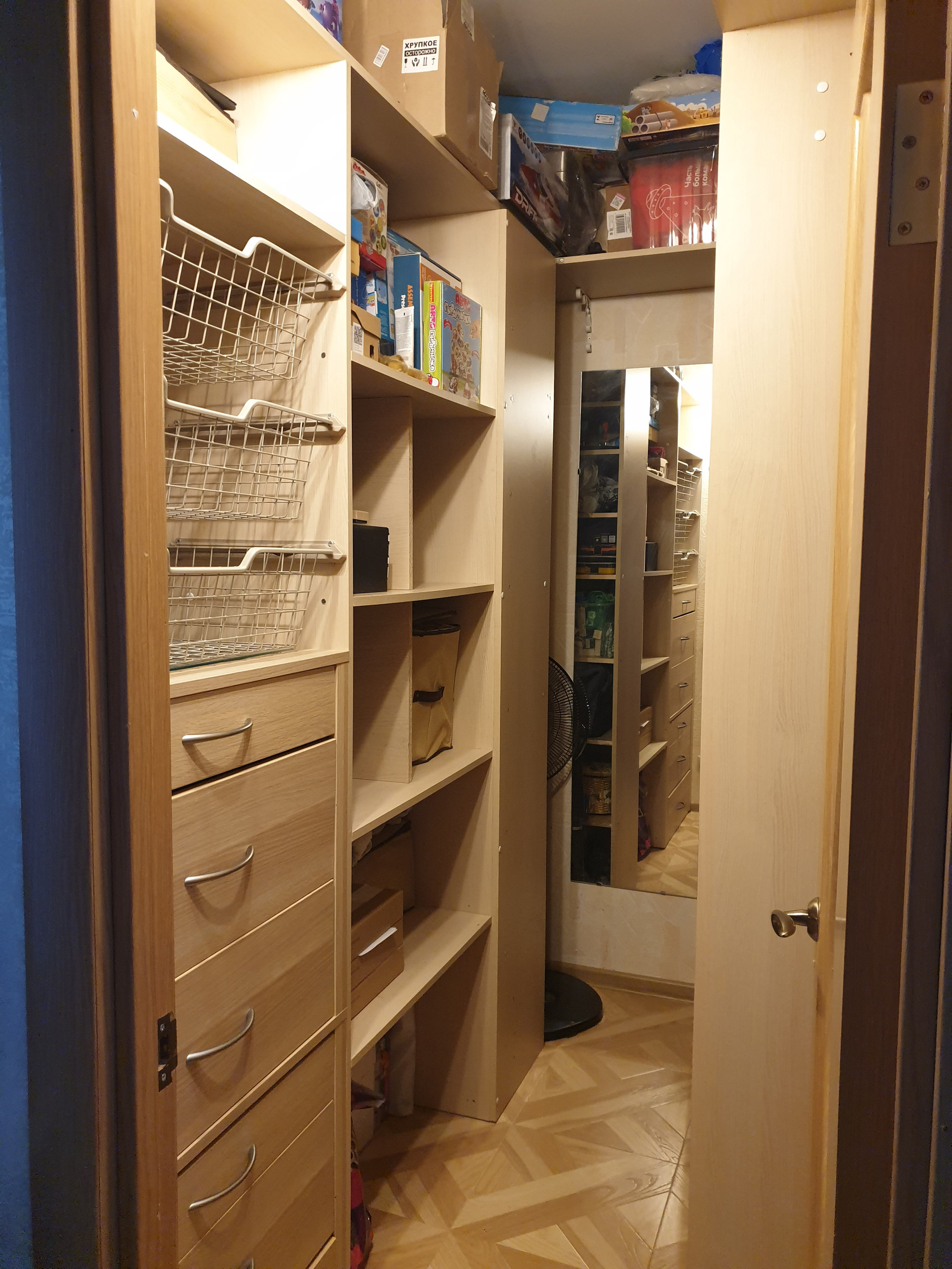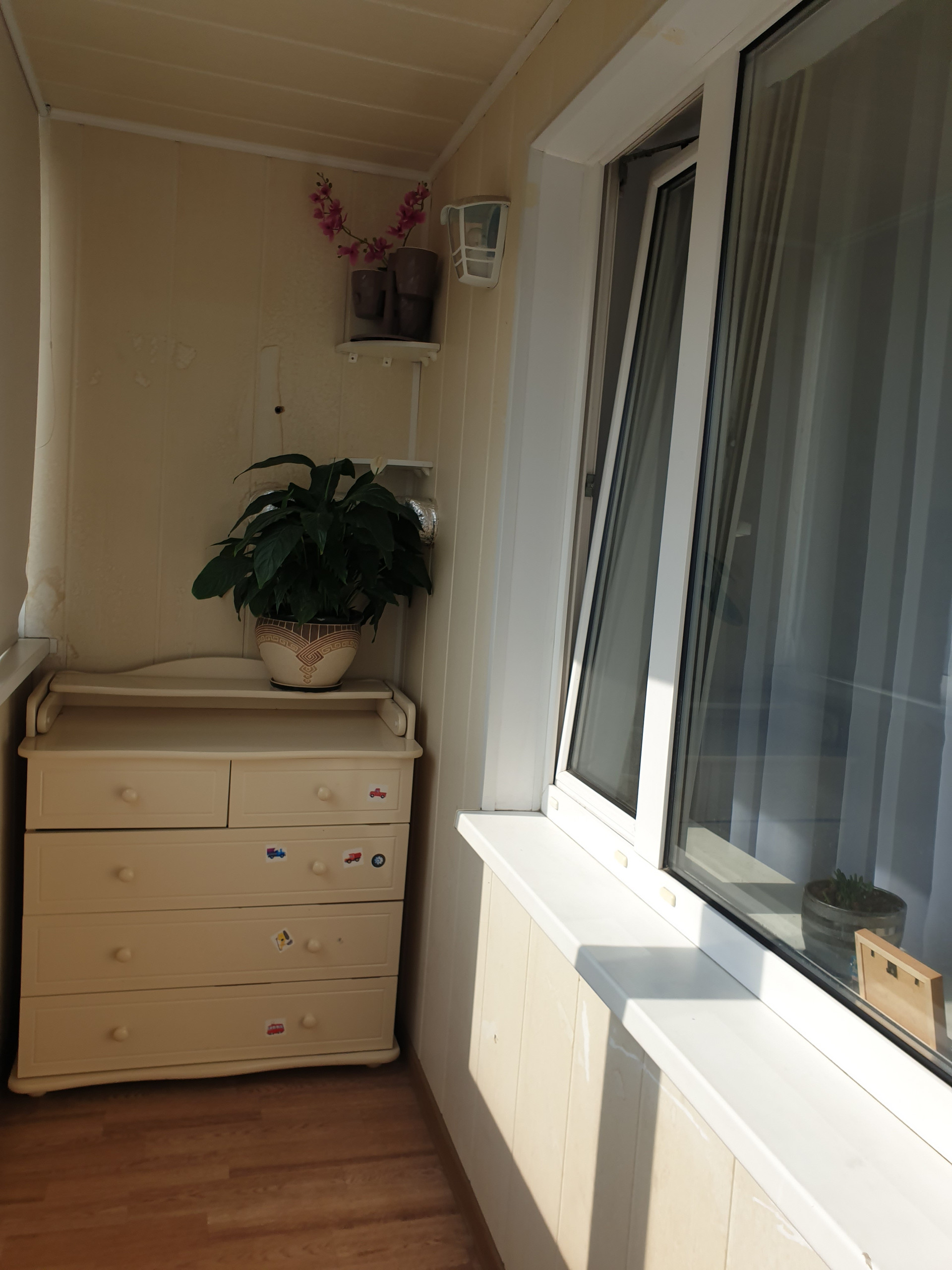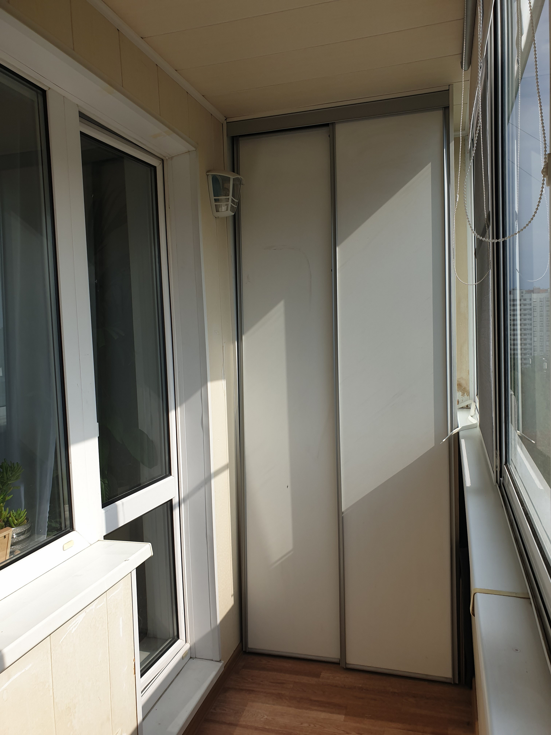 На 4х метровой лоджии встроенный шкаф и проведено освещение.