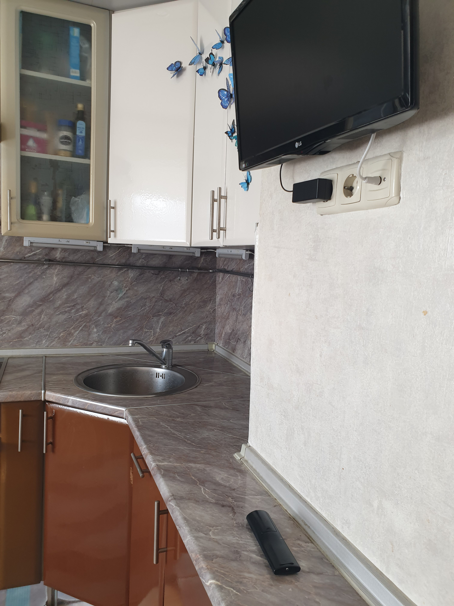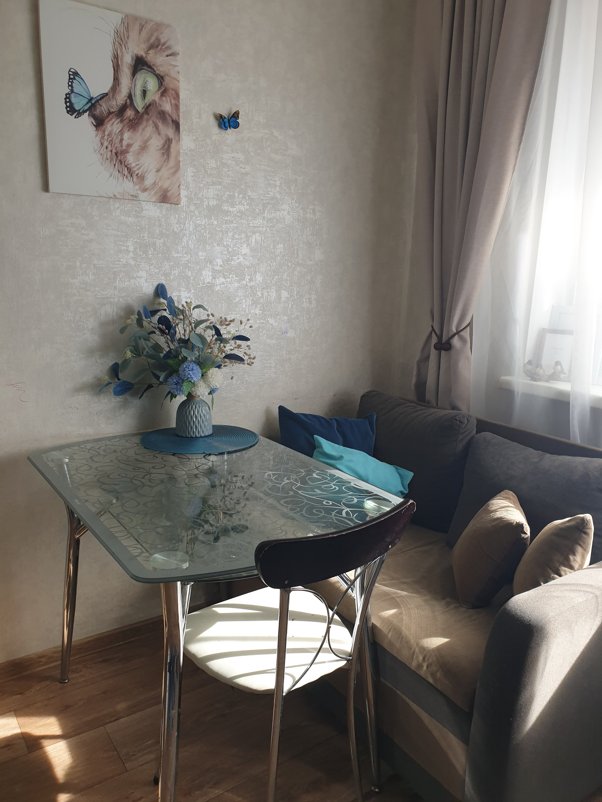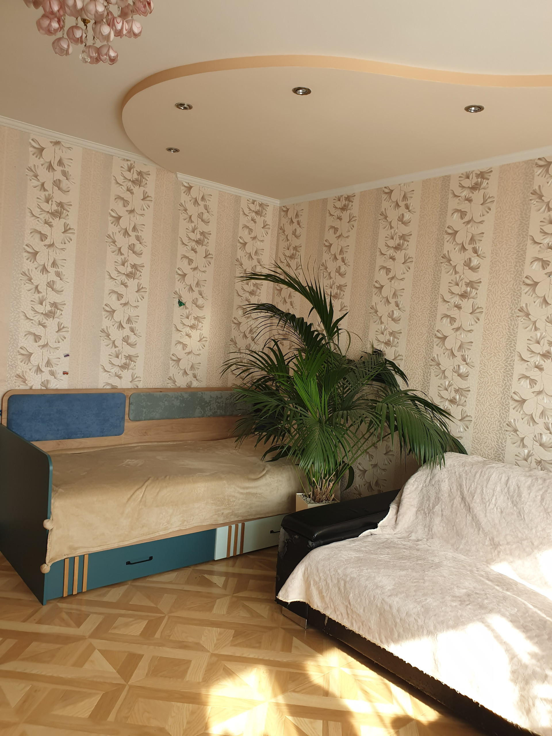 Ламинат во всей квартире (кроме кухни), чистые потолки, скрытая проводка (болтающиеся провода отсутствуют), много розеток.