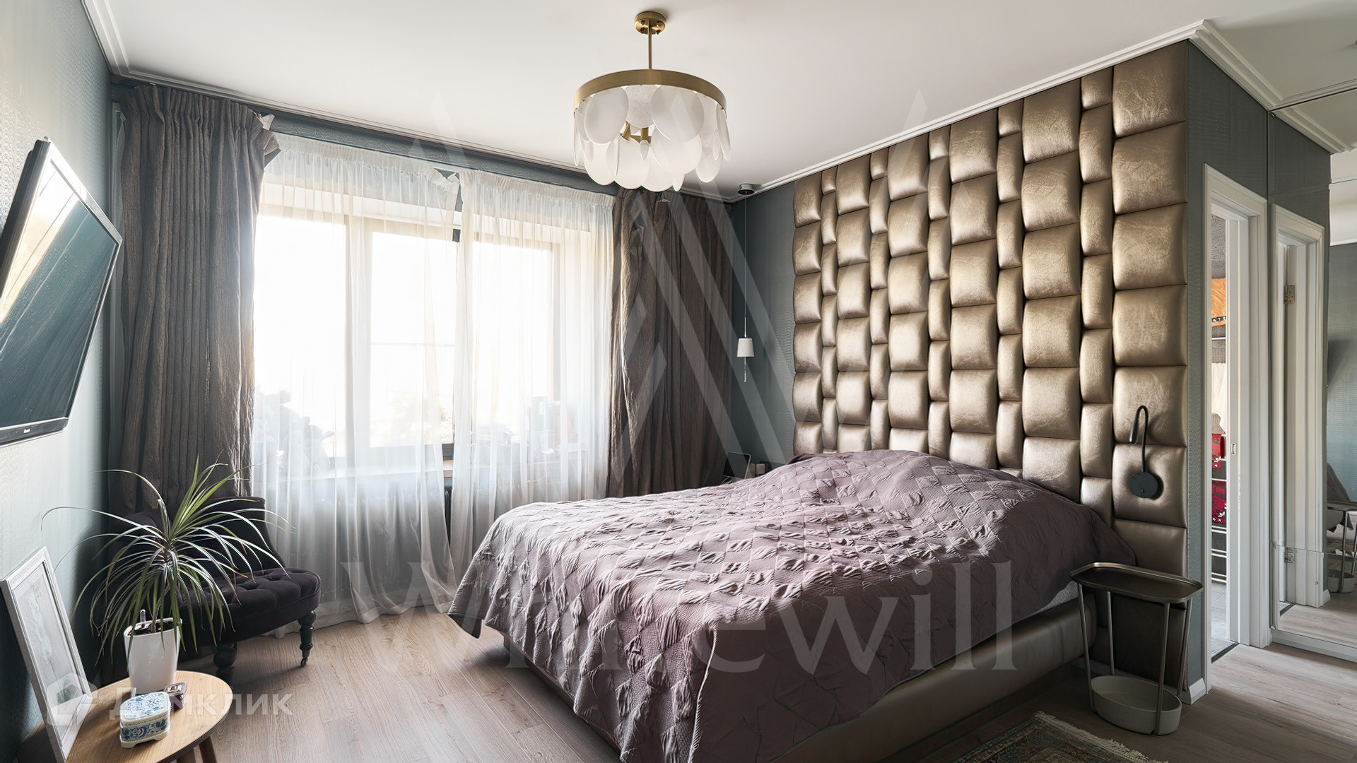 Планировочное решение включает просторную кухню-гостиную площадью 35 м², мастер-спальню со своей гардеробной и ванной с окном, гостевой санузел, холл. Благодаря широкоформатным окнам пространство наполнено естественным светом и теплом, открываются виды на Комсомольский проспект и Храм святителя Николая Чудотворца.