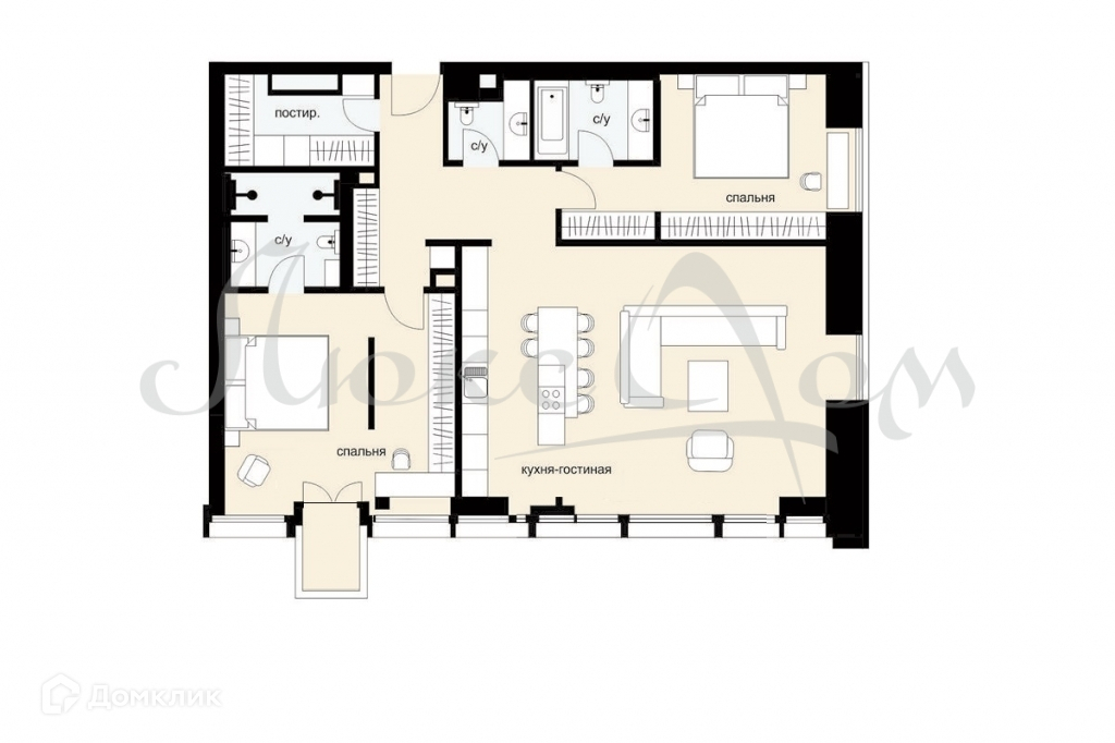 Планировка: кухня-гостиная, 2 мастер спальни с гардеробной и с/у, гостевой с/у.