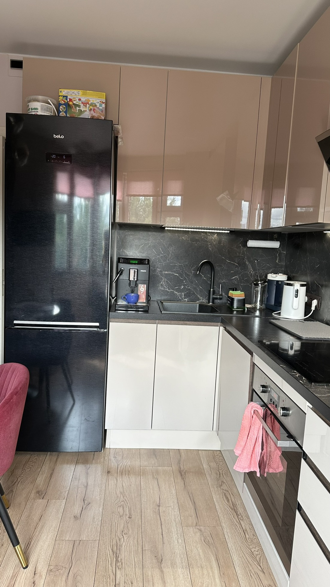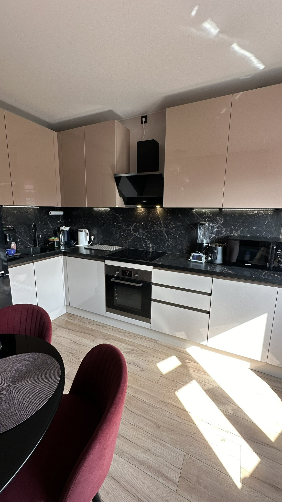 Кухня с эркером. Новый кухонный гарнитур не массового сегмента по индивидуальному проекту с подсветкой рабочей зоны и встроенной техникой западных брендов (вытяжка, посудомоечная машина, индукционная плита и духовка).