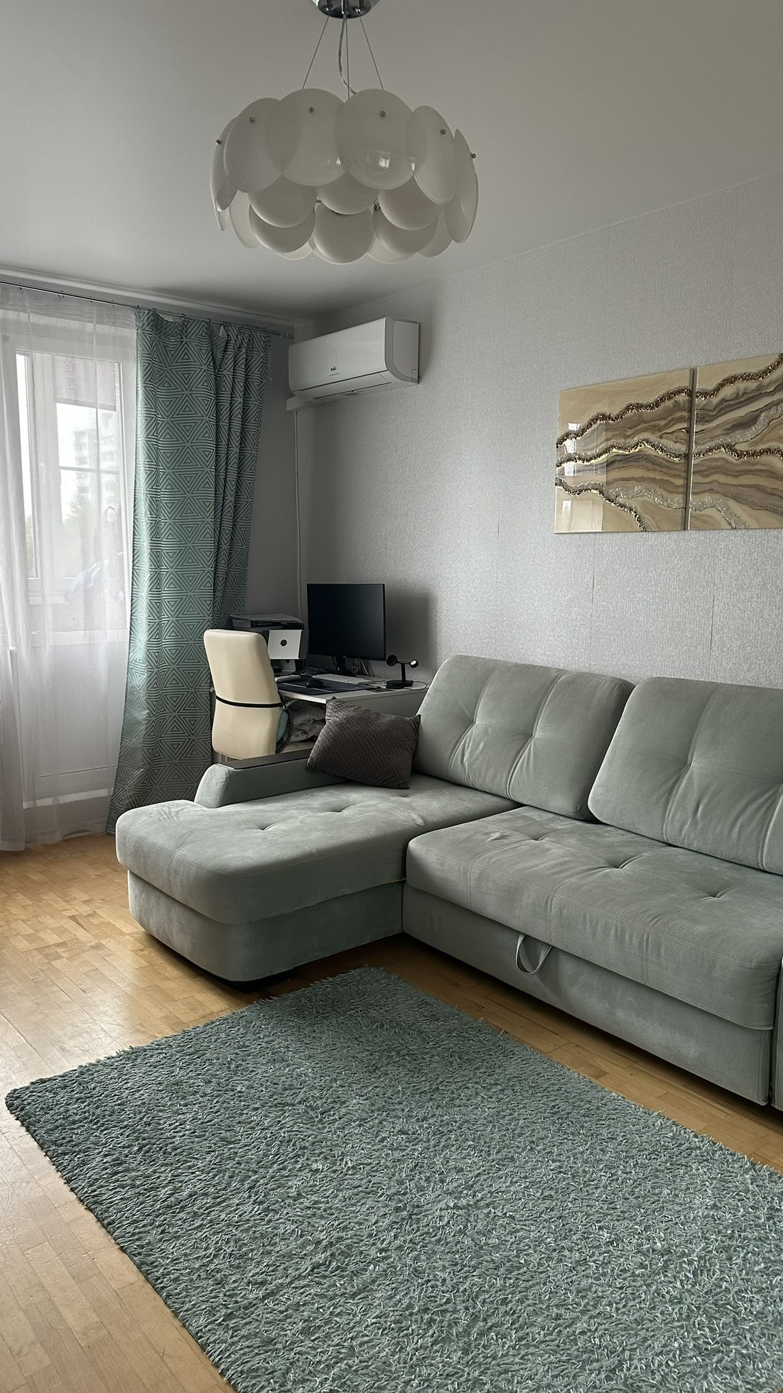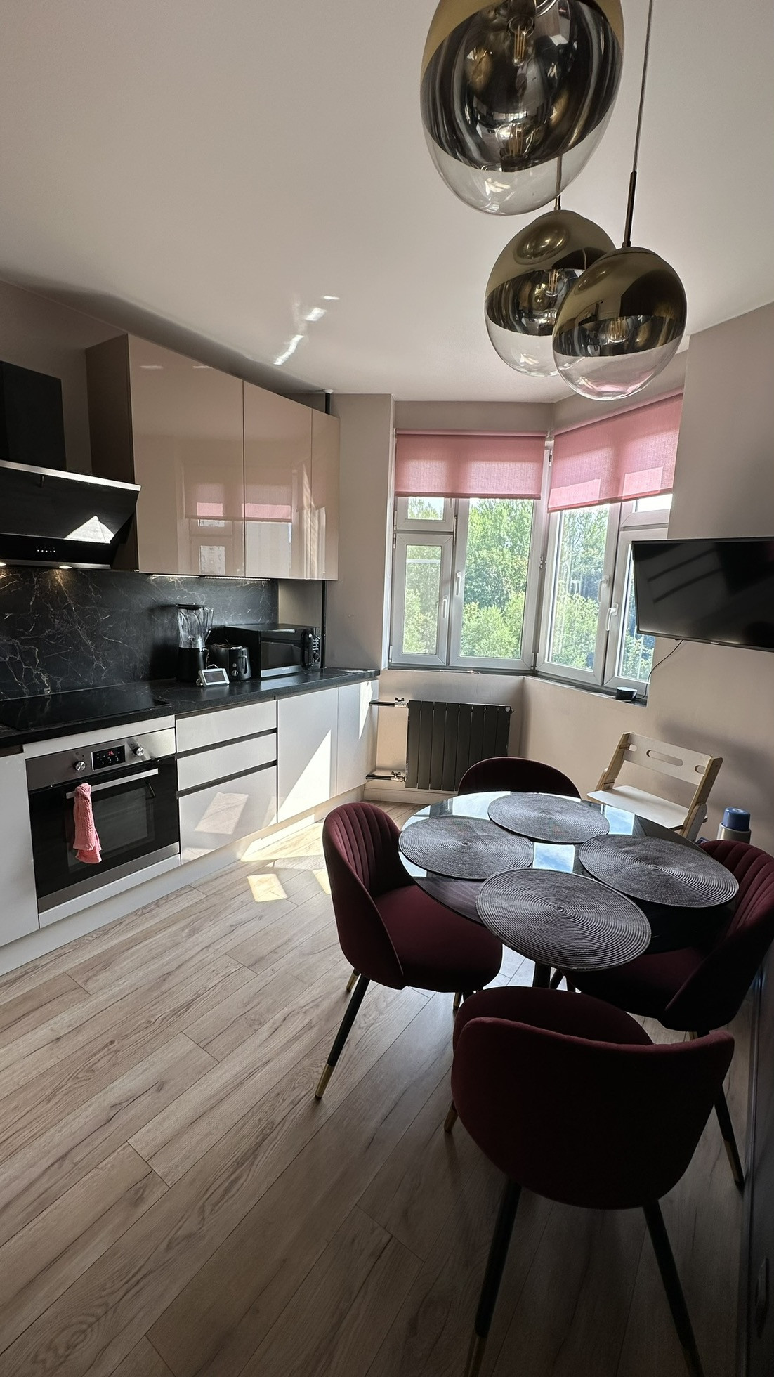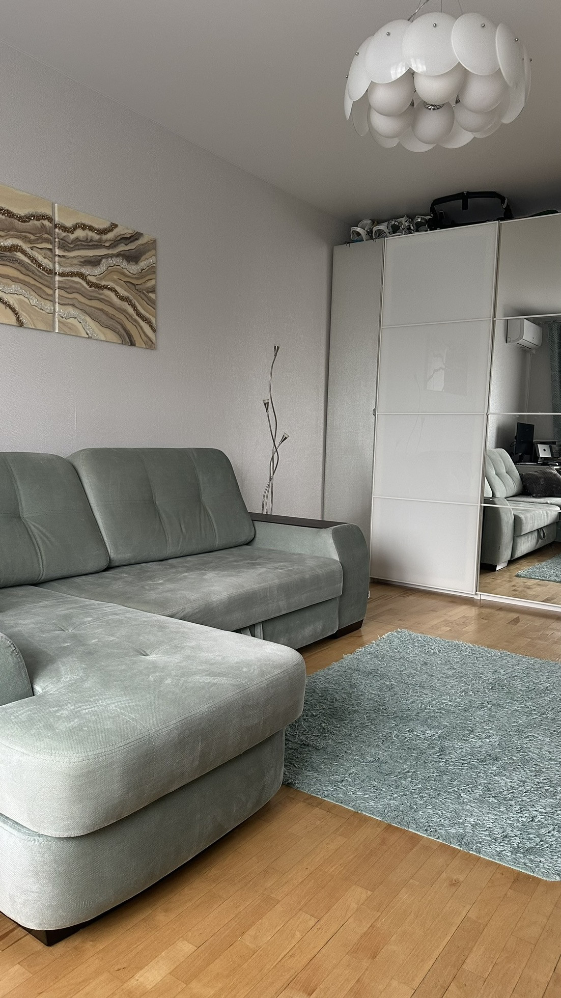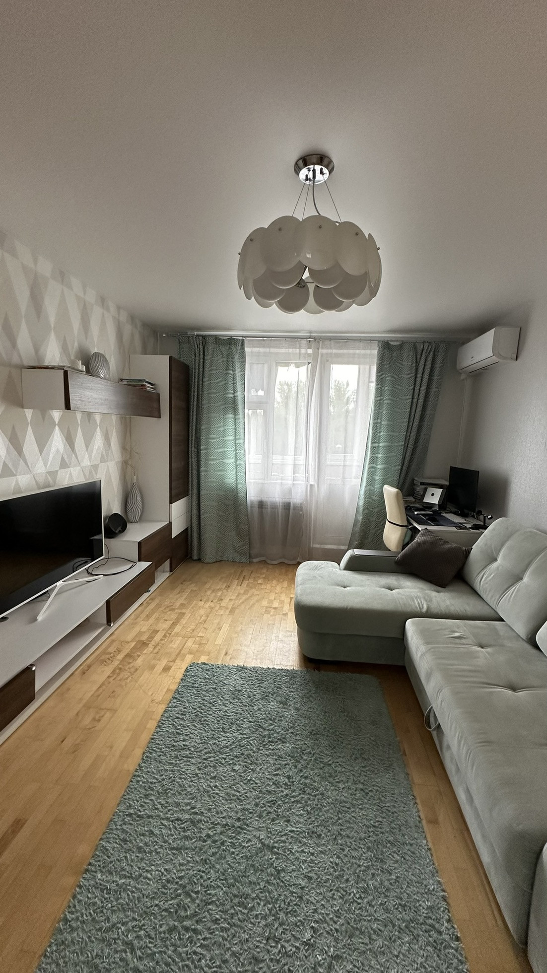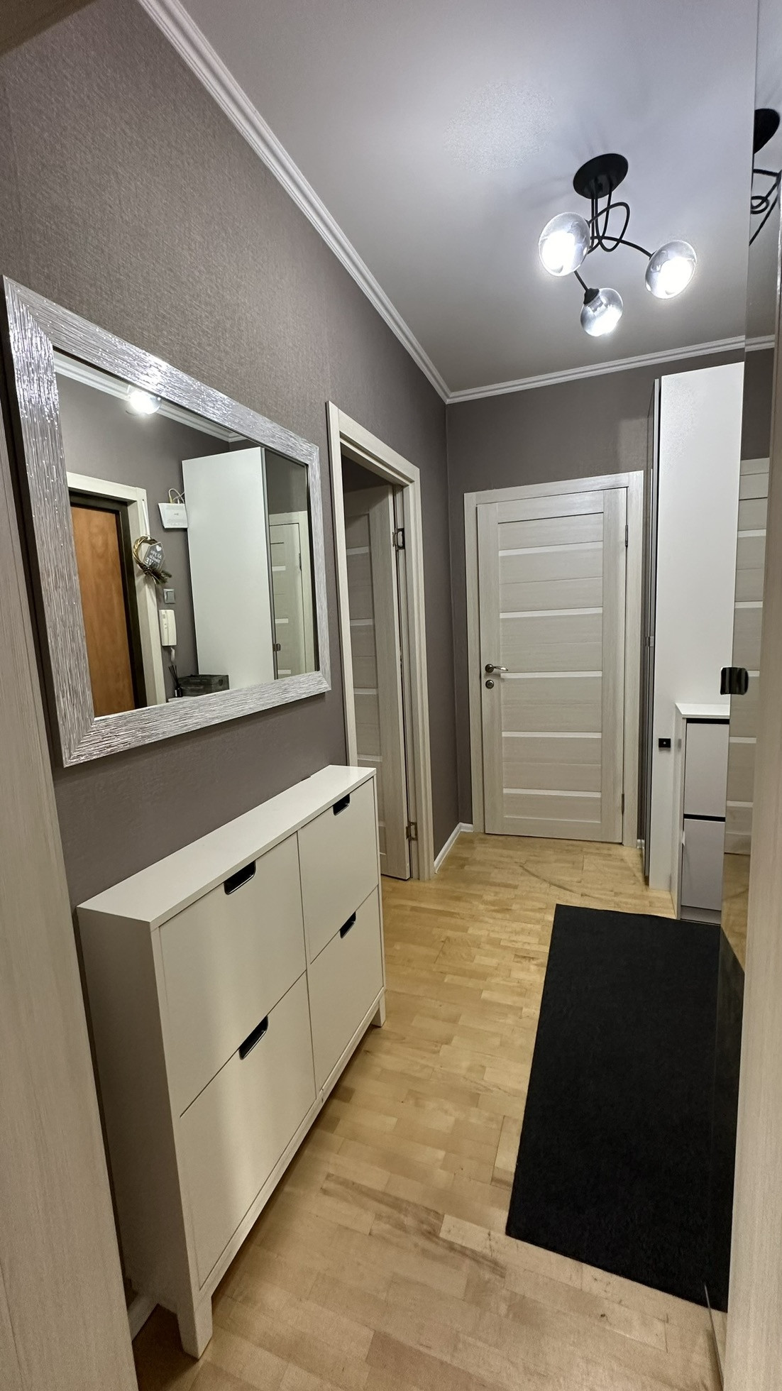 Свежий ремонт, натяжные потолки во всех комнатах, кухне, ванной и туалете. Стены с обоями или покрашены в нейтральные цвета. Два кондиционера в спальне и в гостиной. Поменяны все батареи радиаторы во всех комнатах на новые премиальной фирмы Royal Therma. Летом 2024 года заменены приточные клапаны вентиляции.