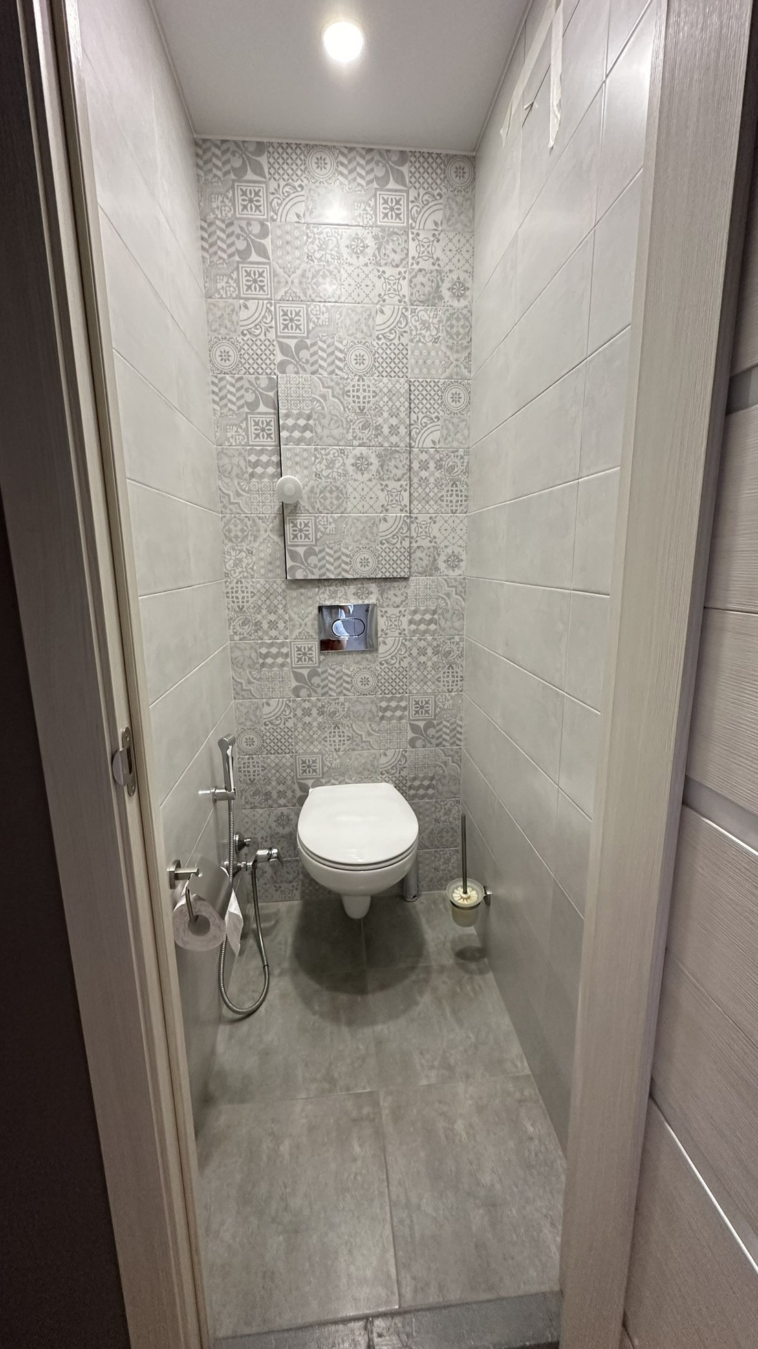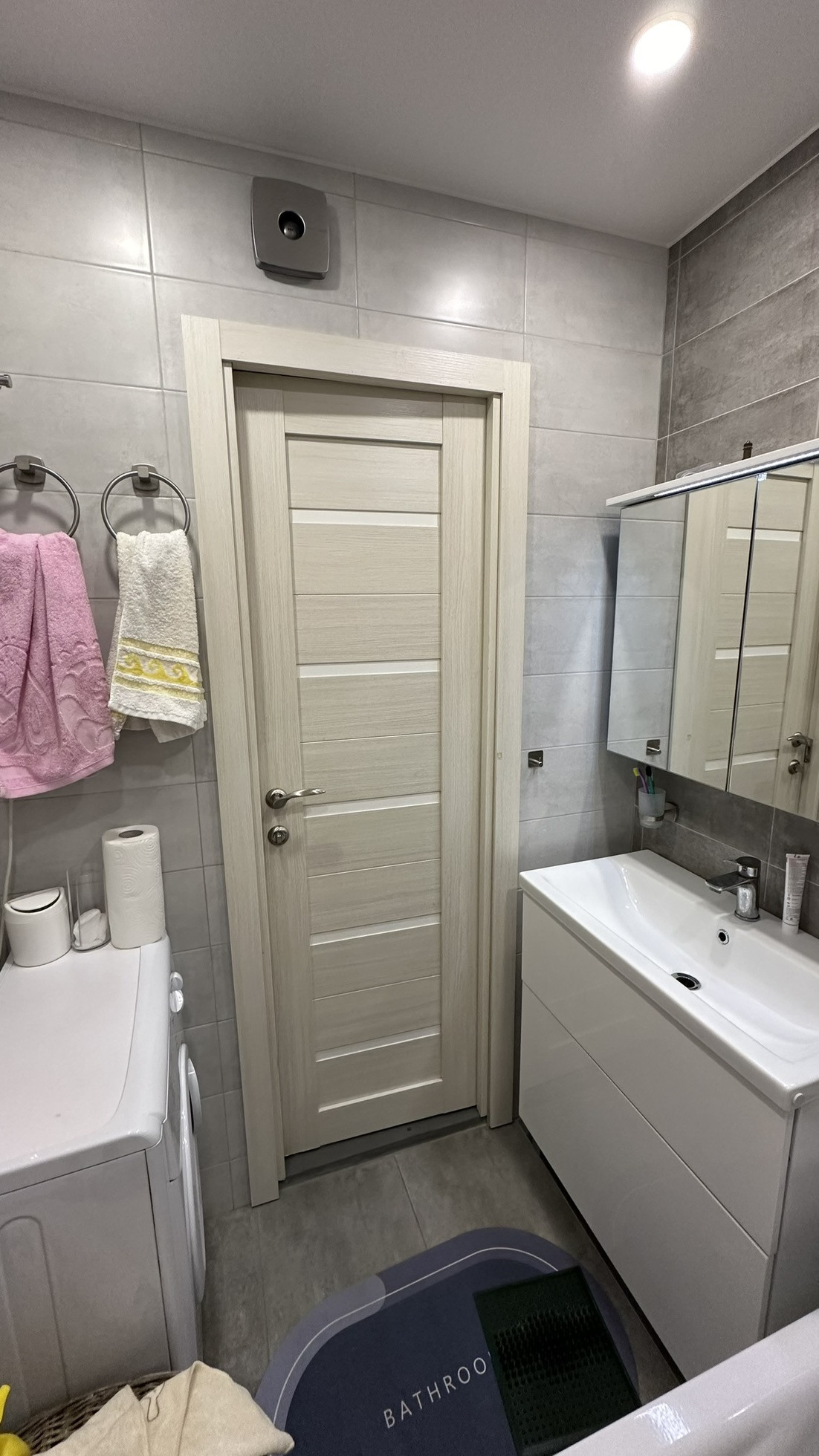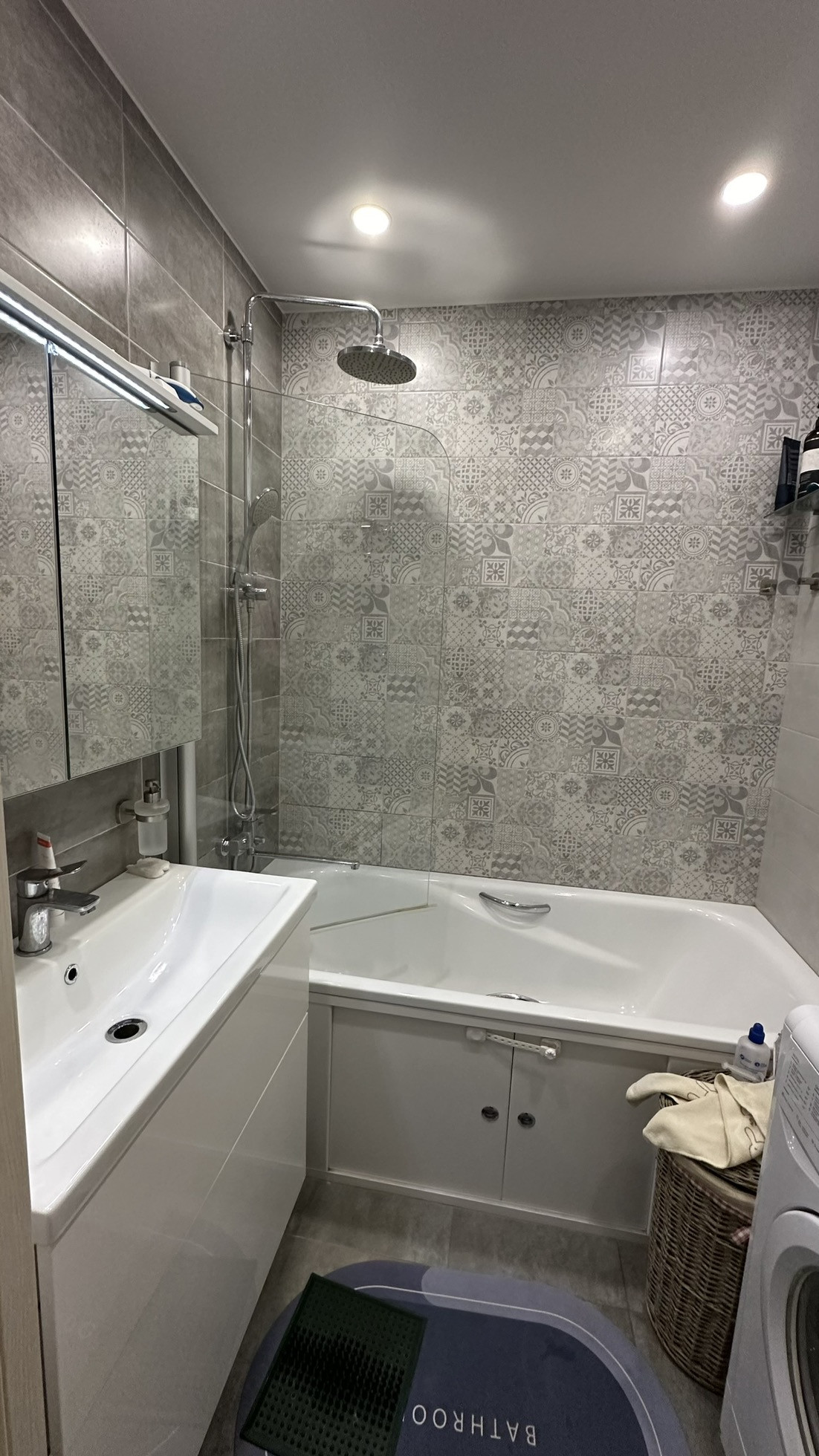 Свежеоотремонтированный чистый и светлый санузел с ванной, стеклянной шторкой, тропическим душем, полотенцесушителем, гигиеническим душем, водонагревателем, встроенным в хозблок за большим лючком.
