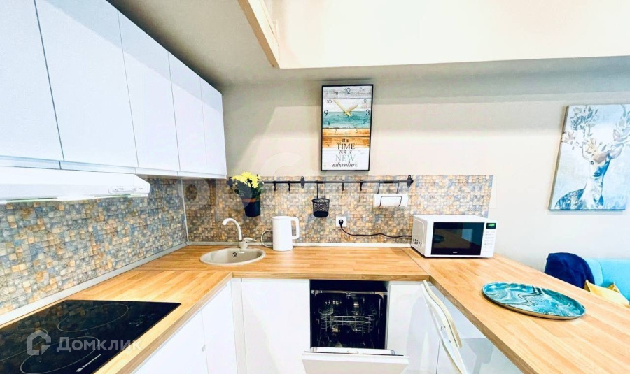 Студия оборудована всем необходимым для жизни, в том числе стиральной и посудомоечной машиной, большой варочной поверхностью, чайником, микроволновкой, пылесосом, телевизором, хорошей вытяжкой.