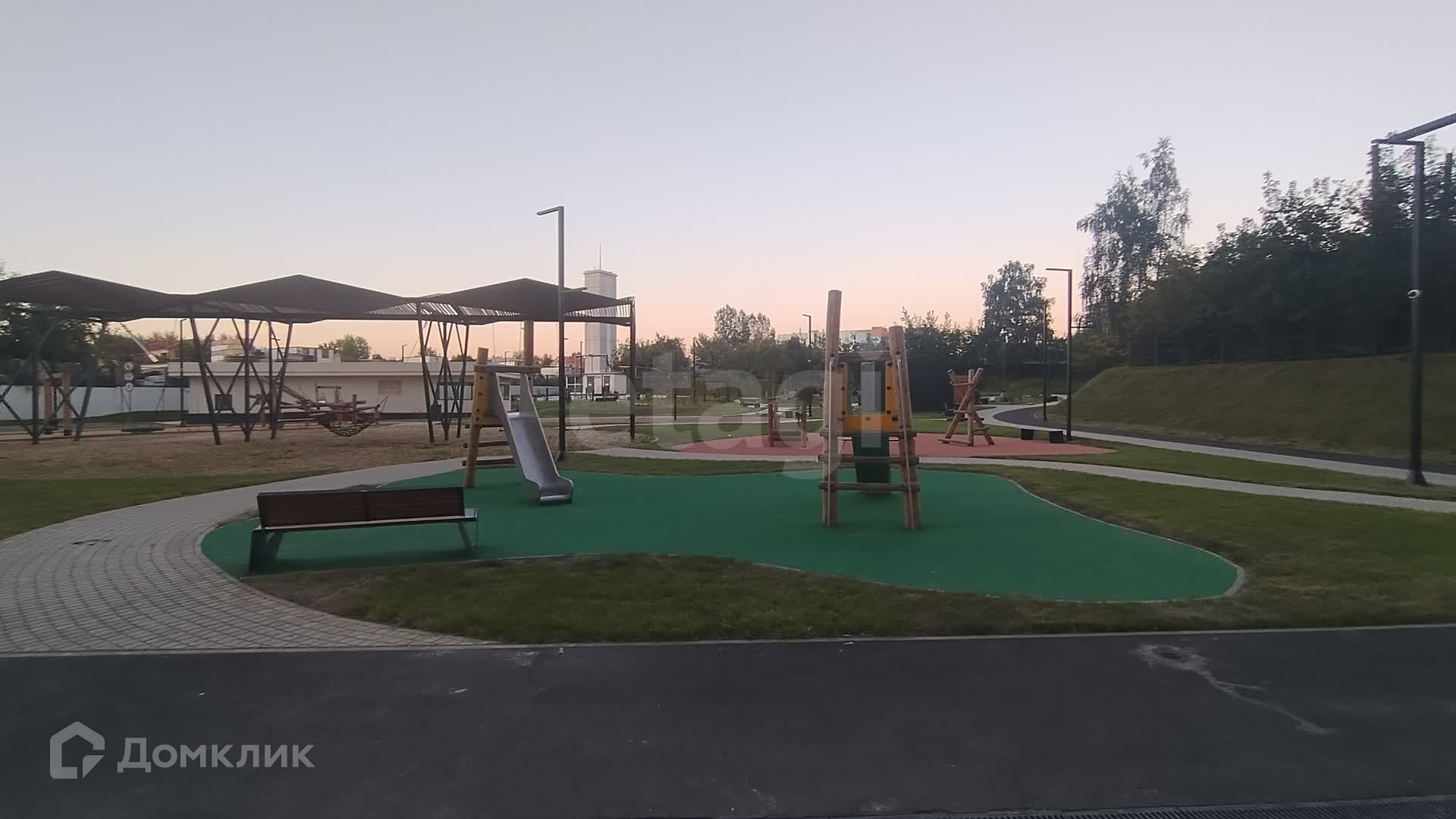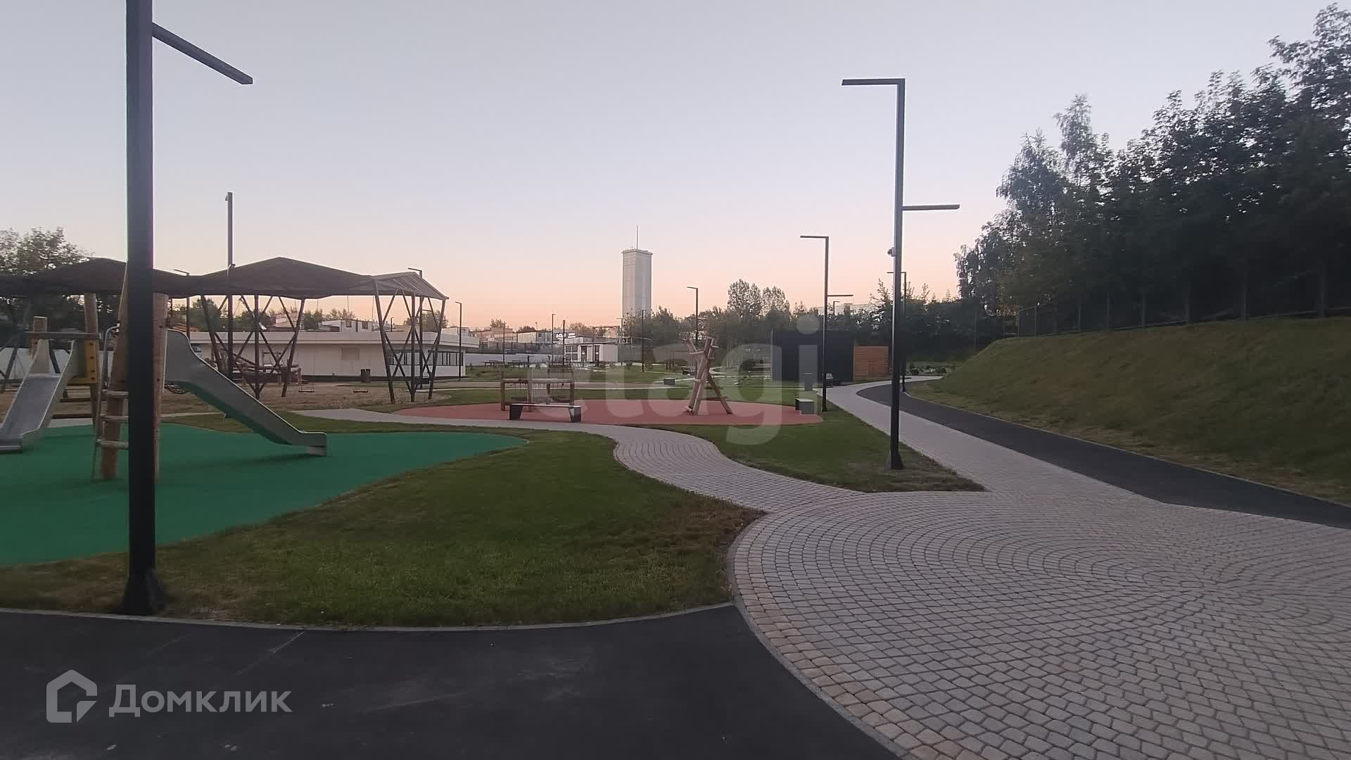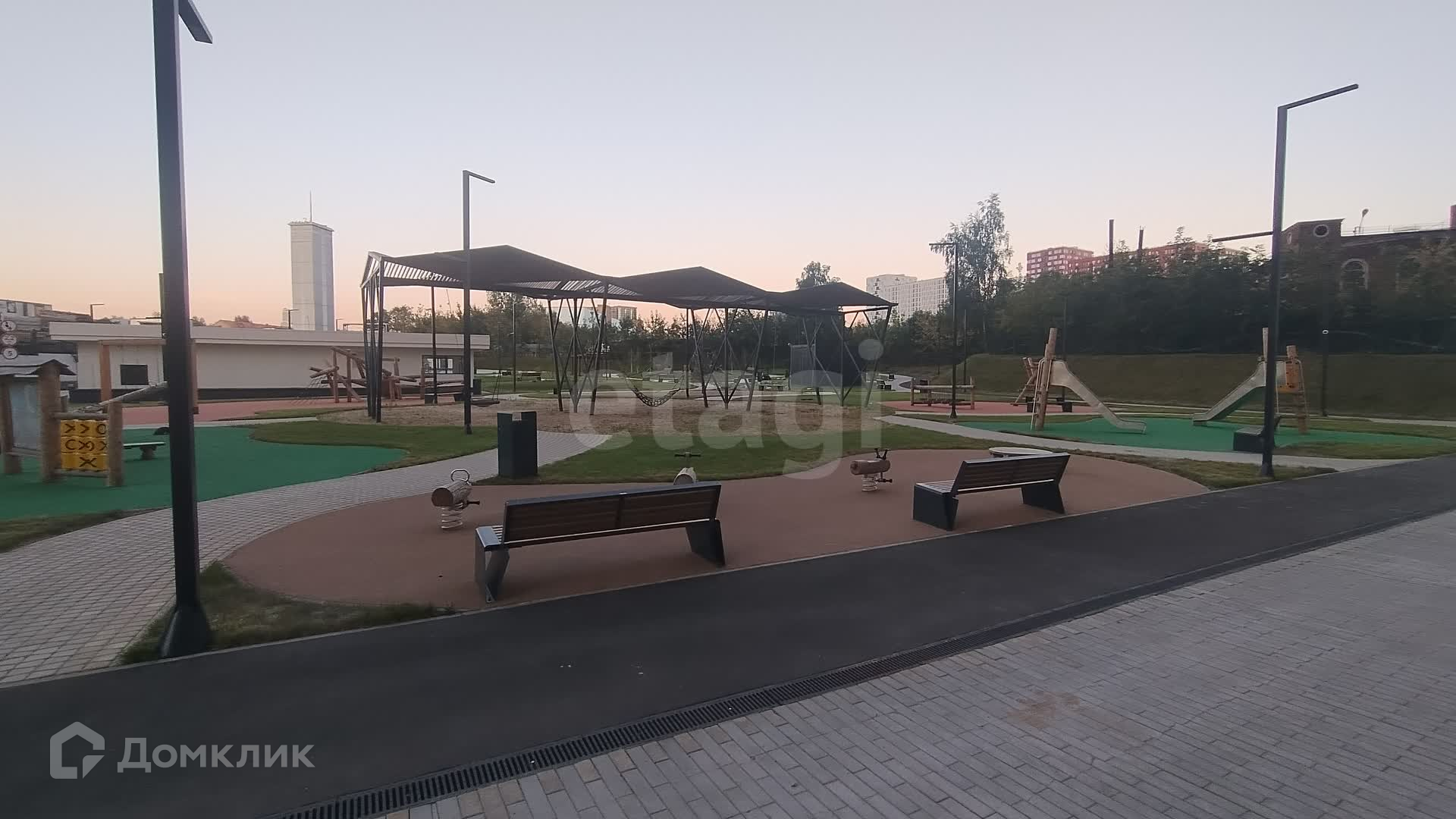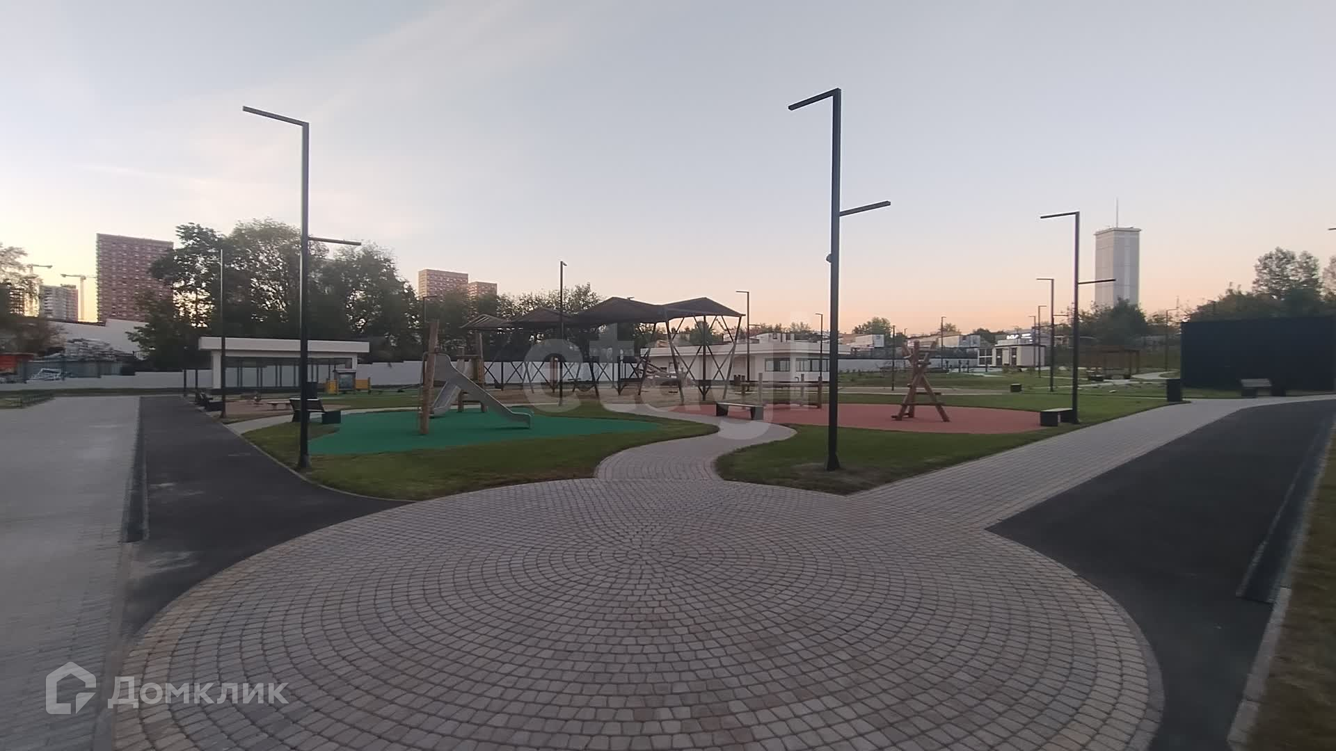 На территории создан благоустроенный ландшафтный двор-парк со спортивными и детскими площадками для разных возрастных групп, беговыми и велодорожками, зоной для занятий йогой и медитации, площадками для отдыха с беседкой, качелями и лежаками.