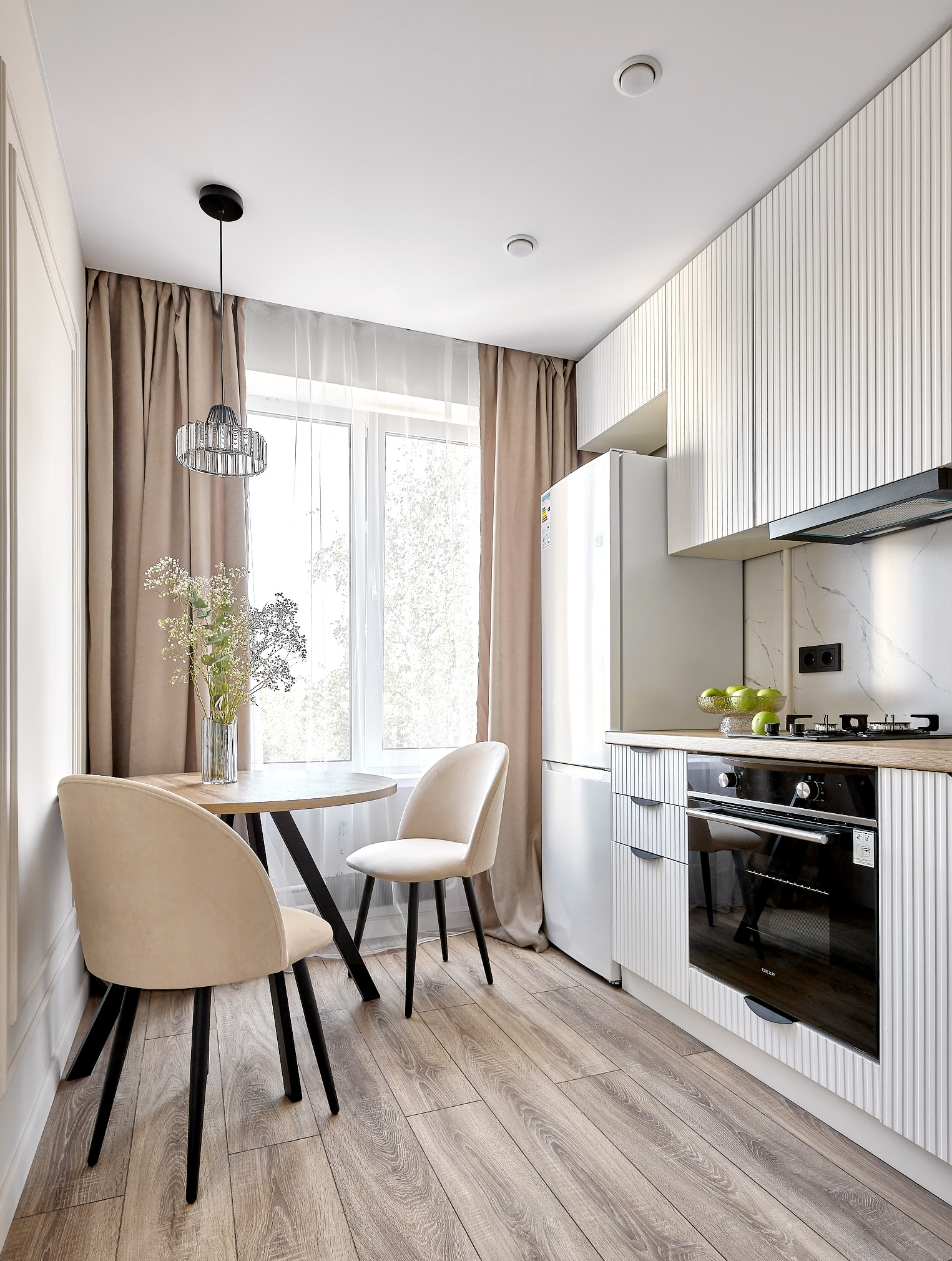 кухня  укомплектована современной техникой: посудомойка, варочная панель, духовой шкаф, холодильник, вытяжка.