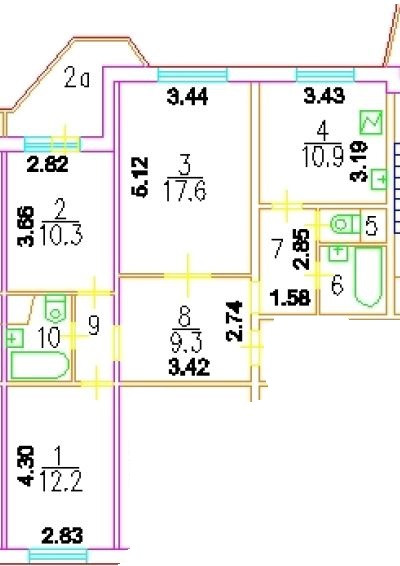 Комнаты - 17,6 + 12,2 + 10,3 = 40,1 кв.м.