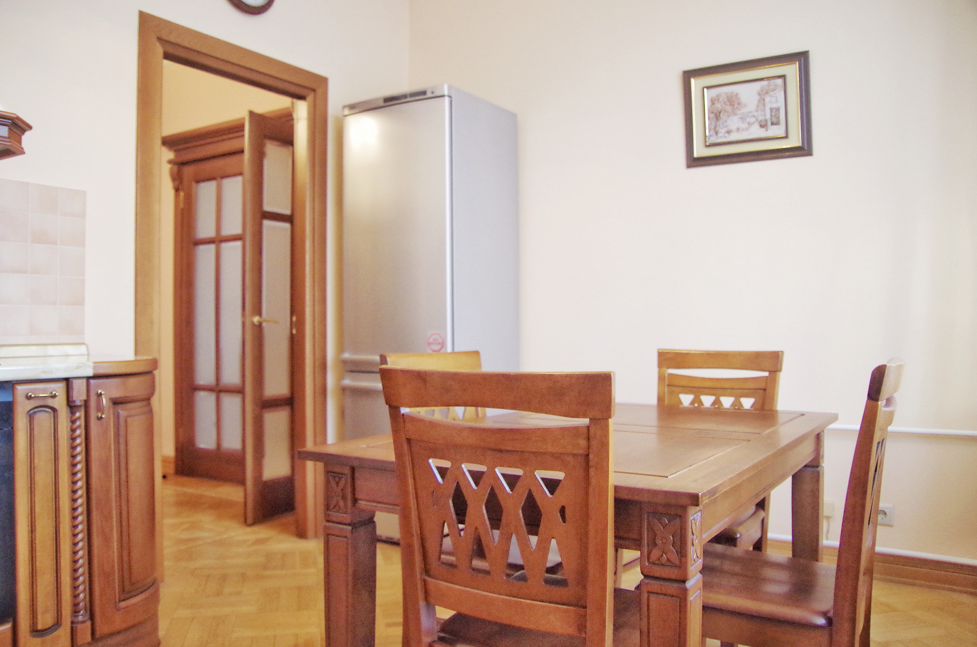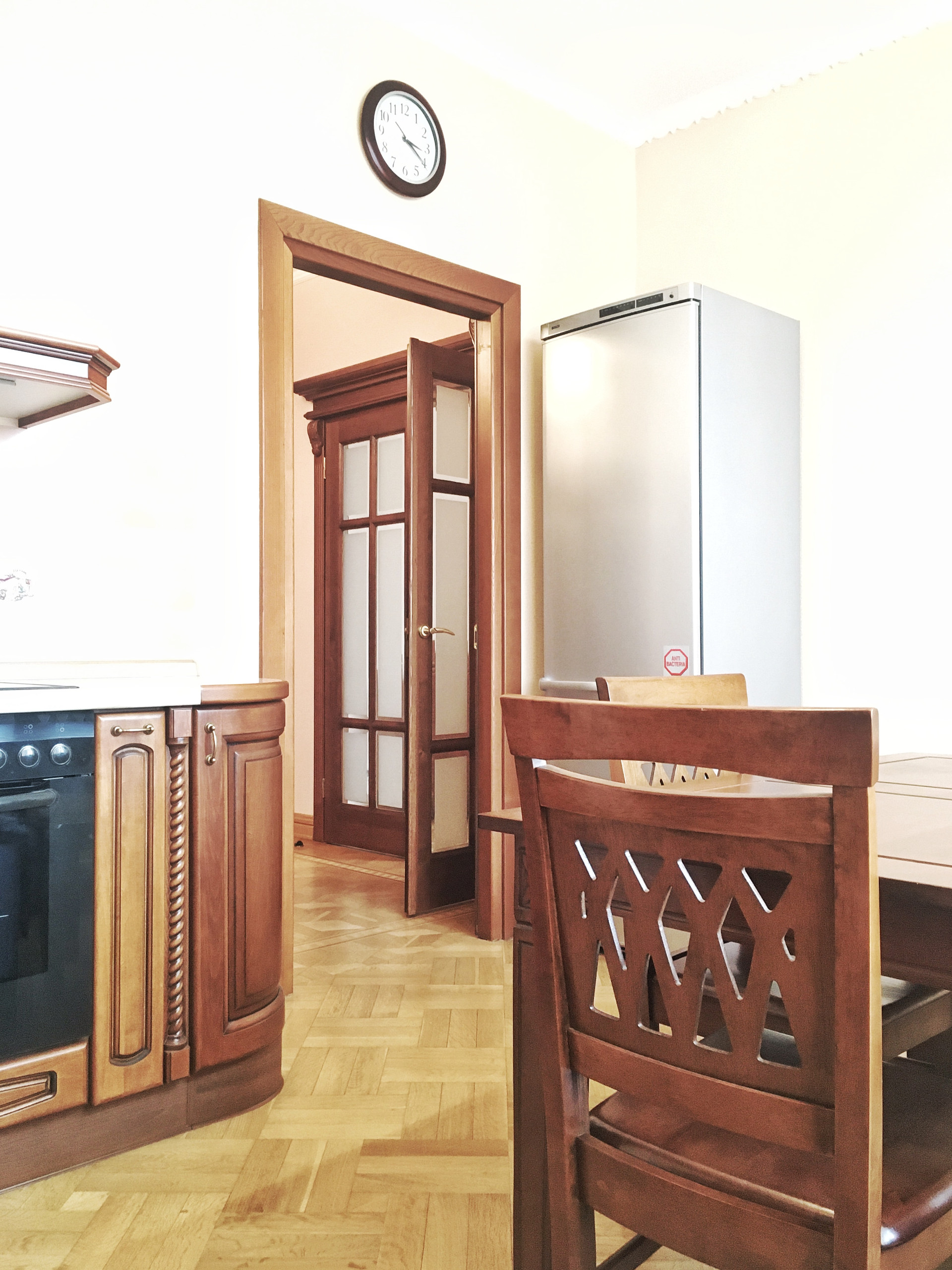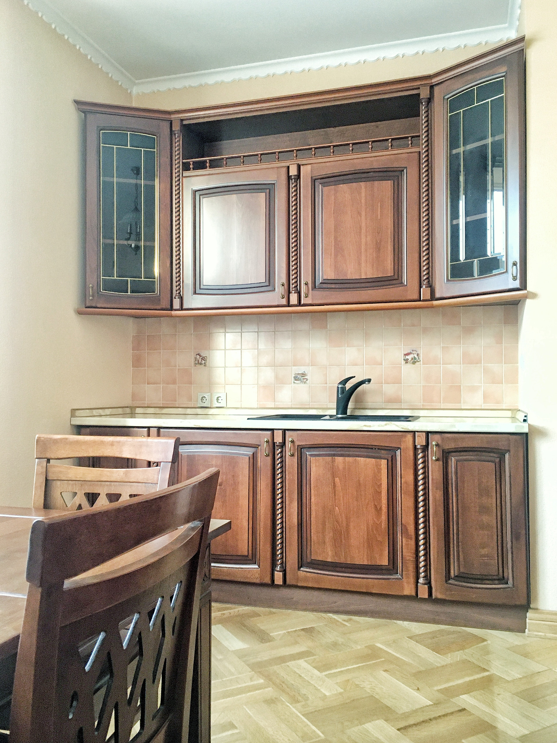 Встроенная кухня с техникой и мебелью (обеденный стол и стулья) остается.
