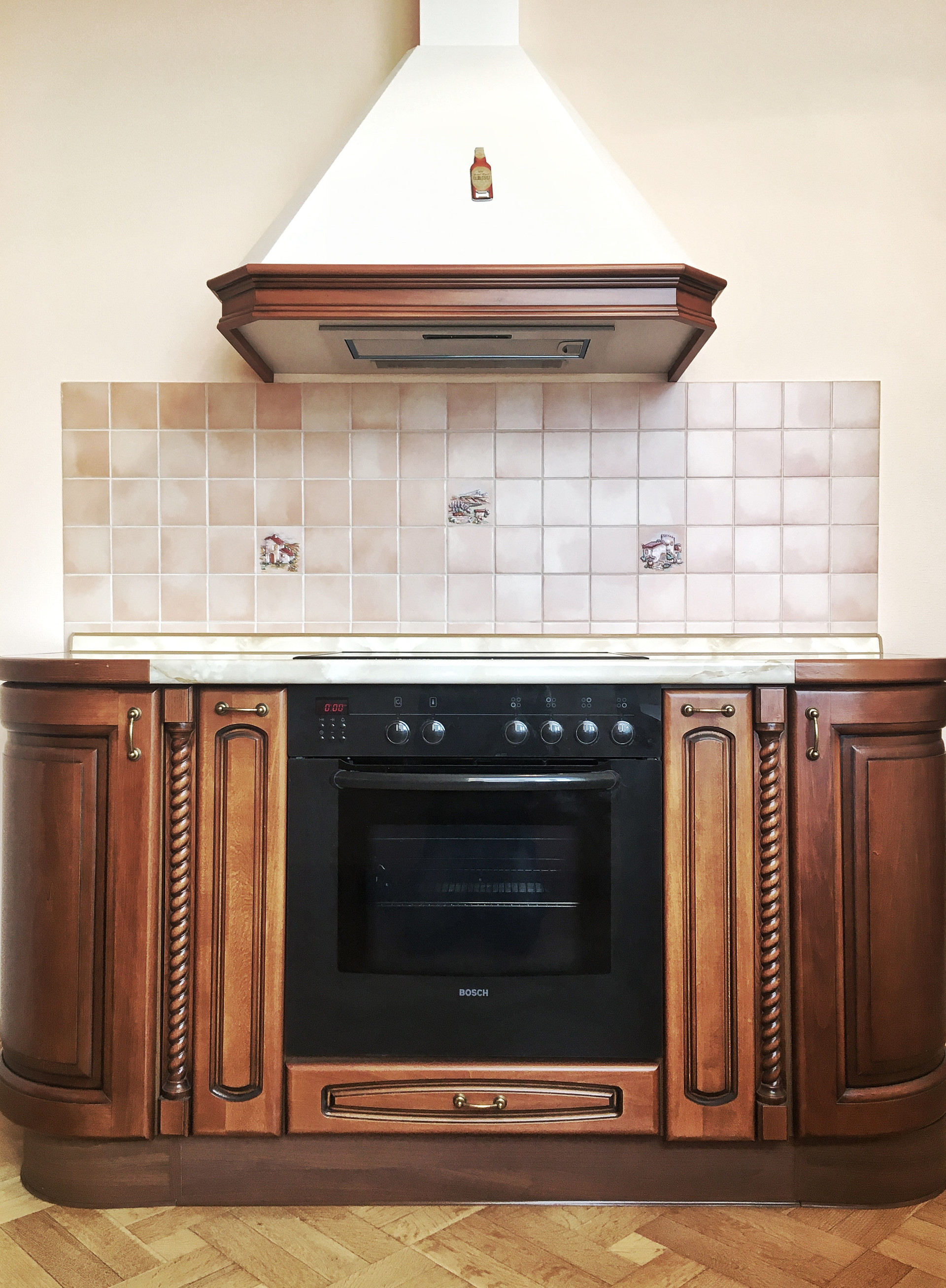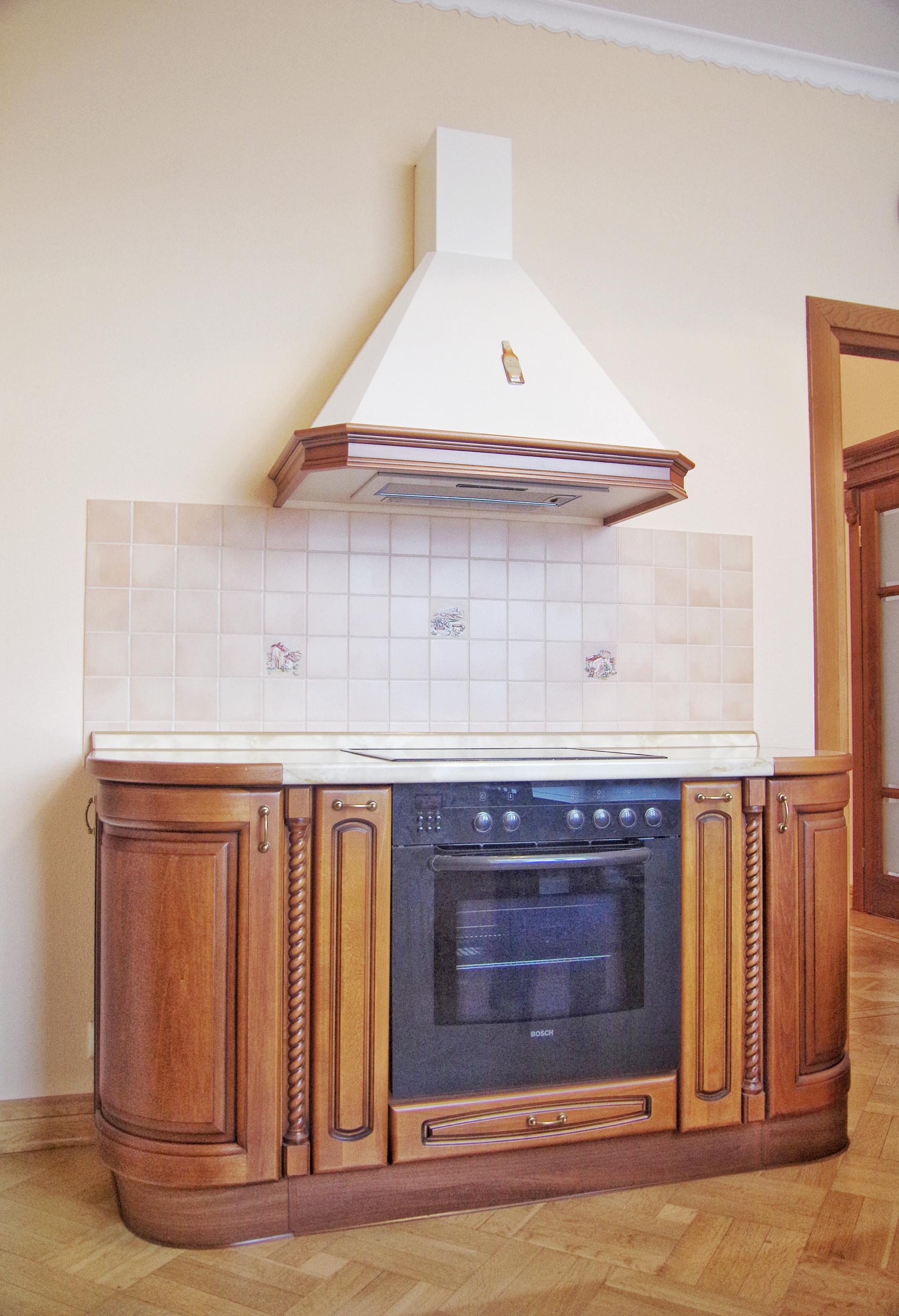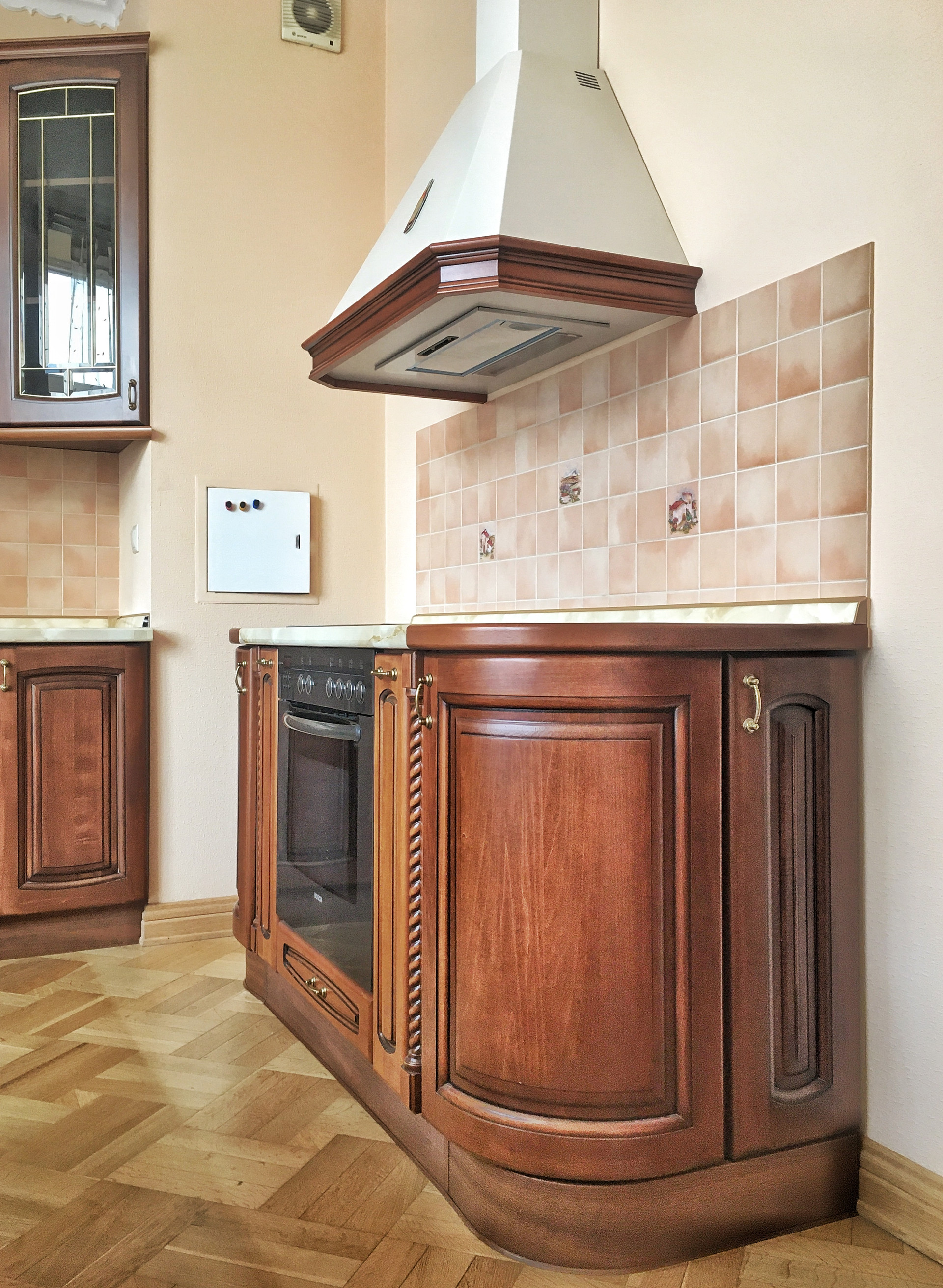 Встроенная кухня с техникой и мебелью (обеденный стол и стулья) остается.