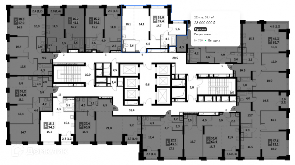 2-комнатная квартира, 59.5 м2, этаж 14 / 44, на продажу в Москве, Шелепихинская набережная, 40к2