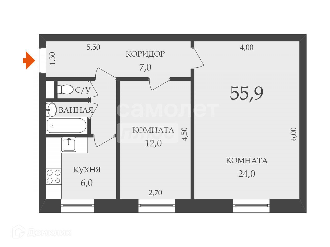 Общая площадь 55.9 м2
