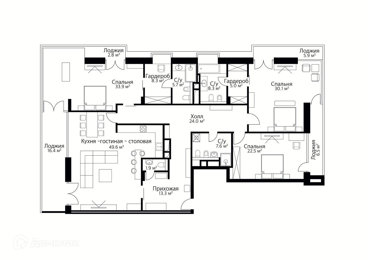 Планировка квартиры предусматривает до 4  спален с гардеробными, просторную гостиную с кухней и обеденной зоной. Это идеальное место для отдыха и приёма гостей. Четыре лоджии и дополняют общую картину, предоставляя дополнительное пространство для релаксации и наслаждения свежим воздухом.