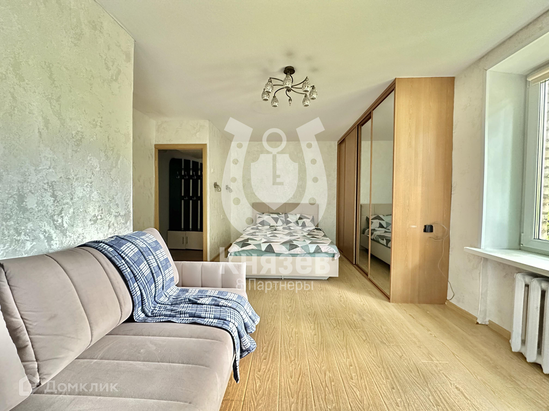 Функциональное планировочное решение располагает: комната 18.8 м2 разделена на спальную и гостевую зону, кухня 6 м2, совмещенный сан/узел, балкон и светлый холл.