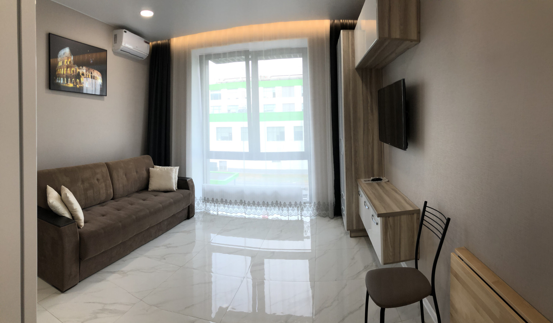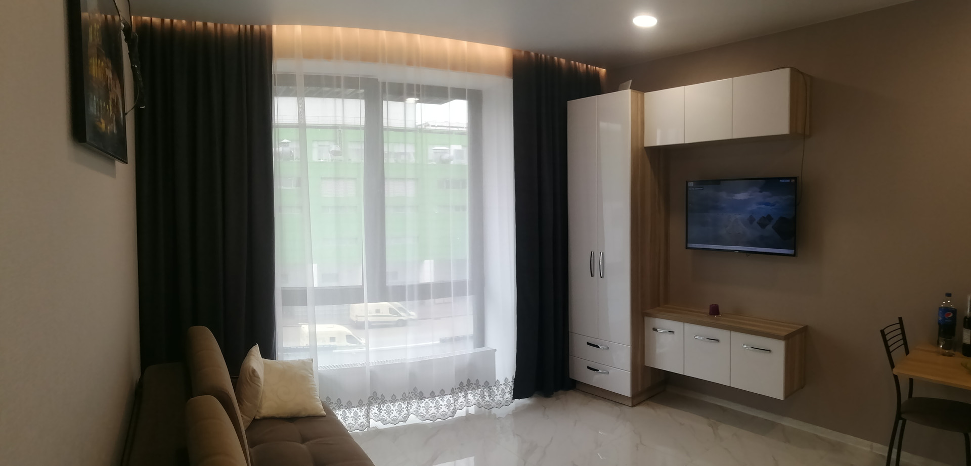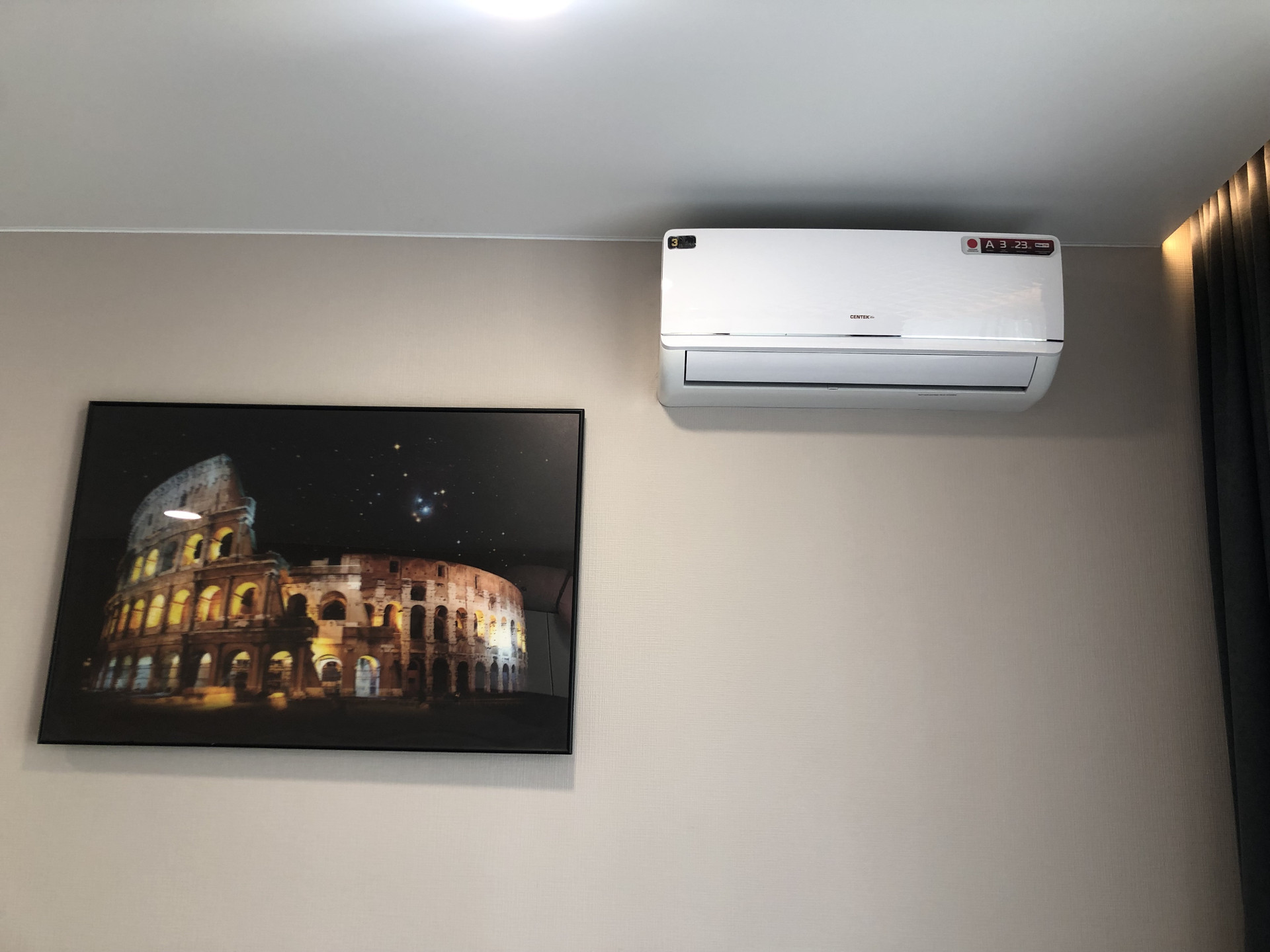 Сделано три сценария освещения – 1. основной, 2. подсветка штор и ночное освещение – светящаяся картина «Колизей».