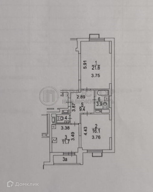 Площадь квартиры составляет 64.3 кв.м, комнаты распашные: 21.6 и 16.3 кв.м.