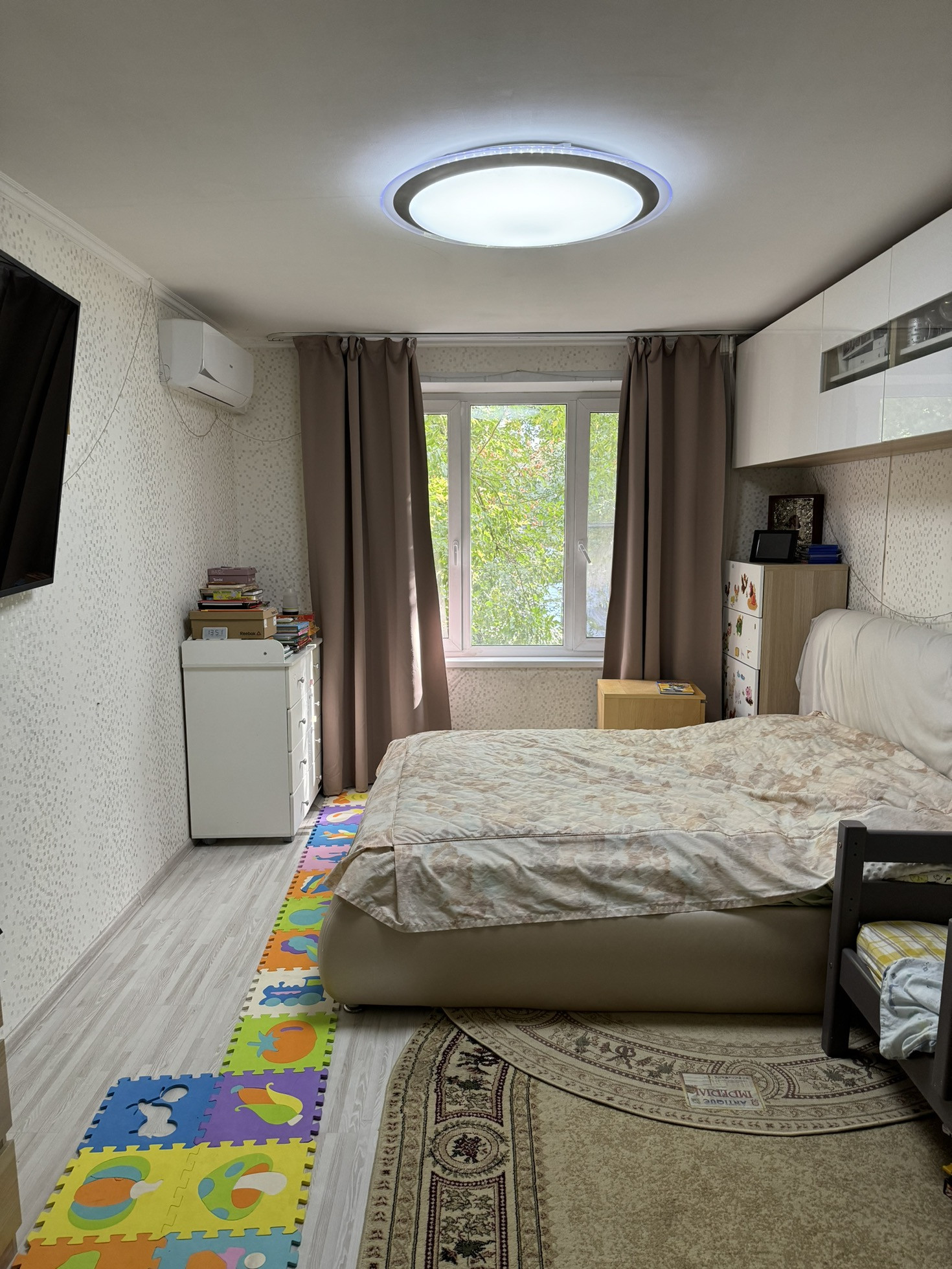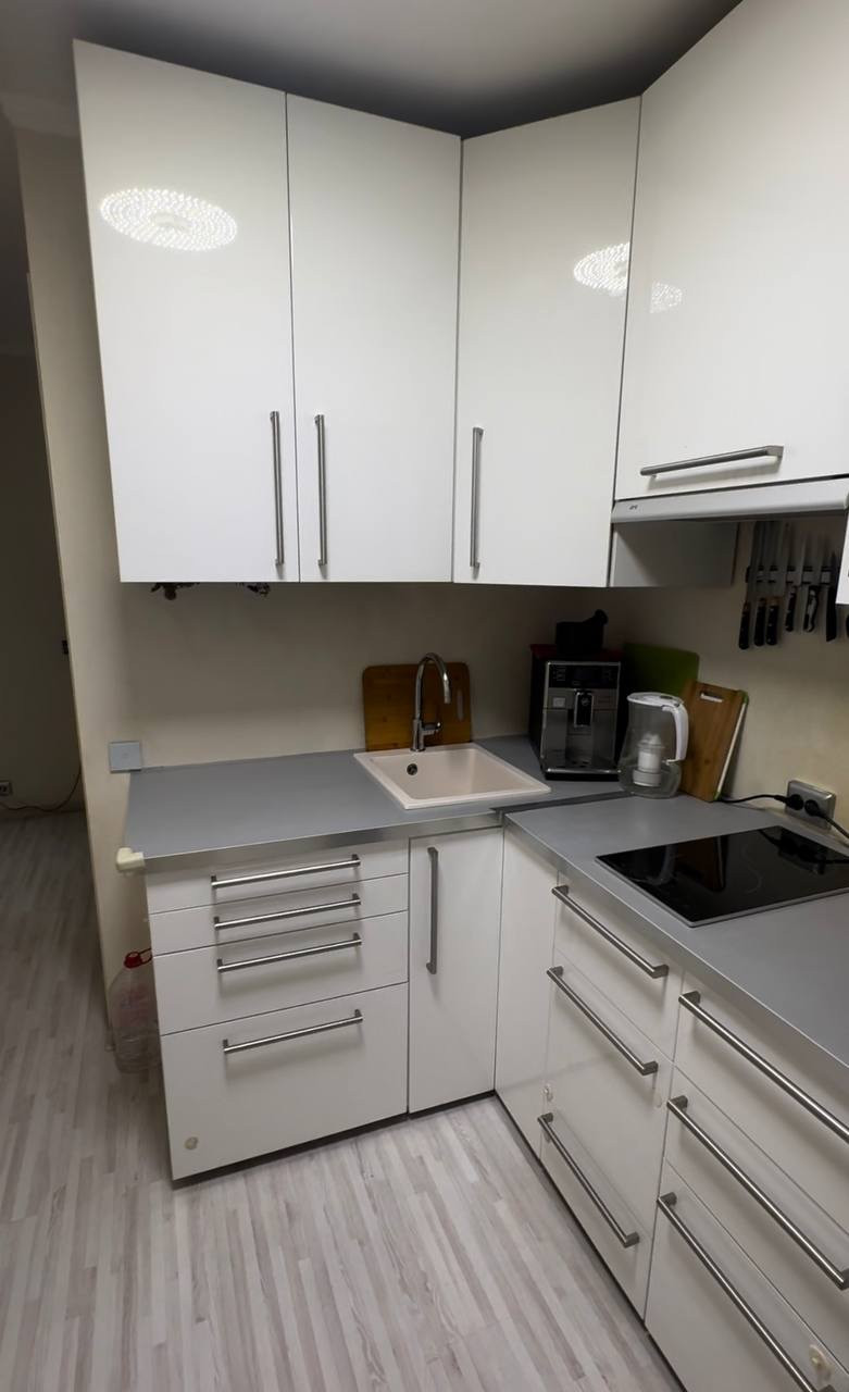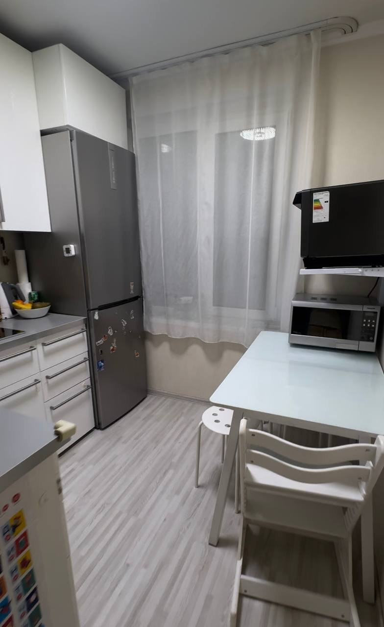 В квартире проводка и коммуникации заменены. Окна пластиковые. Мебель можем оставить в подарок, холодильник и плиту тоже; кухня Икеа с плавными доводчиками. Теплая, зимой даже не включаем батареи.