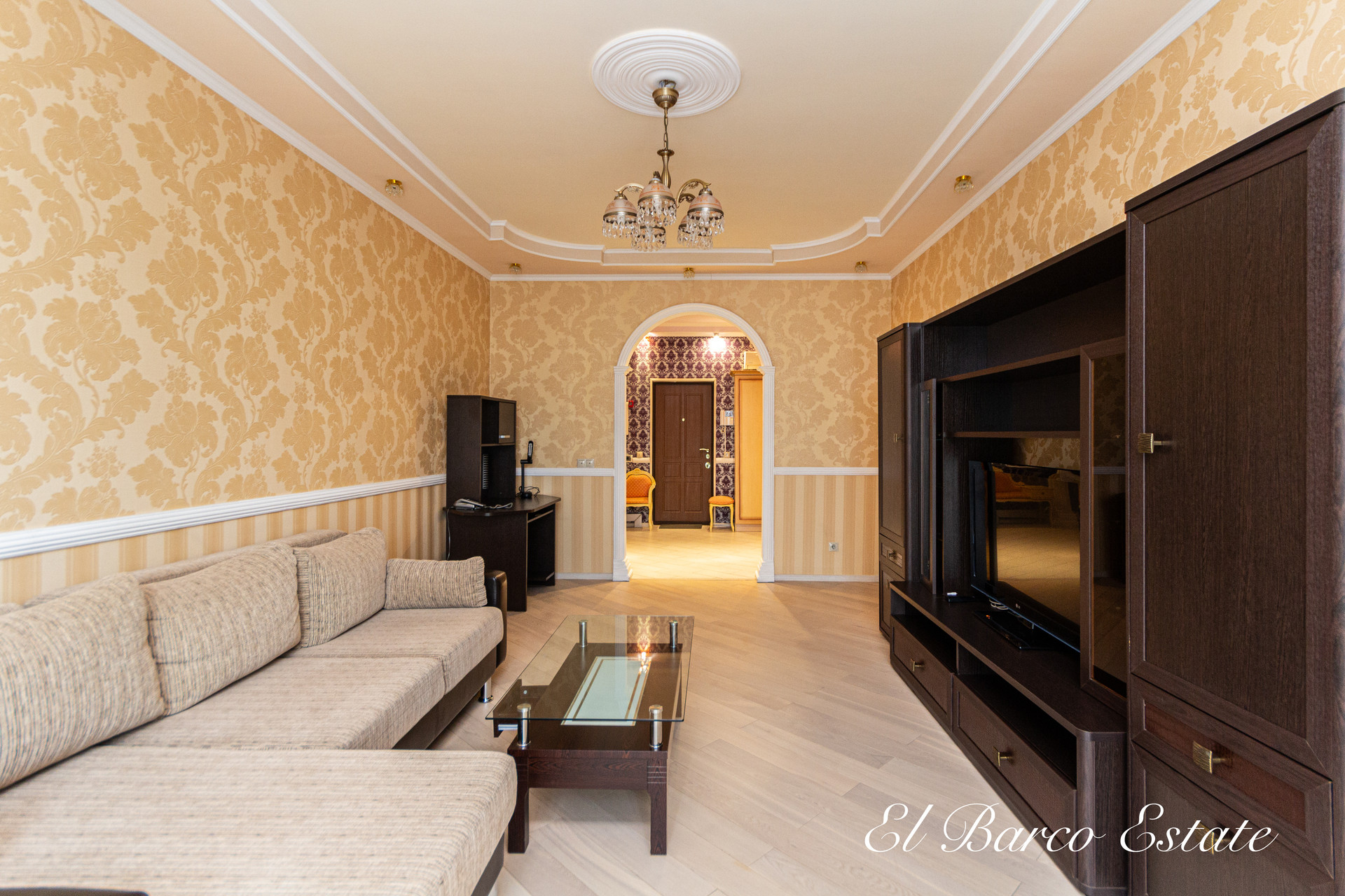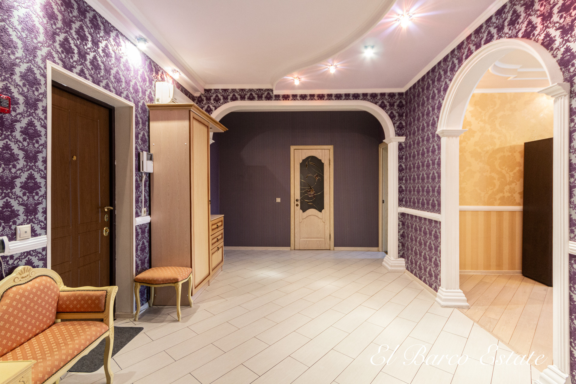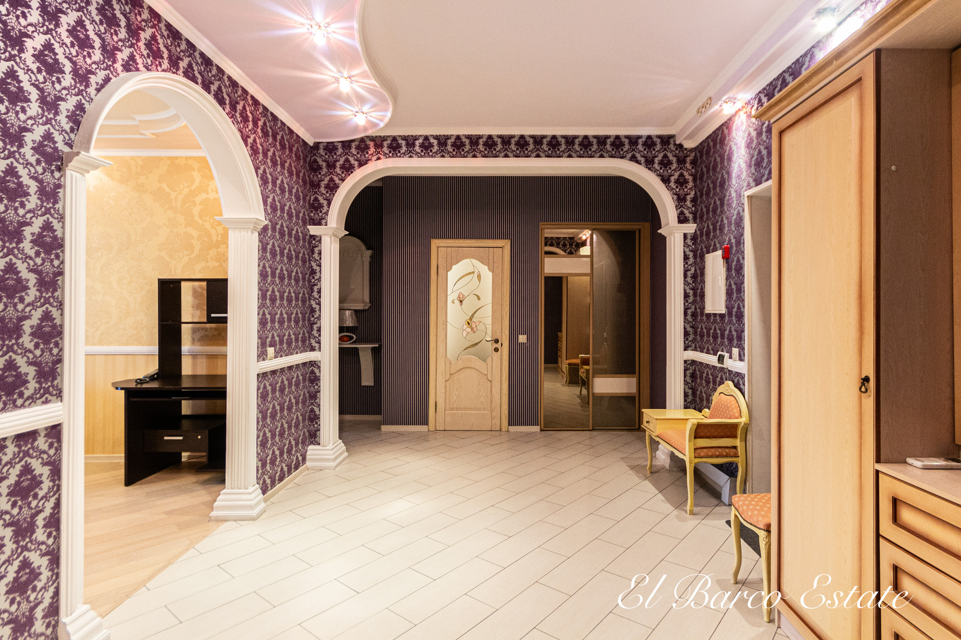 В квартире выполнен ремонт из качественных материалов: колонны из натурального гипса, паркетная доска, плитка Versace, заменены стеклопакеты, а также входная дверь.