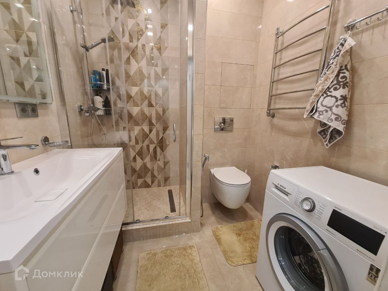 Санузел в современном стиле оборудован всем необходимым: удобная встроенная душевая кабина с тропическим душем, стиральная машина Bosch, полотенцесушитель и проточный водонагреватель облегчат повседневную жизнь.
