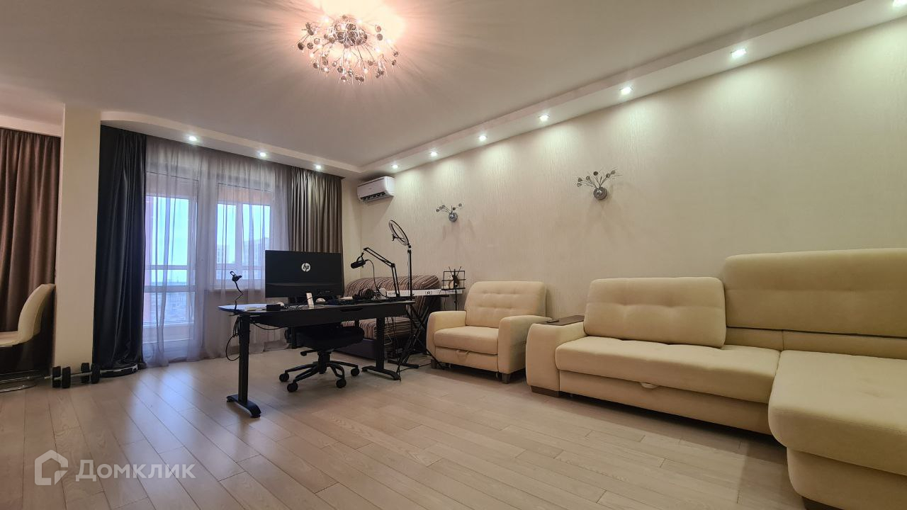 Жилое пространство выполнено в приятном дизайне светлых тонов из качественных материалов: пол из инженерной доски, стильная настенная панель с нишей под телевизор, обои с шелковым панно. В комнате установлены кондиционер Isimitsu и комплект мягкой мебели от известной фабрики 8 марта. Подчеркивает стиль интерьера двухуровневая подсветка с двойным светом и высокими потолками в 2,75 метра!