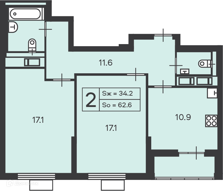 Общая площадь 62.6 м2